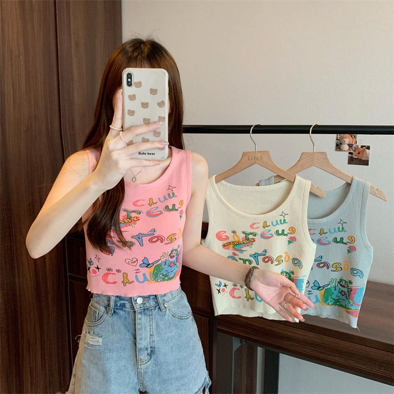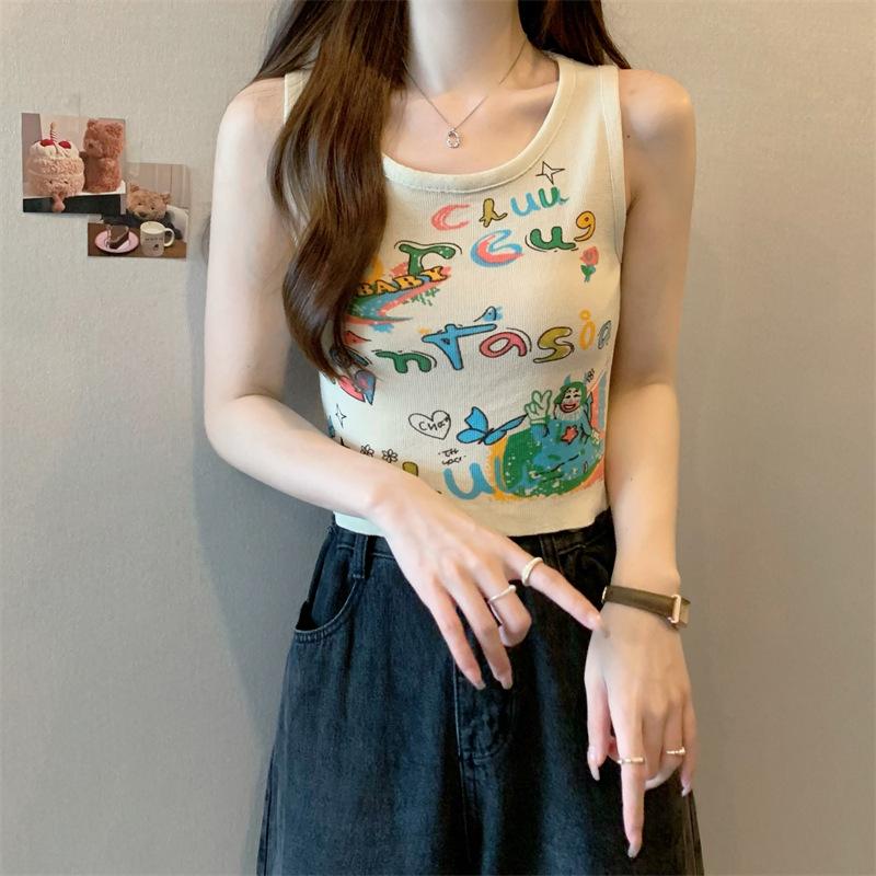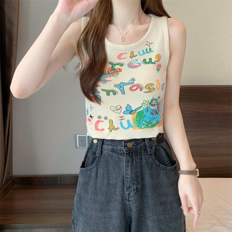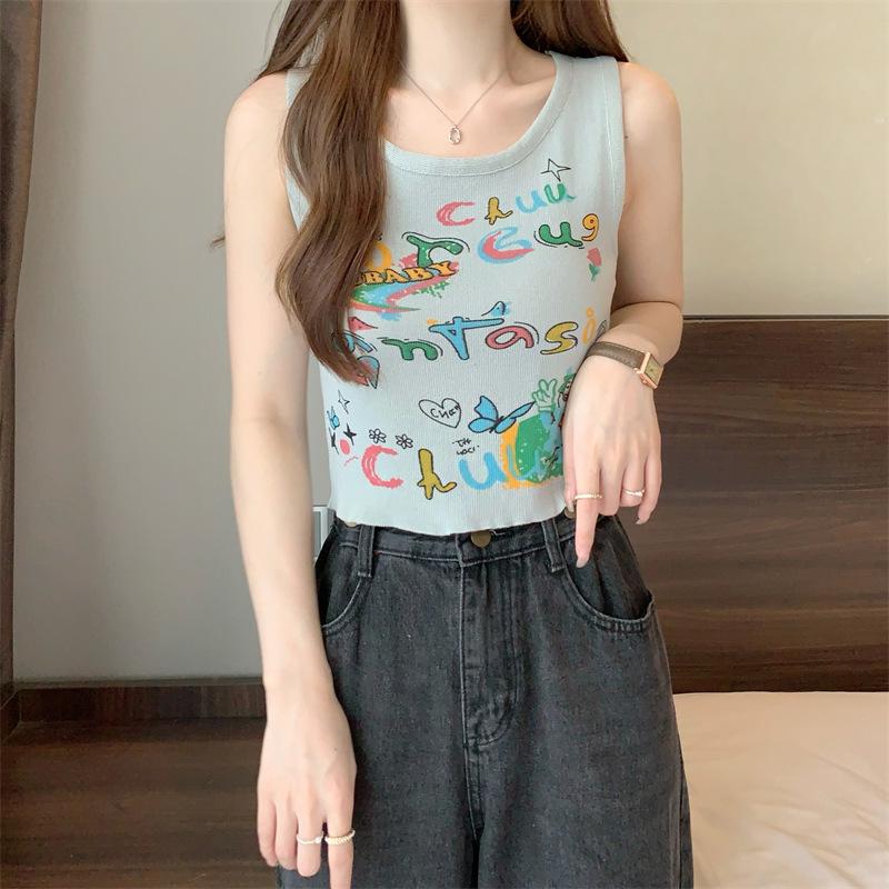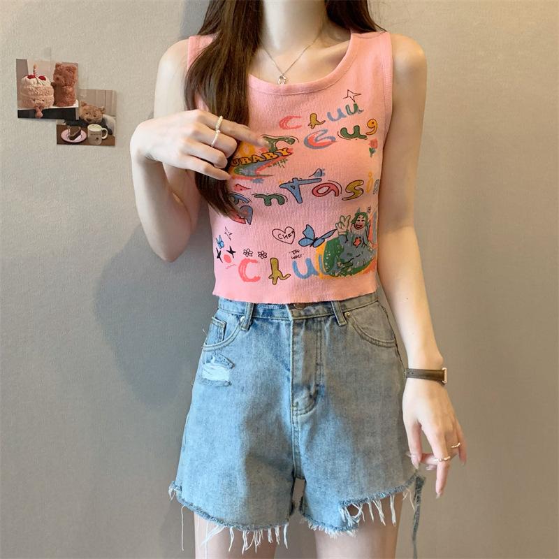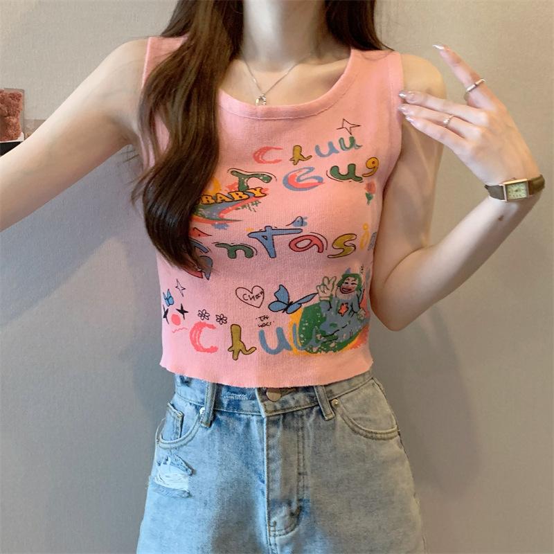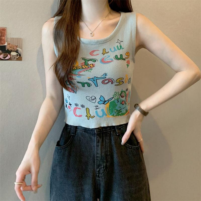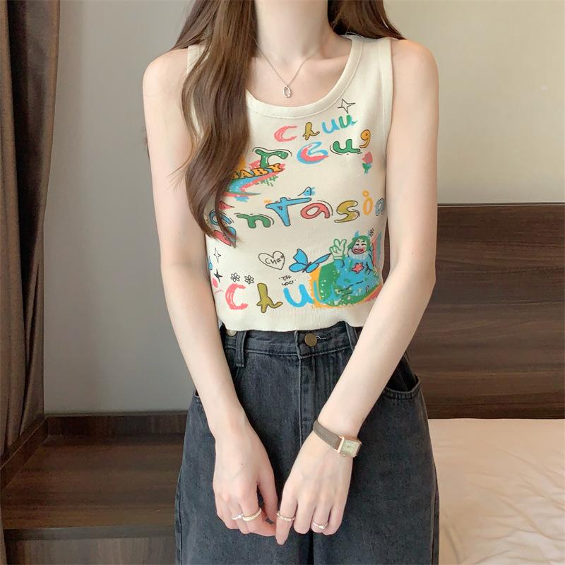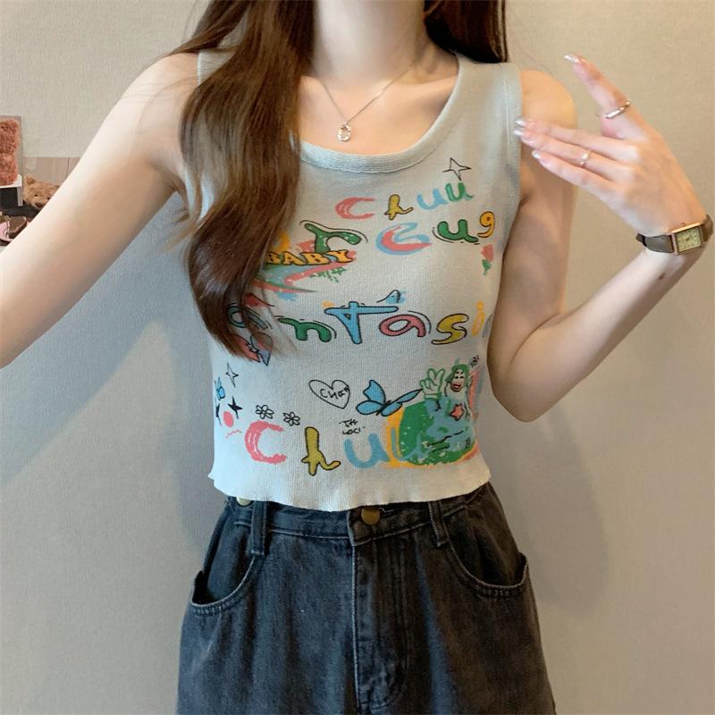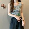 Chaleco pequeño retro de estilo americano para mujer, prenda exterior elegante, estampada, entallada, adelgazante, sin mangas, de punto, novedad de verano