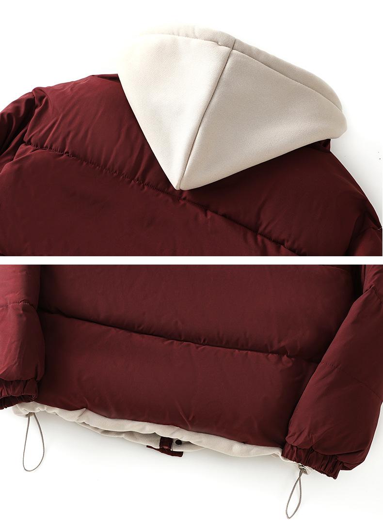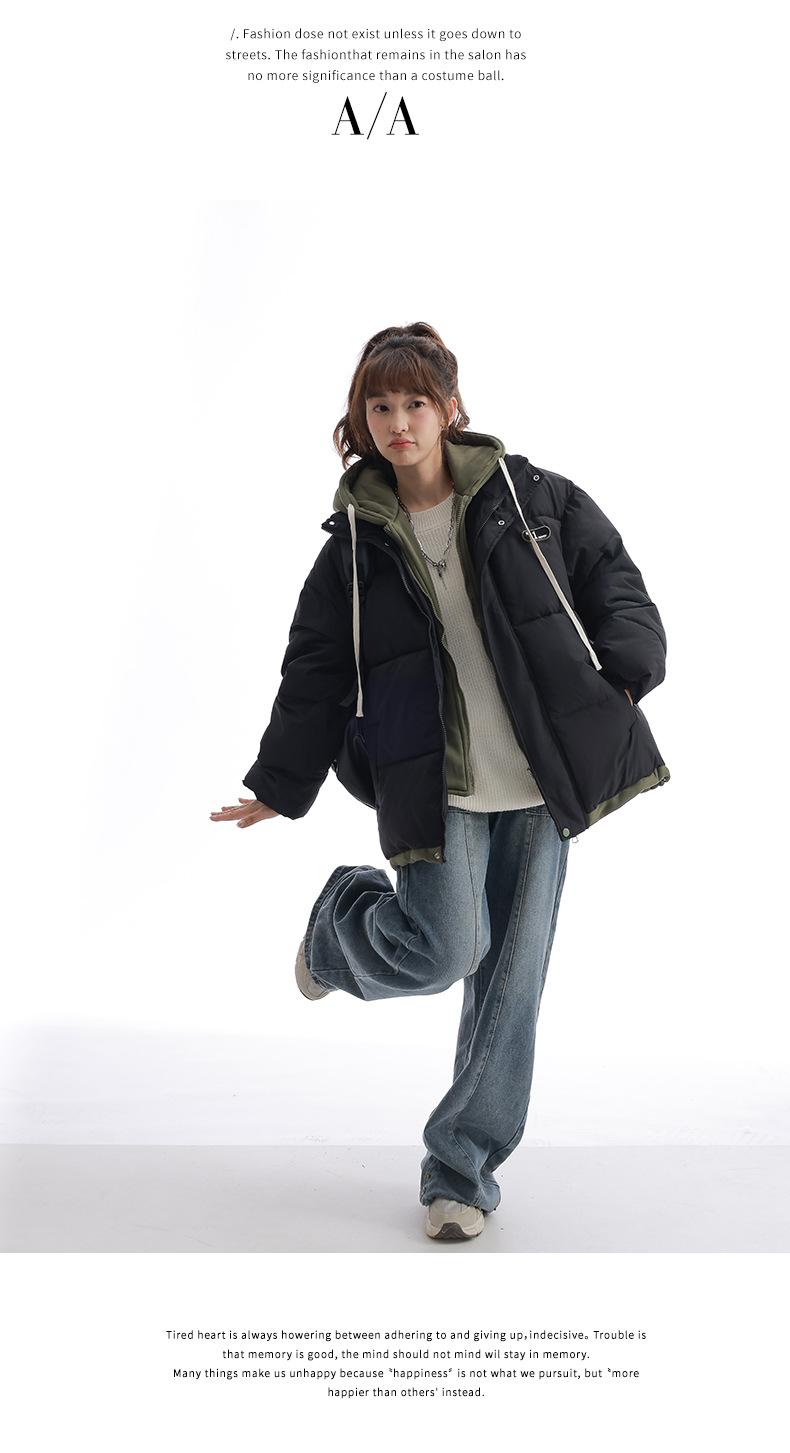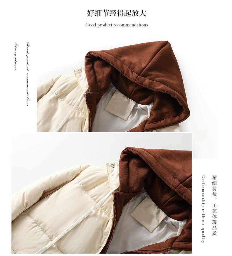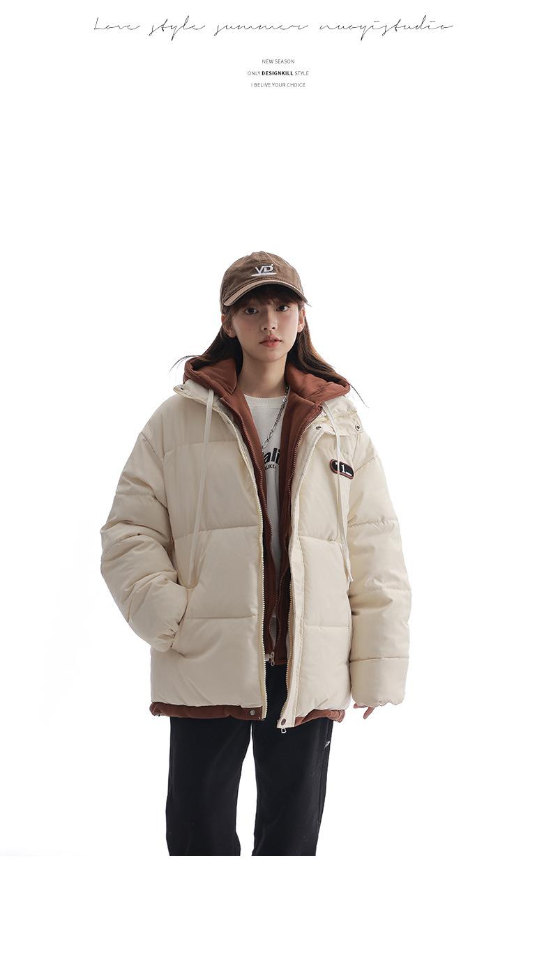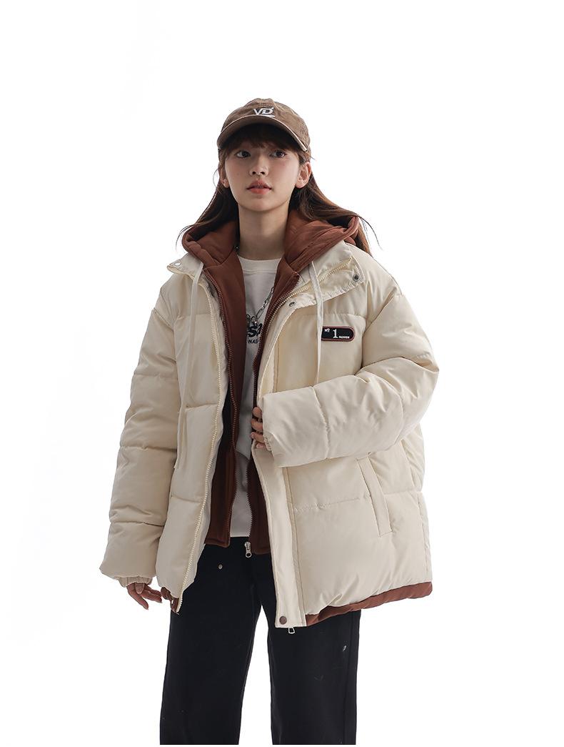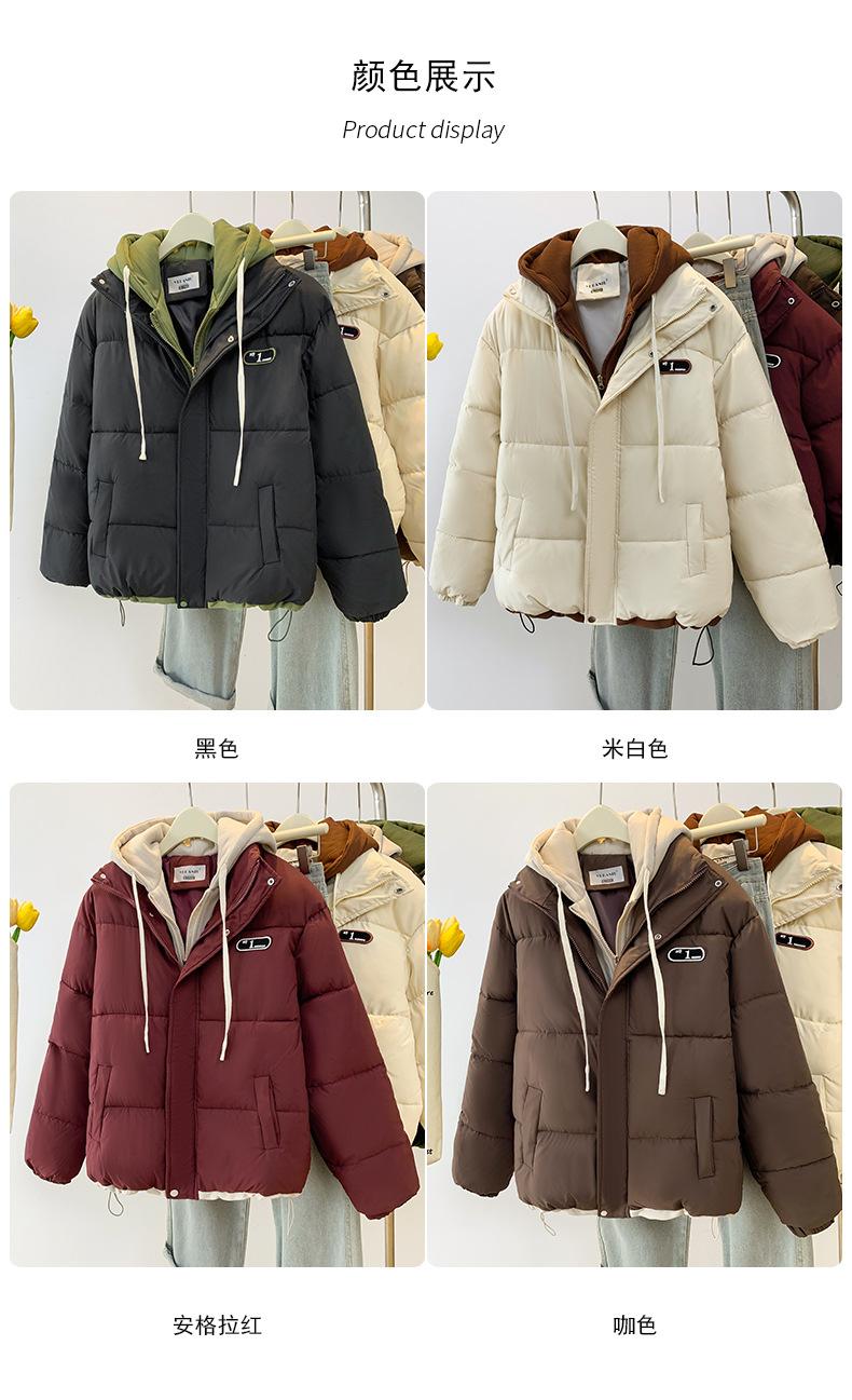 Chaqueta acolchada de algodón con capucha de dos piezas, falsa, transfronteriza, para mujer, corta, de invierno, con costuras sueltas y contraste, 2024