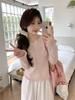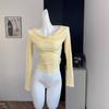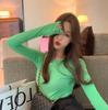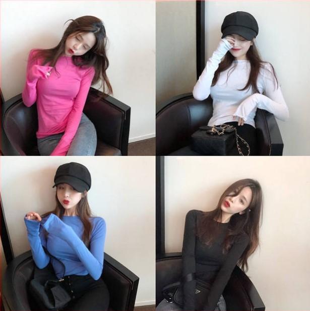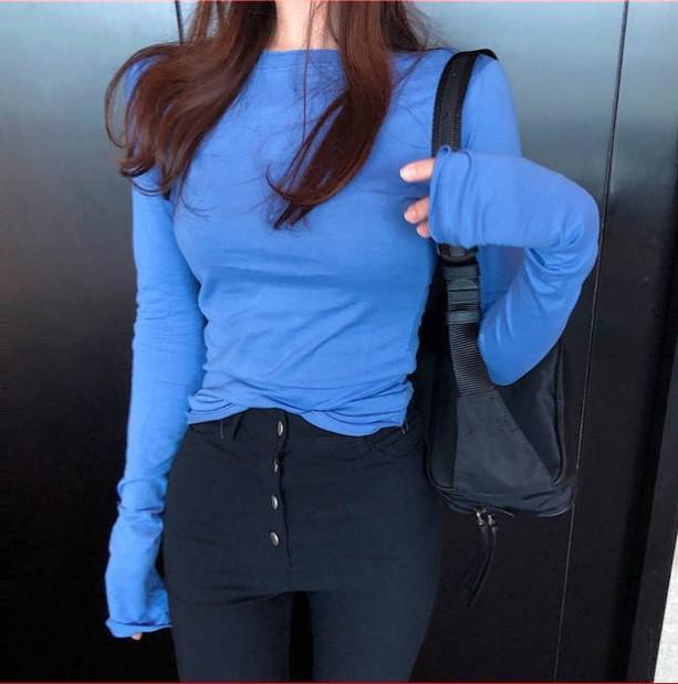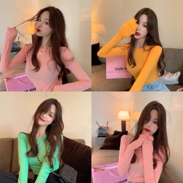 Top chic estilo coreano de manga abullonada con corte entallado básico para combinar con todo. Camiseta de manga larga ajustada. Otoño para mujer S1253 T color caramelo