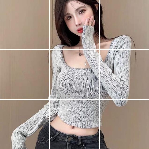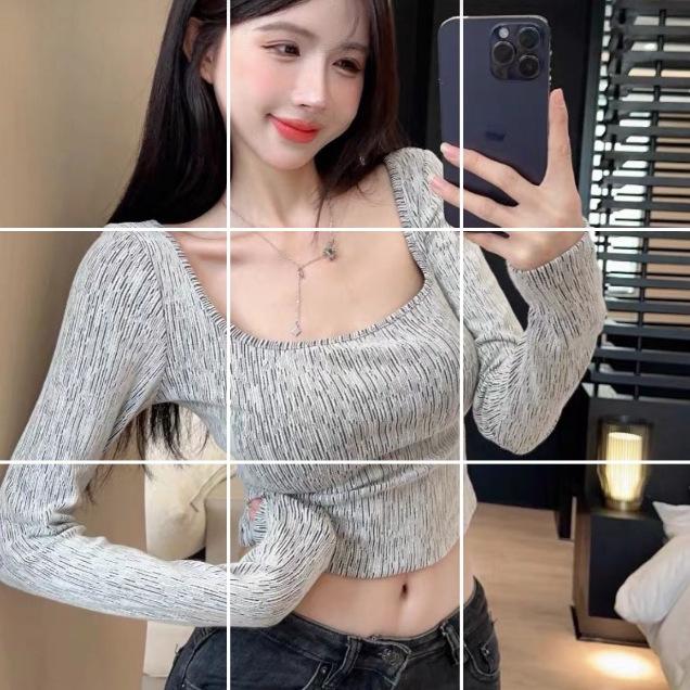 Otoño Estilo Retro Sexy Estampado Cuello U Ajustado Camiseta Base Top Manga Larga Mujer 5456