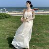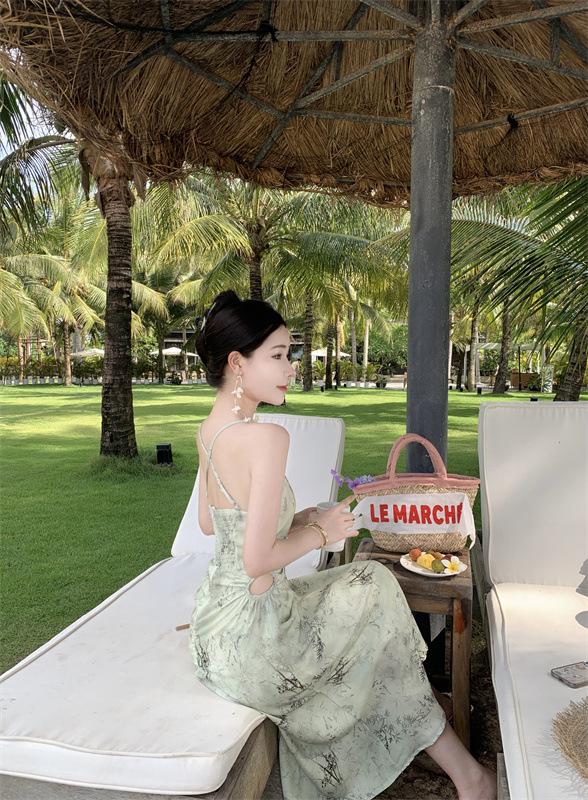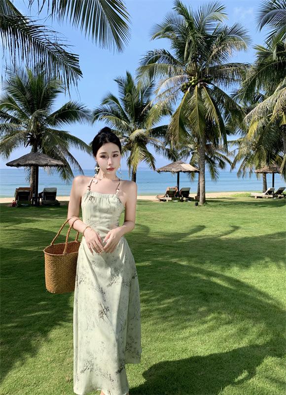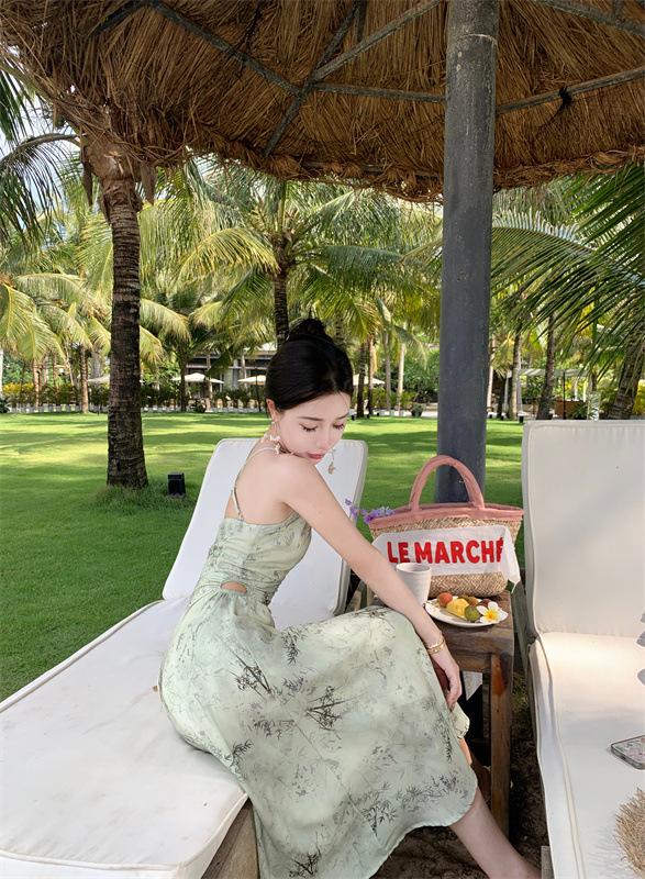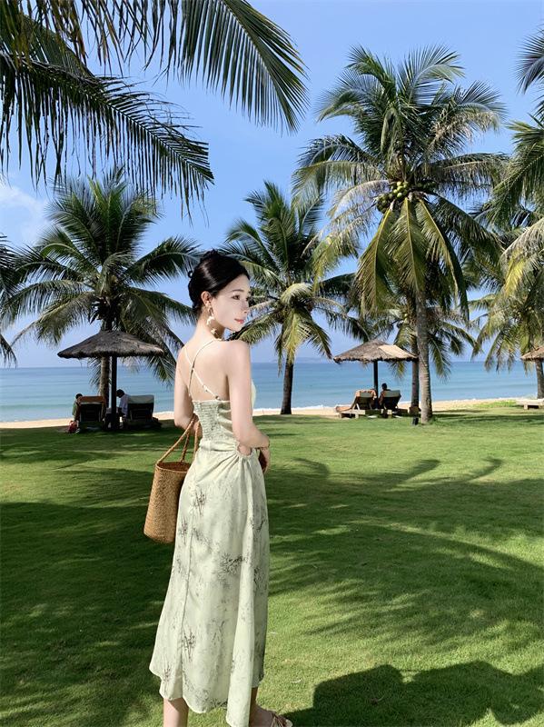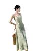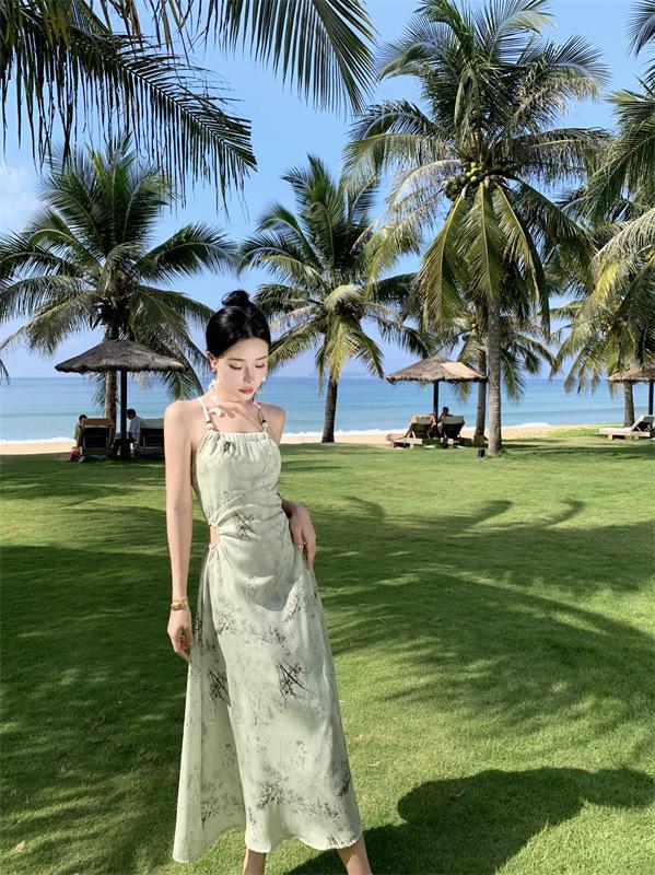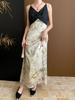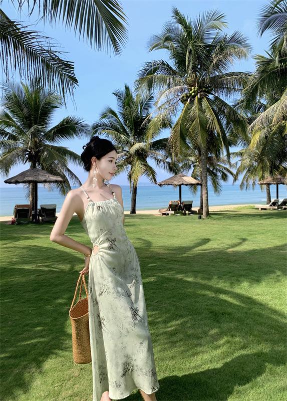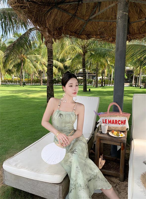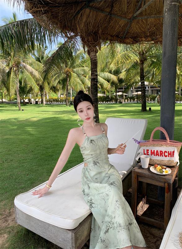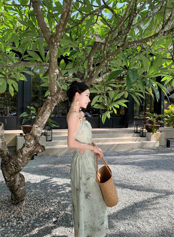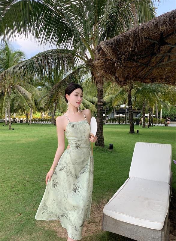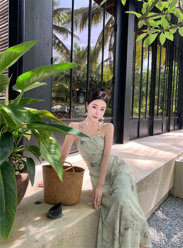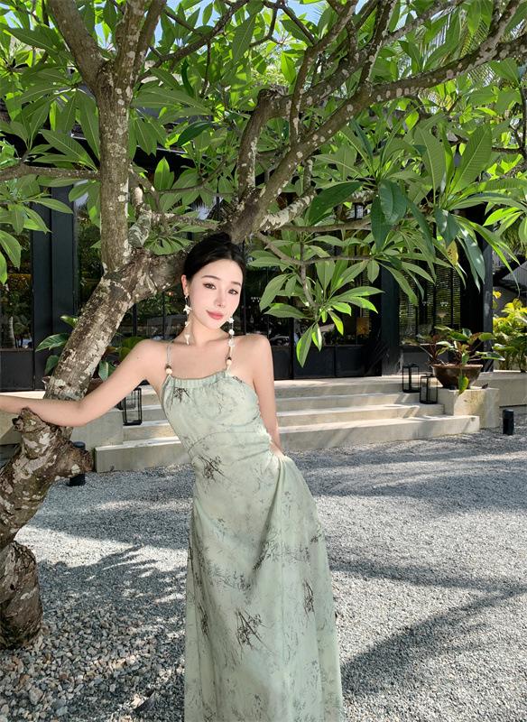 Foto Real de Nuevo Vestido de Tirantes con Estampado de Tinta Chinoiserie 2024 Vestido Elegante Zen de Estilo Nacional Revelador de Cintura Vestido Largo de Vacaciones