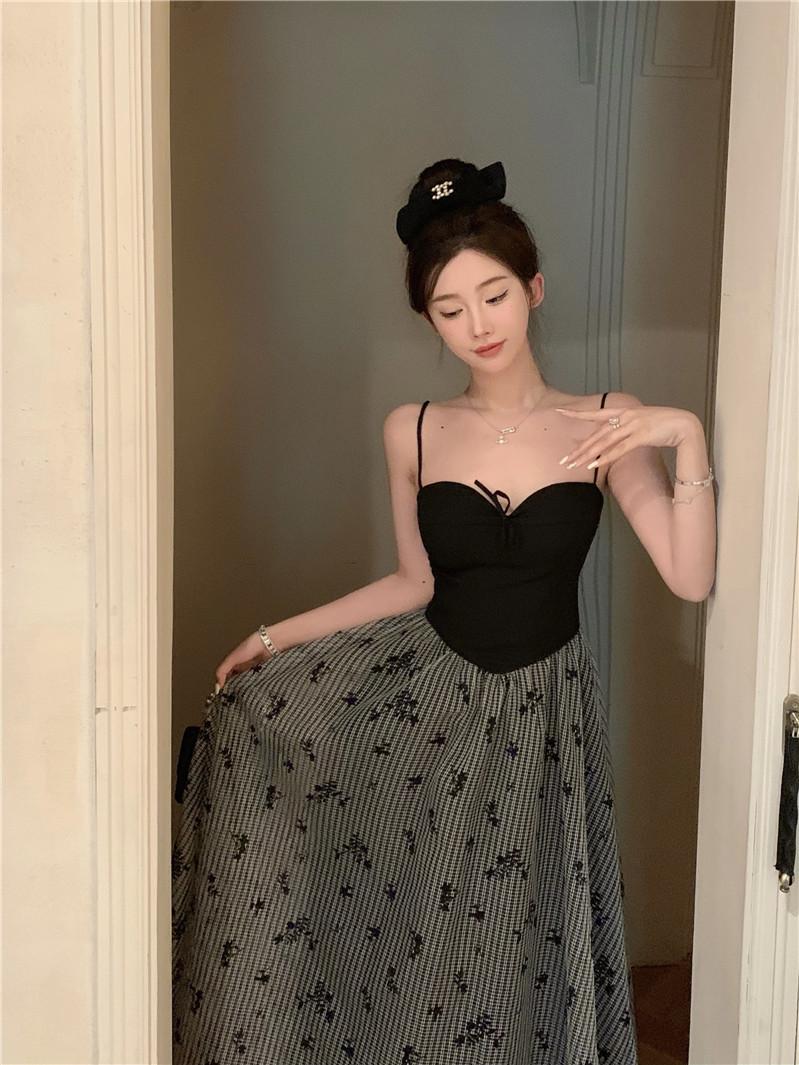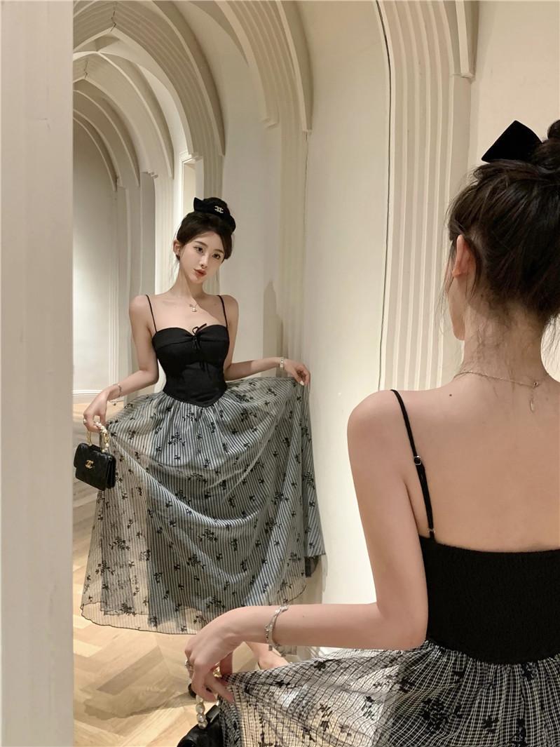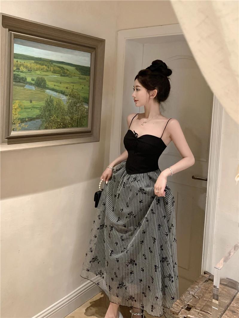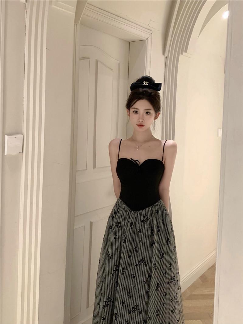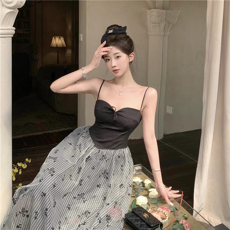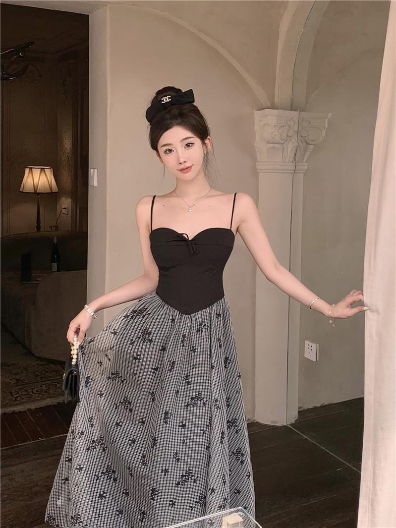 Foto Real de Vestido Floral Retro Francés Estilo Hepburn con Tirantes Verano 2025 Look Adelgazante Estilo Lujuria Pura Vacaciones Falda Larga