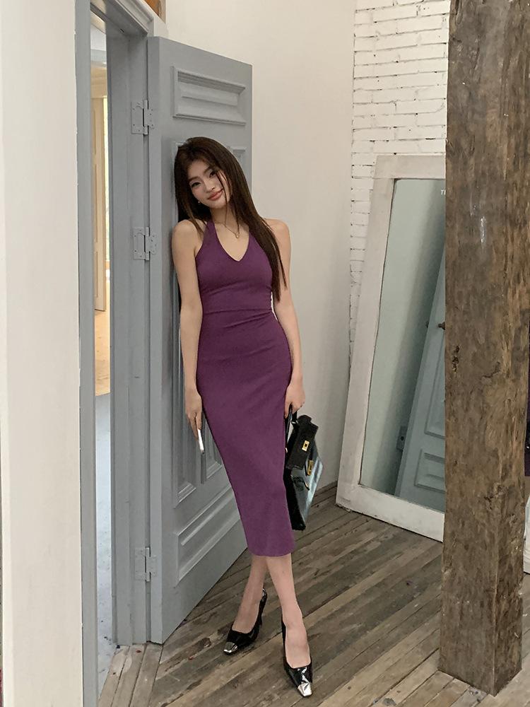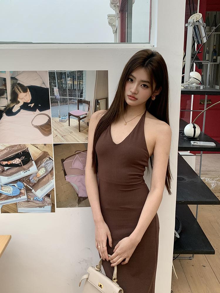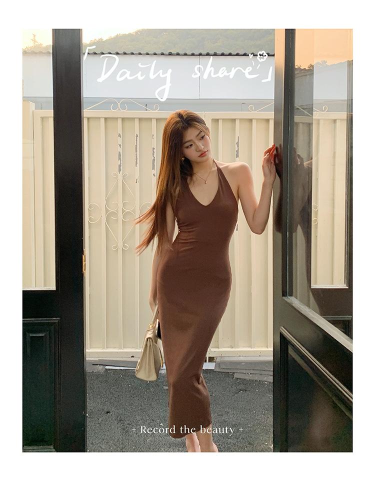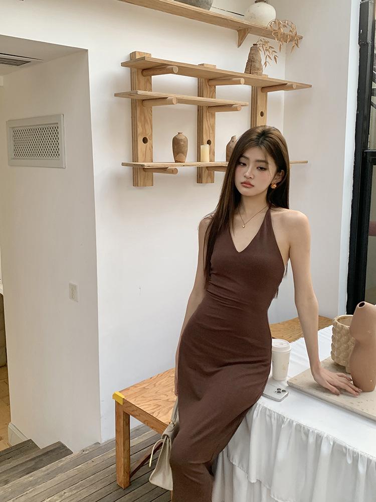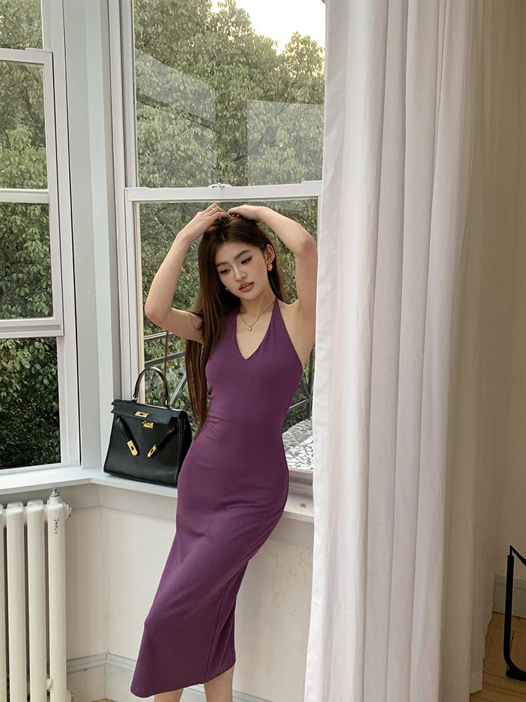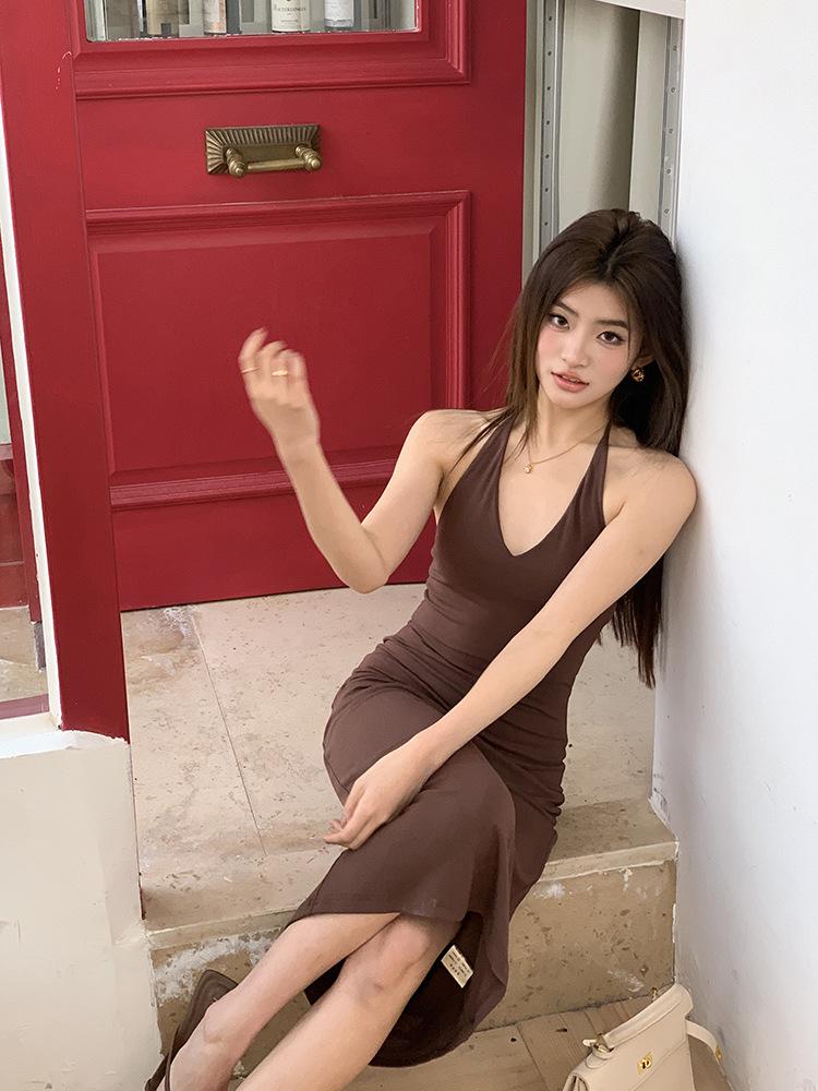 Vestido de verano de alta calidad, nuevo estilo francés con escote en V, estilo halter, diseño adelgazante, para mujer, vestido de longitud media