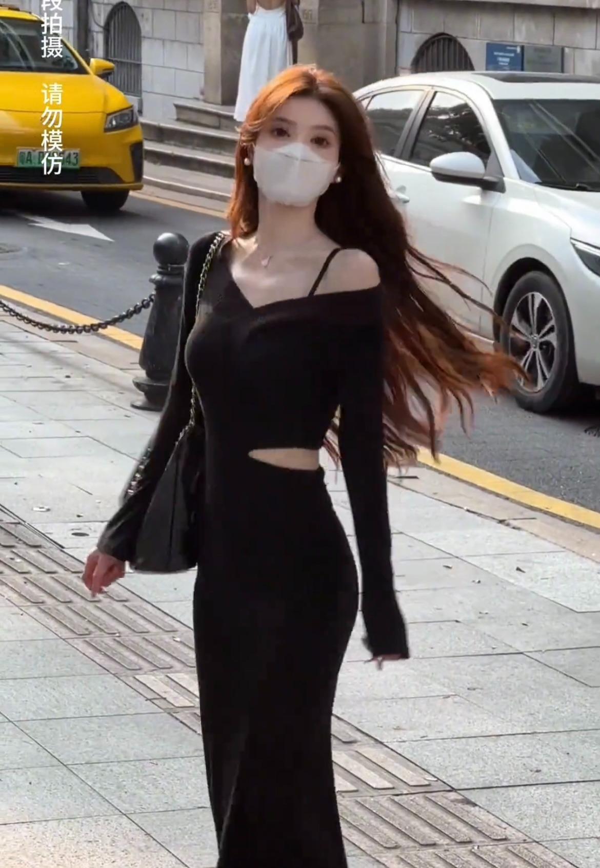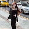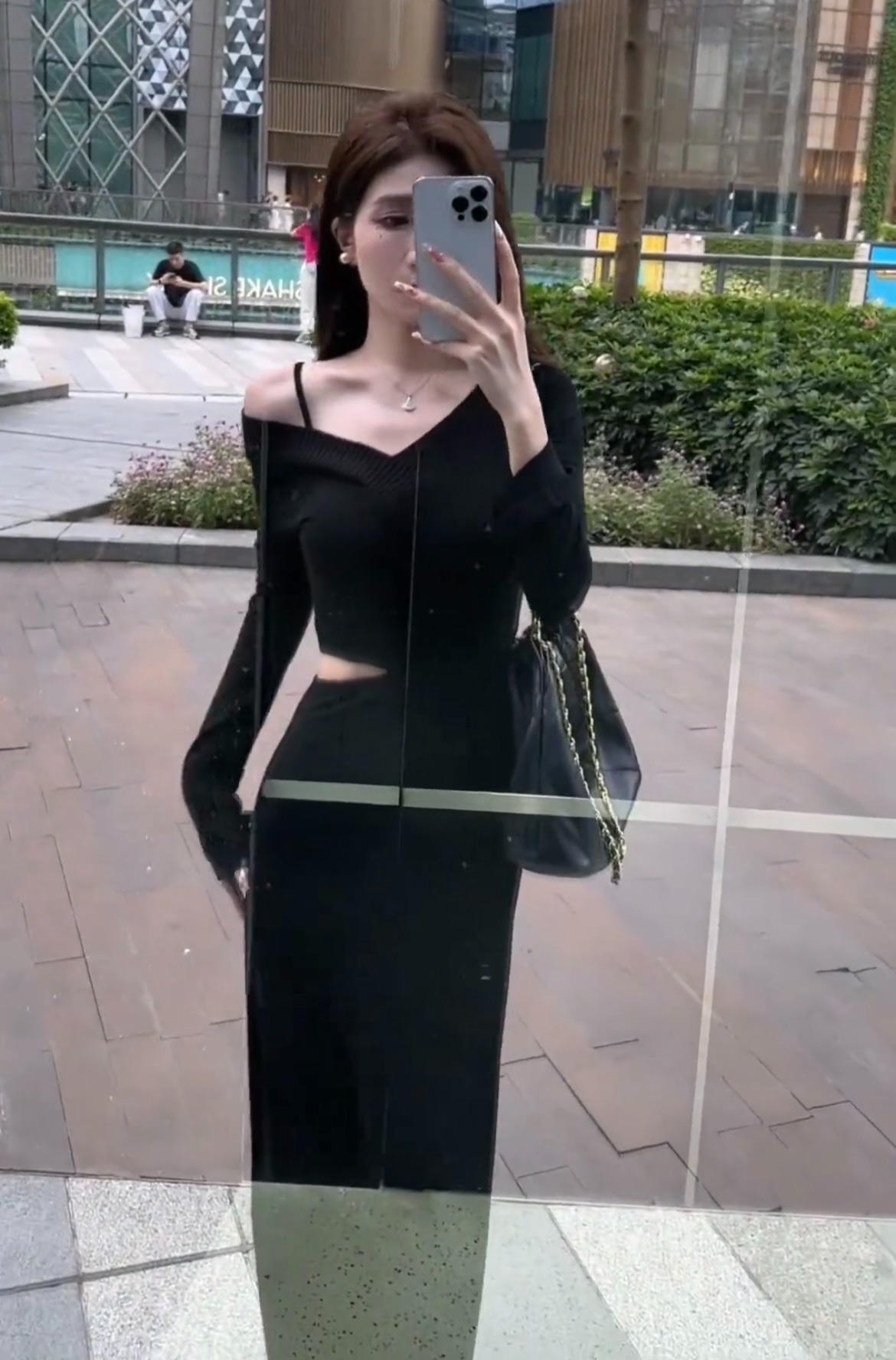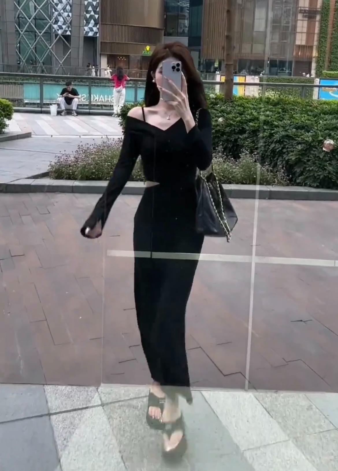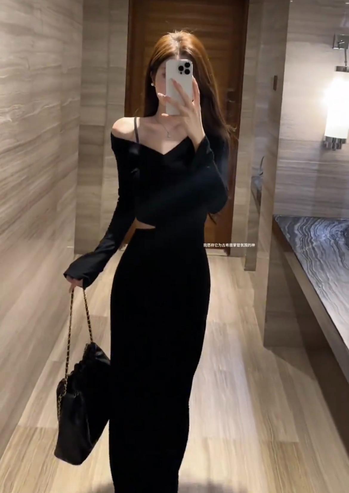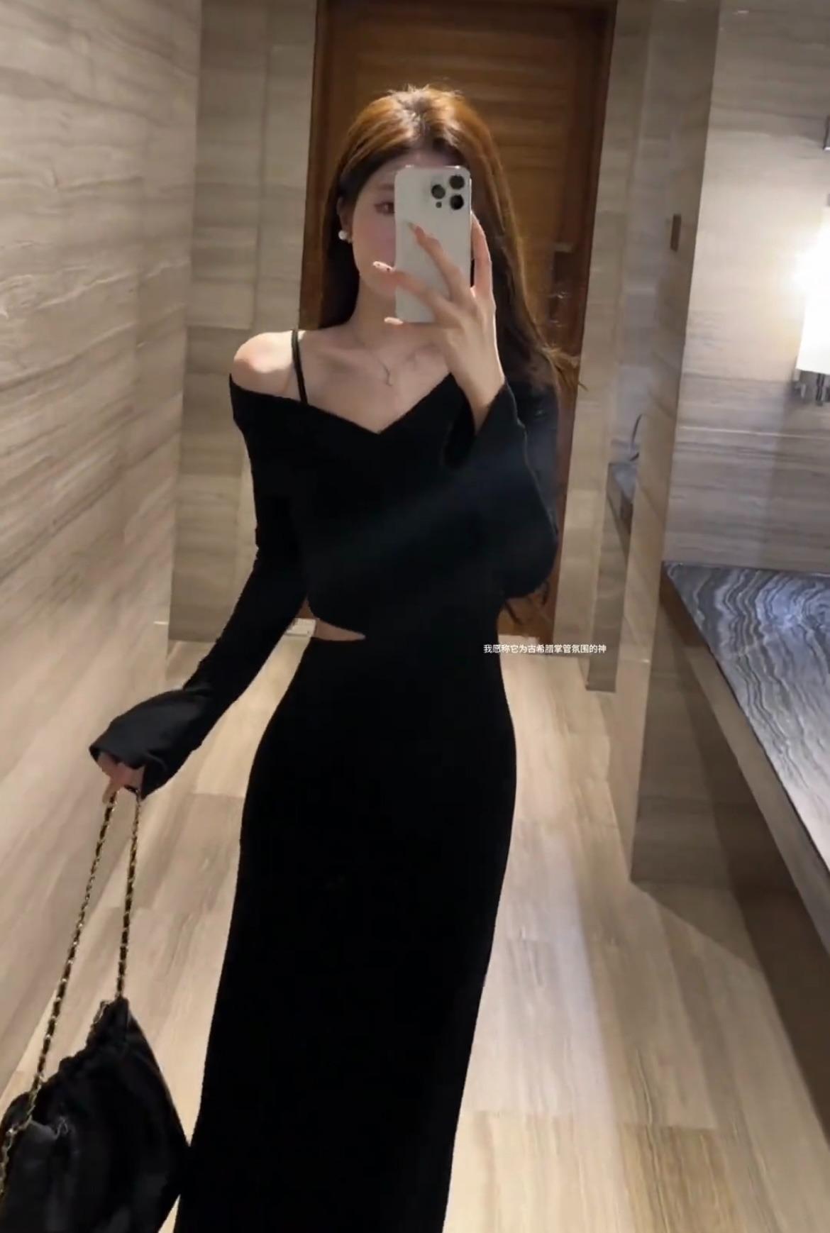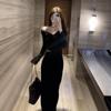 Vestido 2025 con Cintura Ajustada y Hombros Descubiertos de Manga Larga para Mujer, Diseño de Otoño, Falda Larga Ajustada que Revela la Cintura