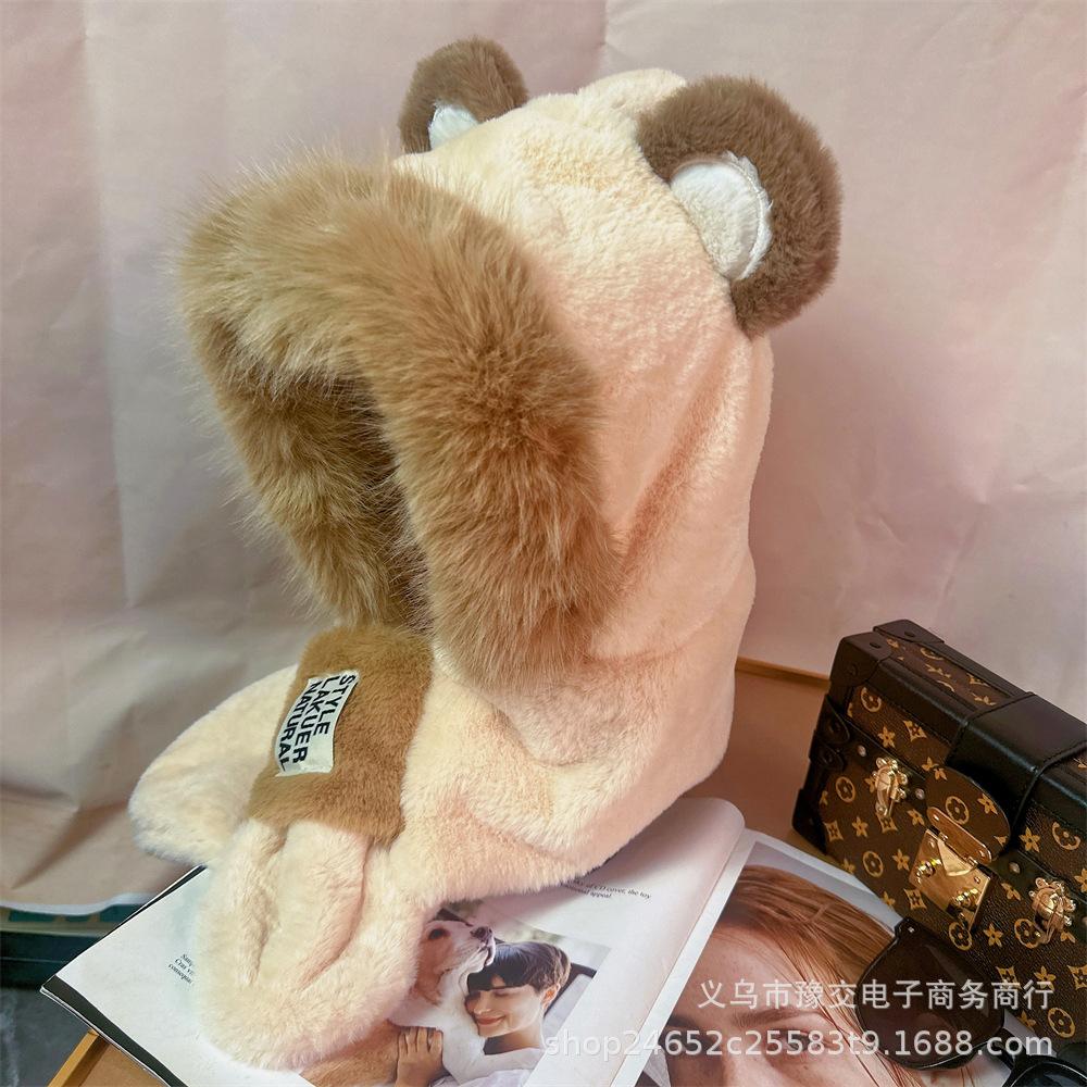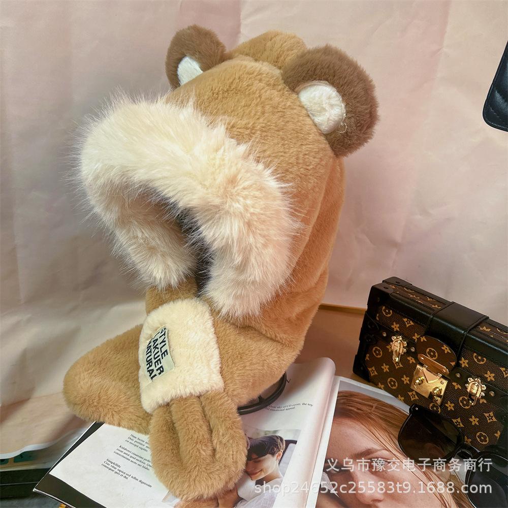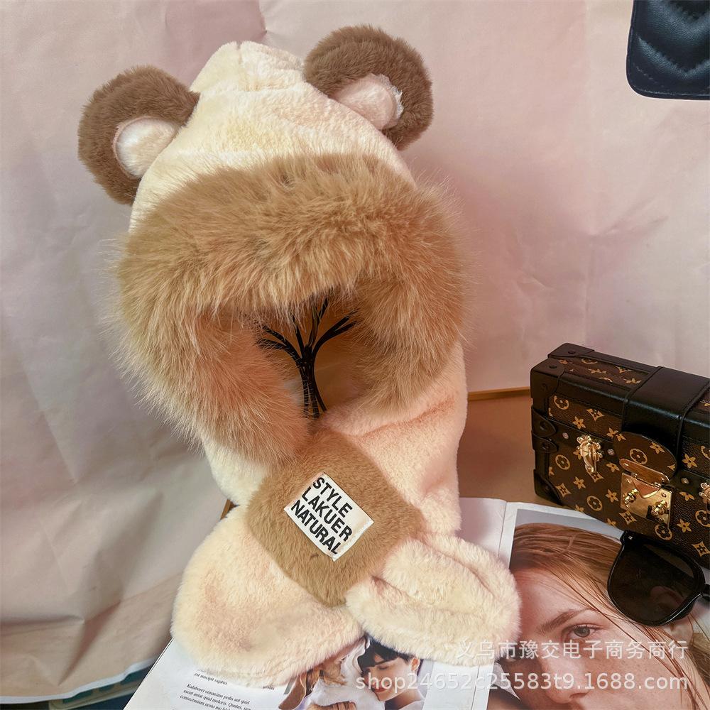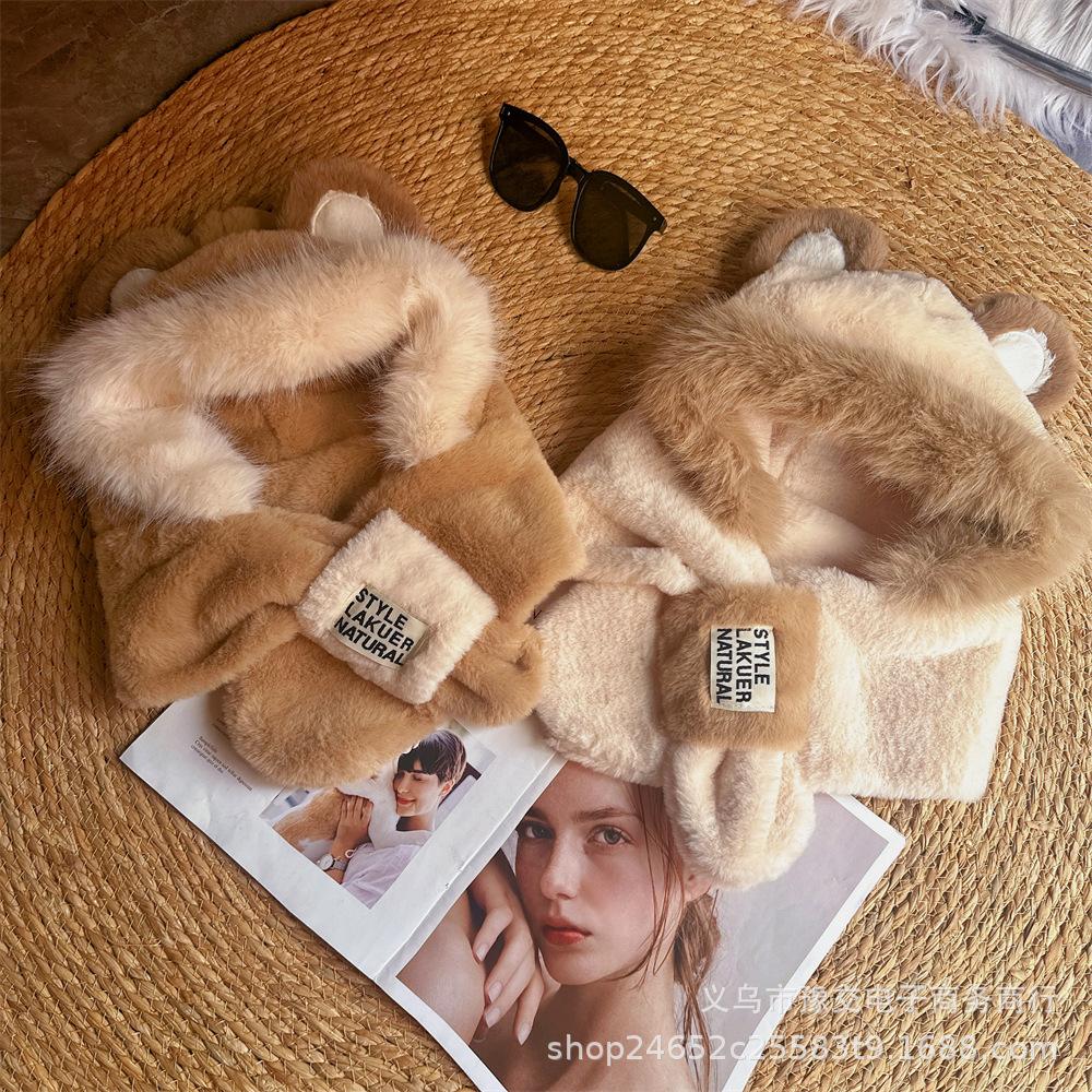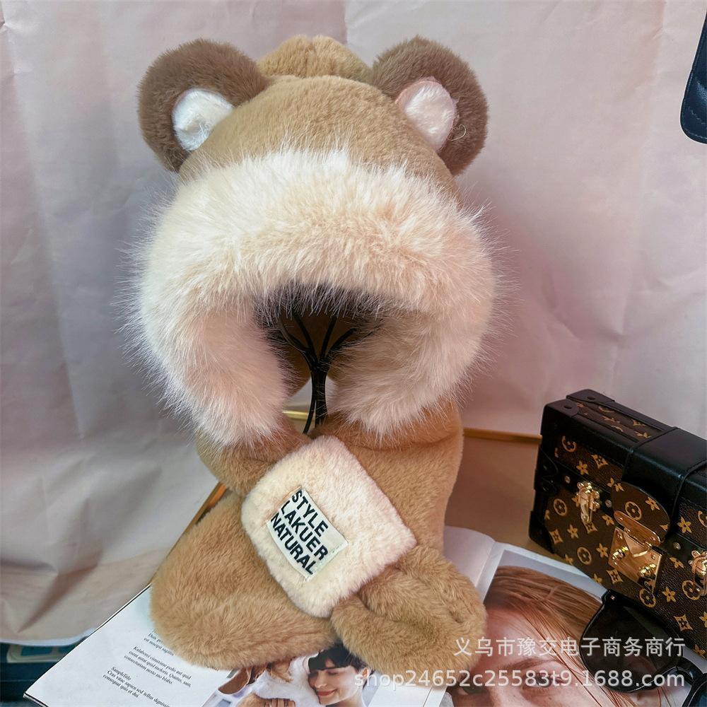Gorro de oso para mujer invierno cálido con capucha bufanda guantes integrados cálido orejas de gato sombrero a prueba de viento tres piezas Invierno