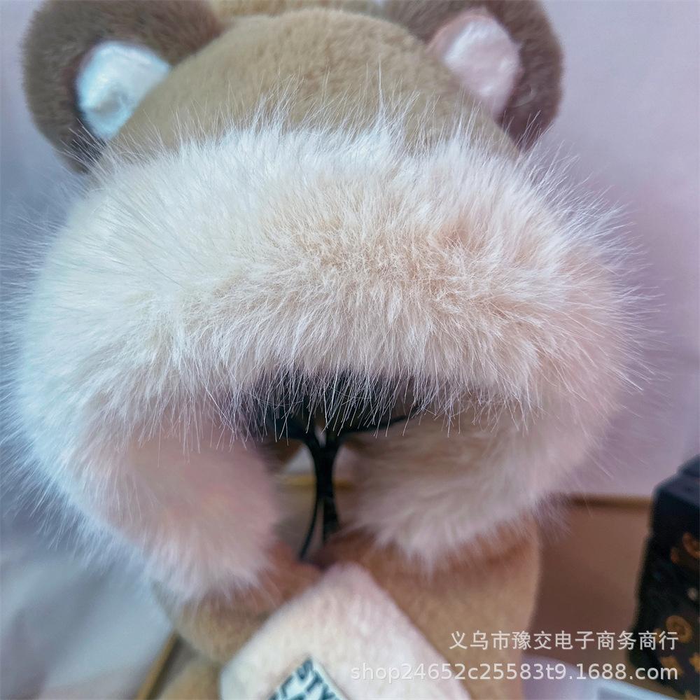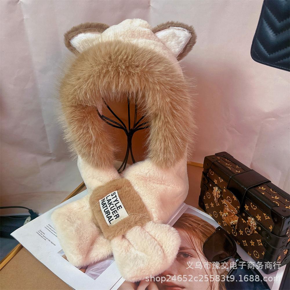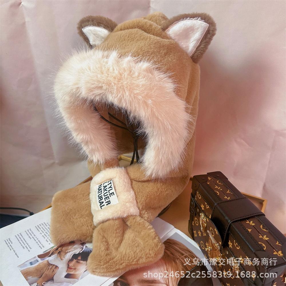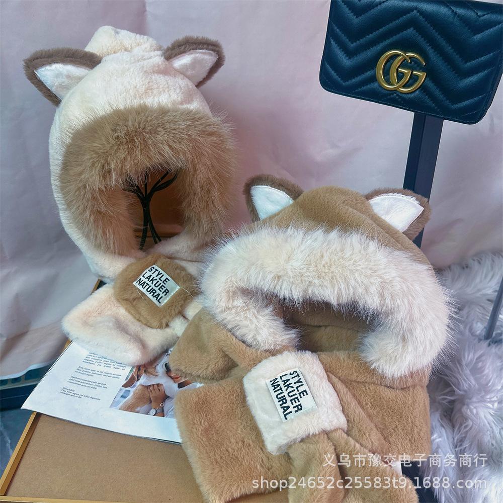 Gorro de oso para mujer invierno cálido con capucha bufanda guantes integrados cálido orejas de gato sombrero a prueba de viento tres piezas Invierno