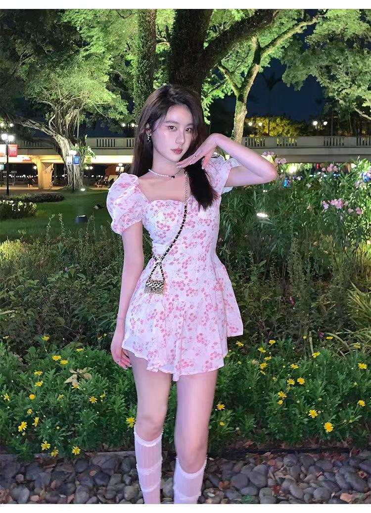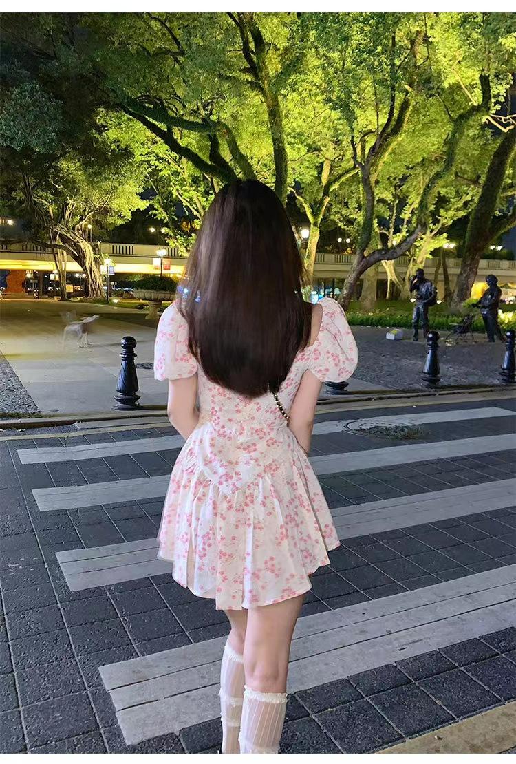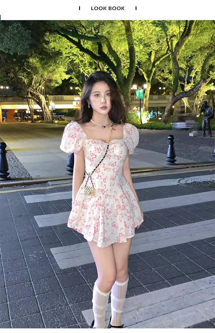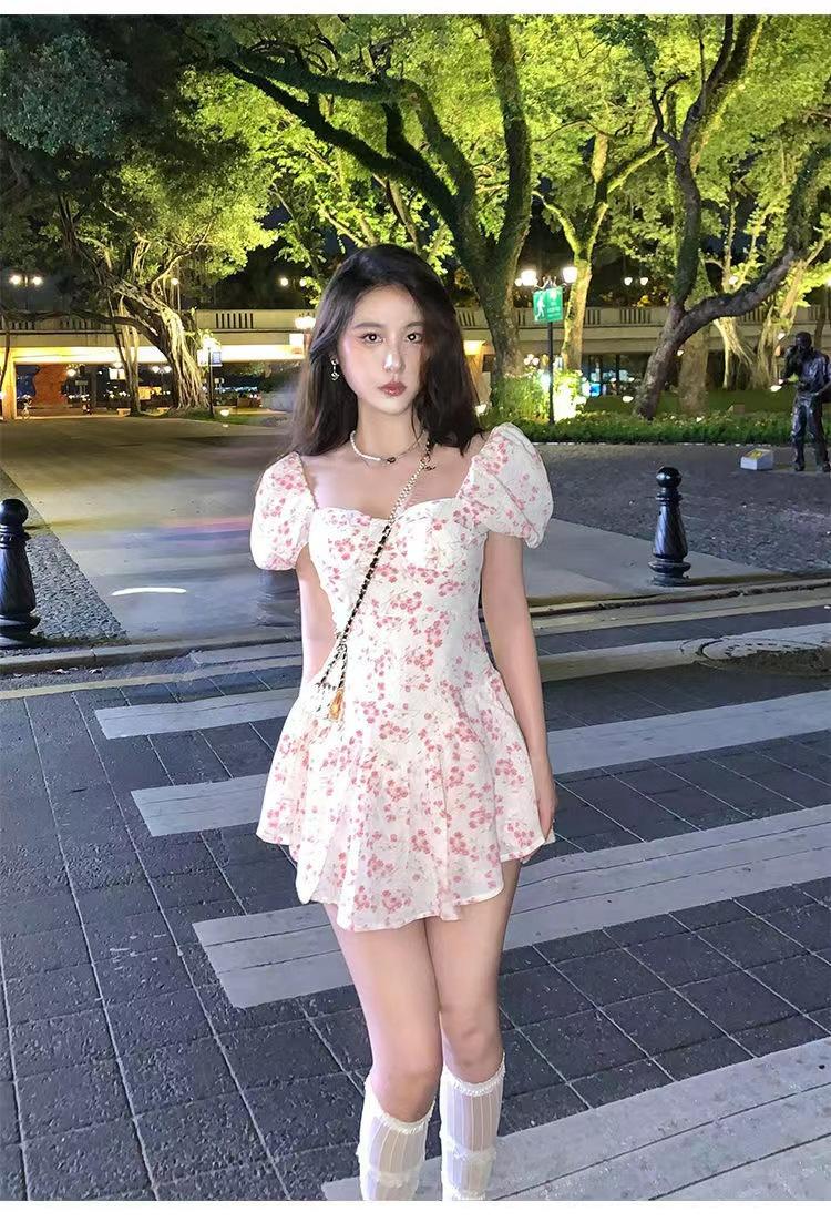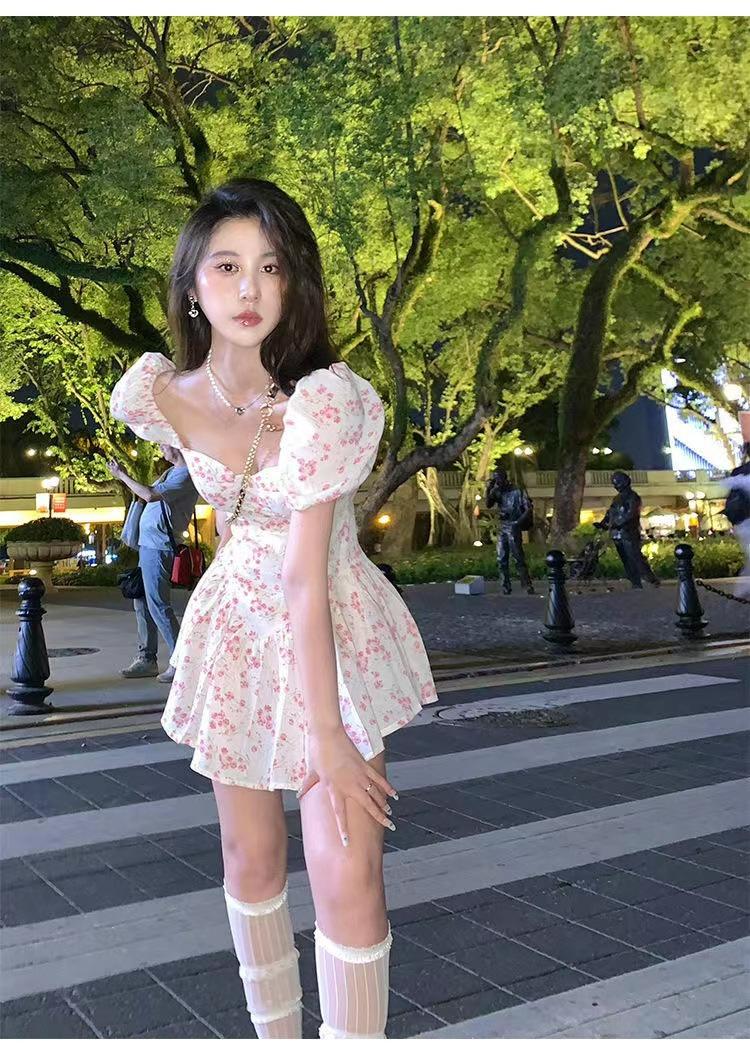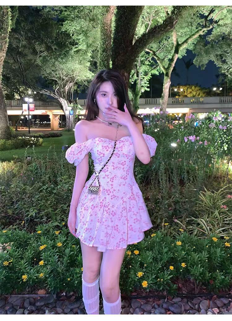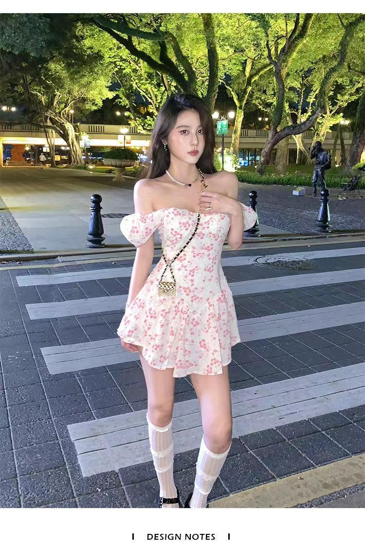 Vestido floral de estilo francés con mangas abullonadas puras para mujer, nuevo vestido de verano de estilo francés dulce y picante, falda corta ajustada a la cintura con hombros descubiertos