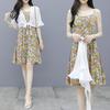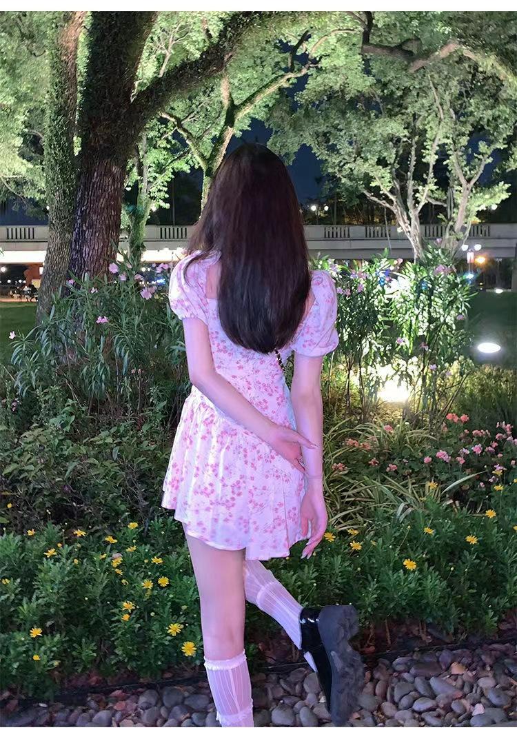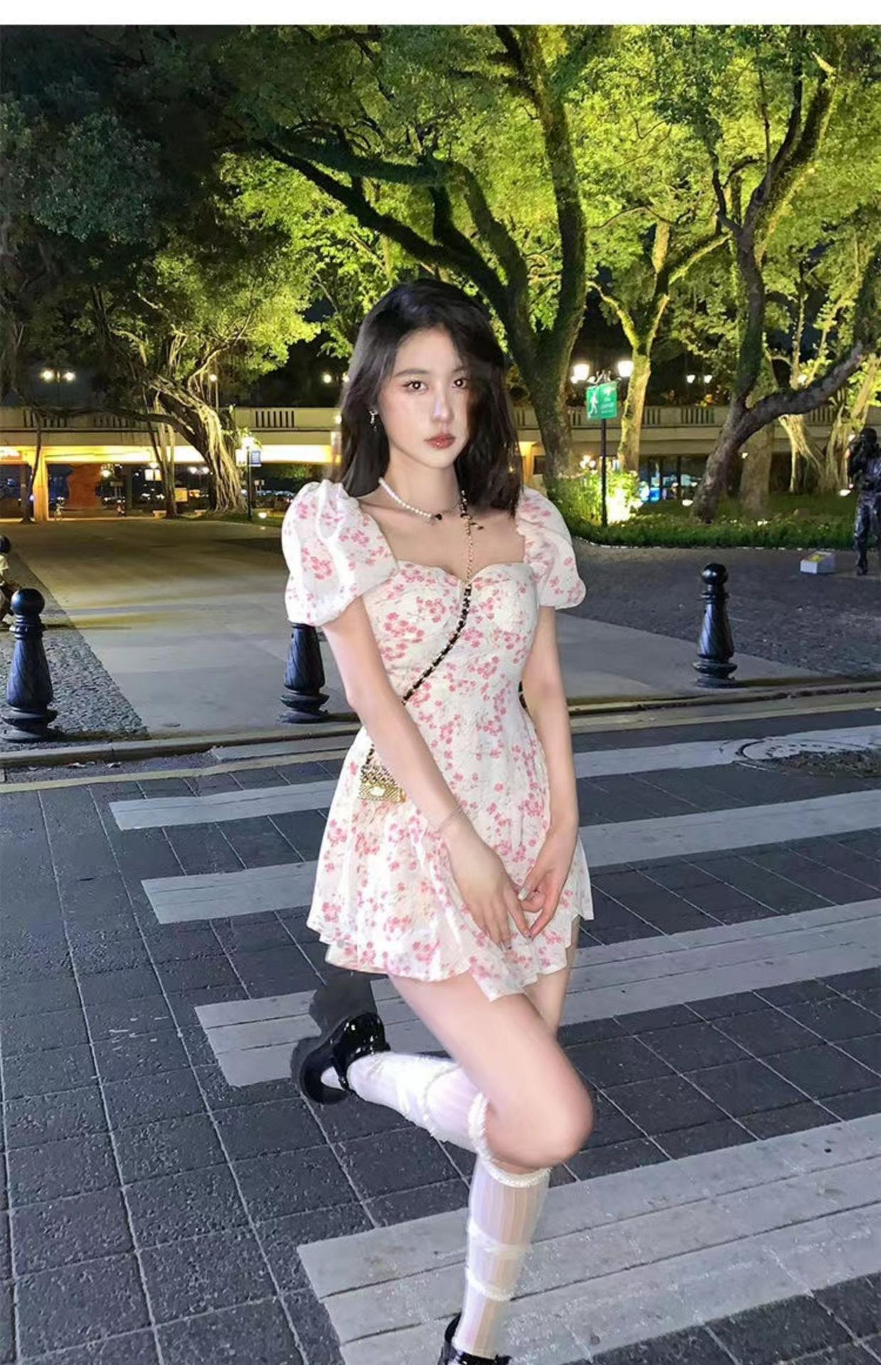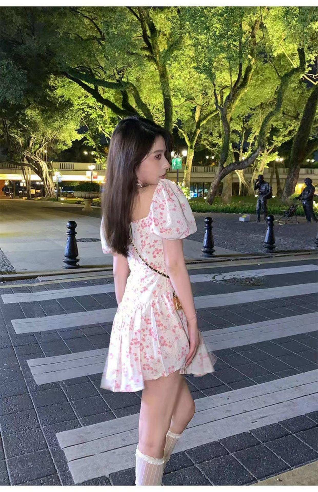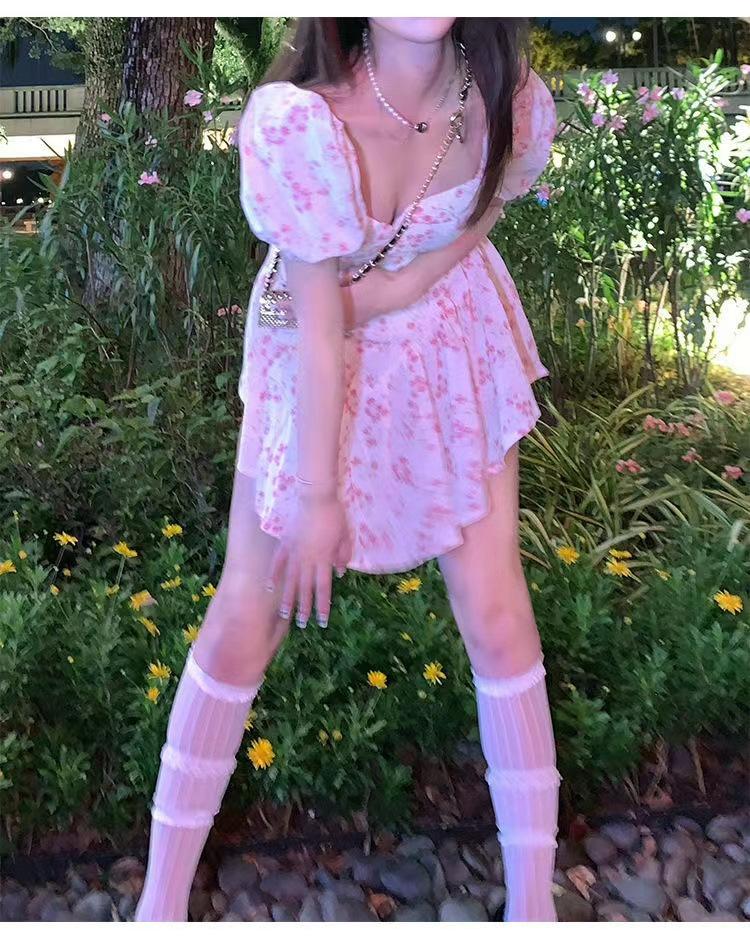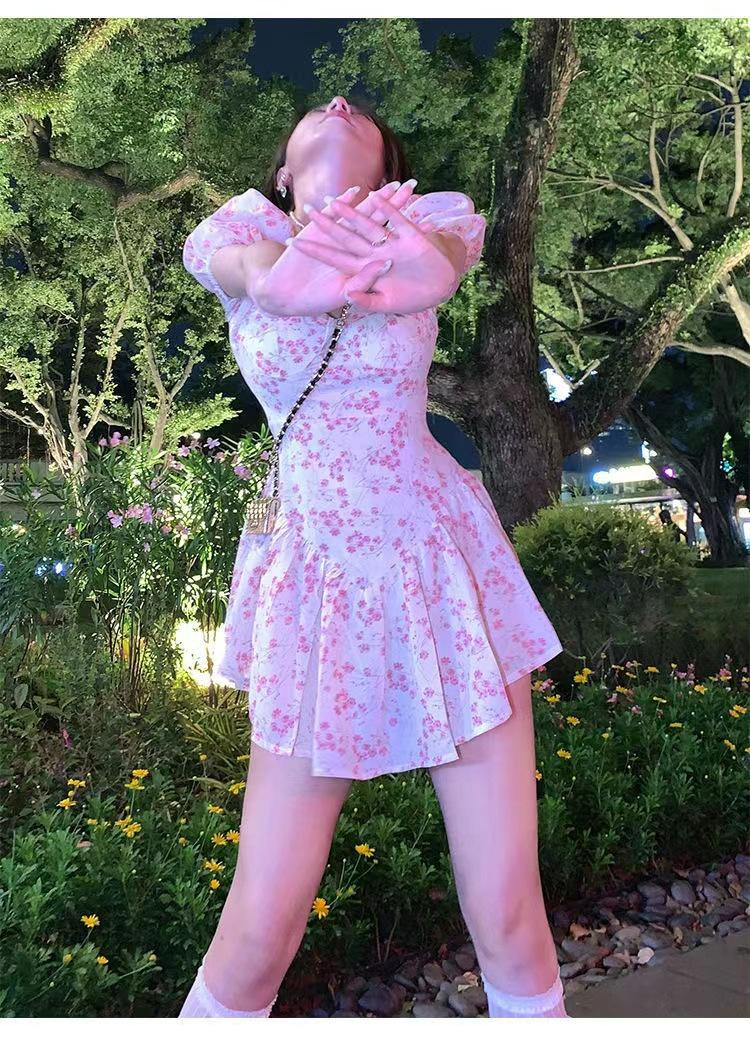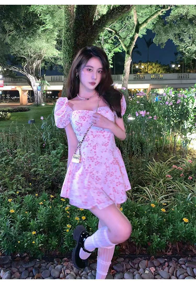 Vestido floral de estilo francés con mangas abullonadas puras para mujer, nuevo vestido de verano de estilo francés dulce y picante, falda corta ajustada a la cintura con hombros descubiertos