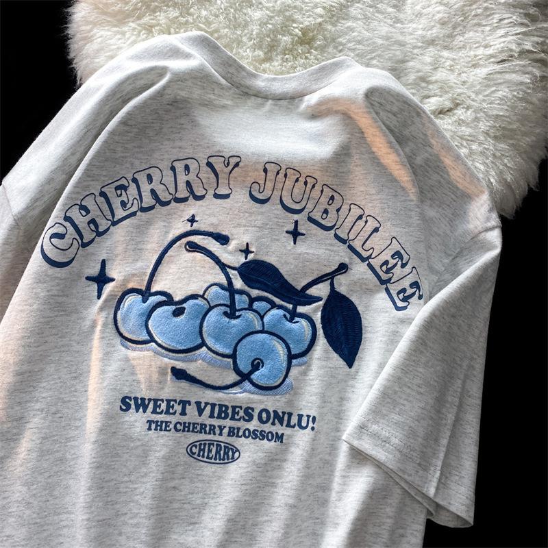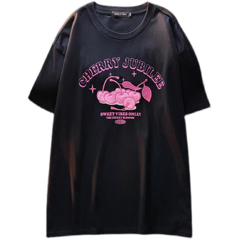 Camiseta de manga corta para mujer con estampado de cerezas de dibujos animados, camiseta holgada de talla grande para mujer, top dulce y perezoso para parejas, moda Ins