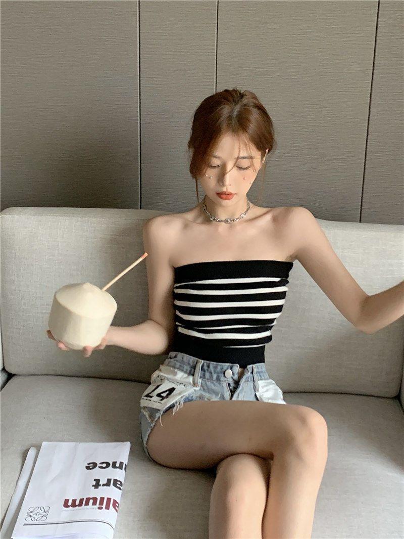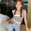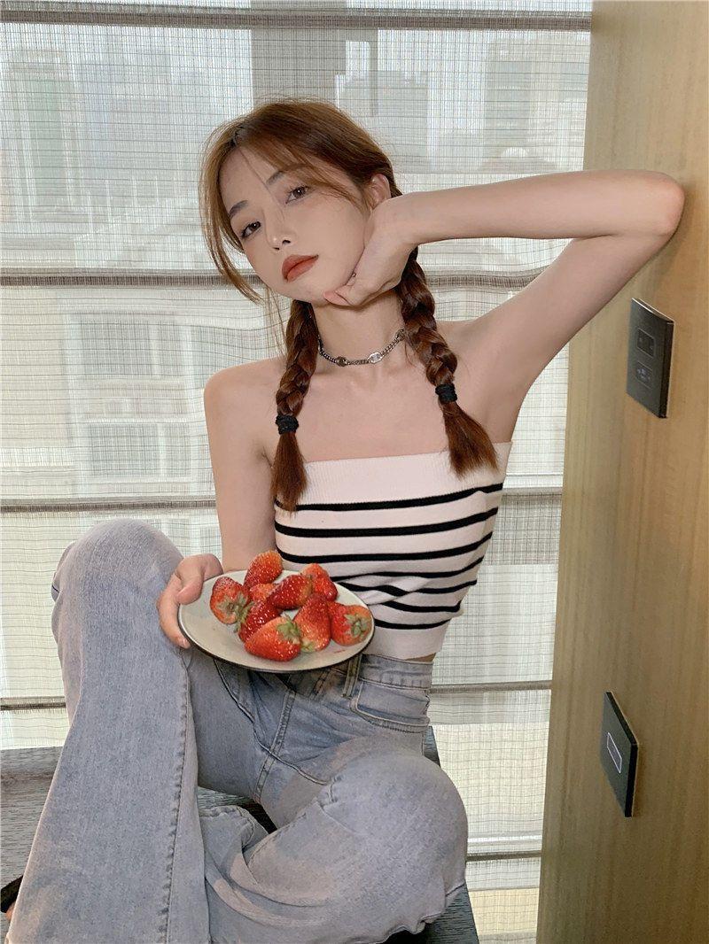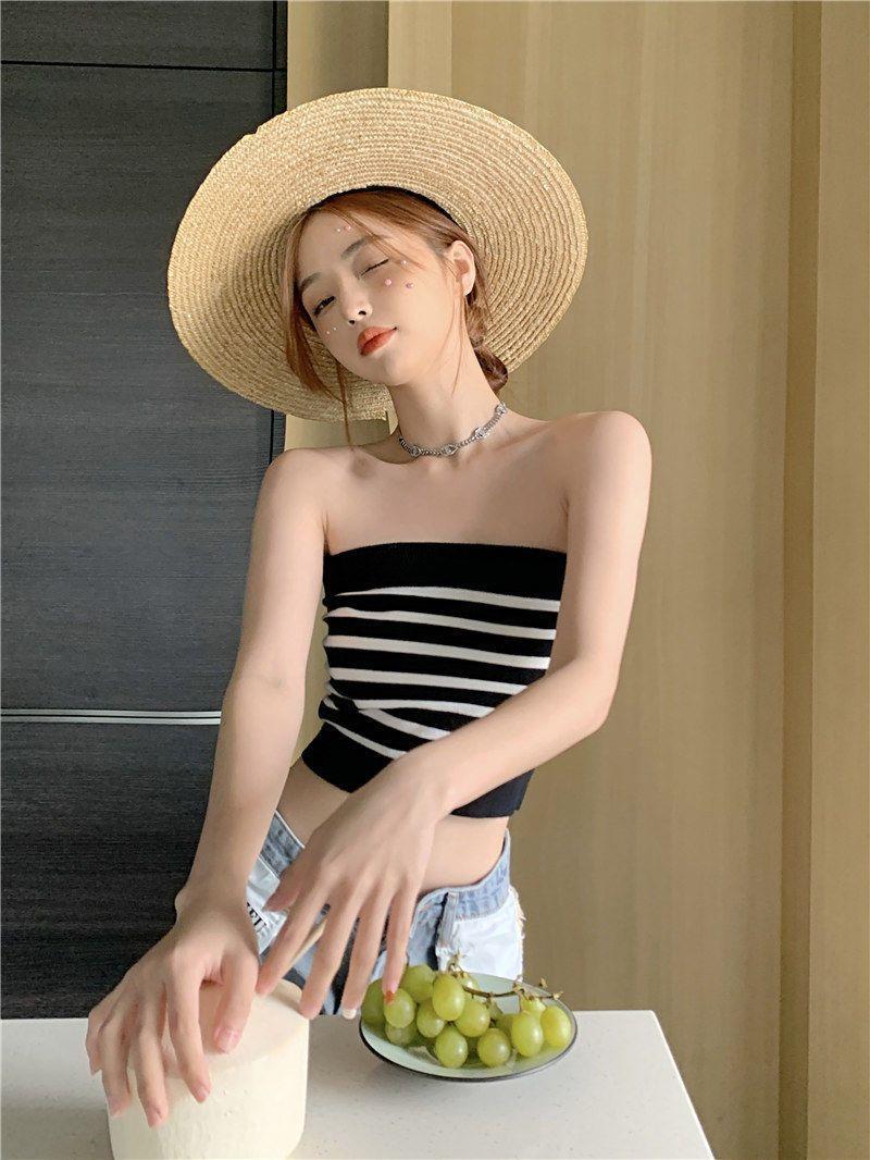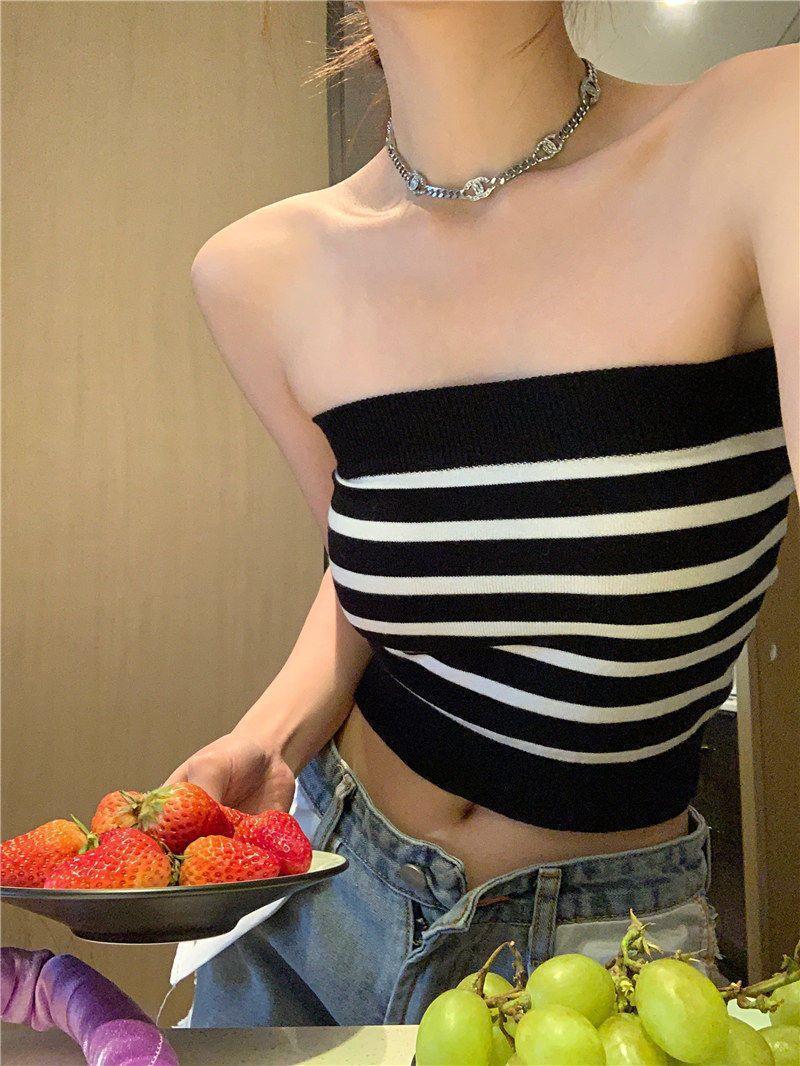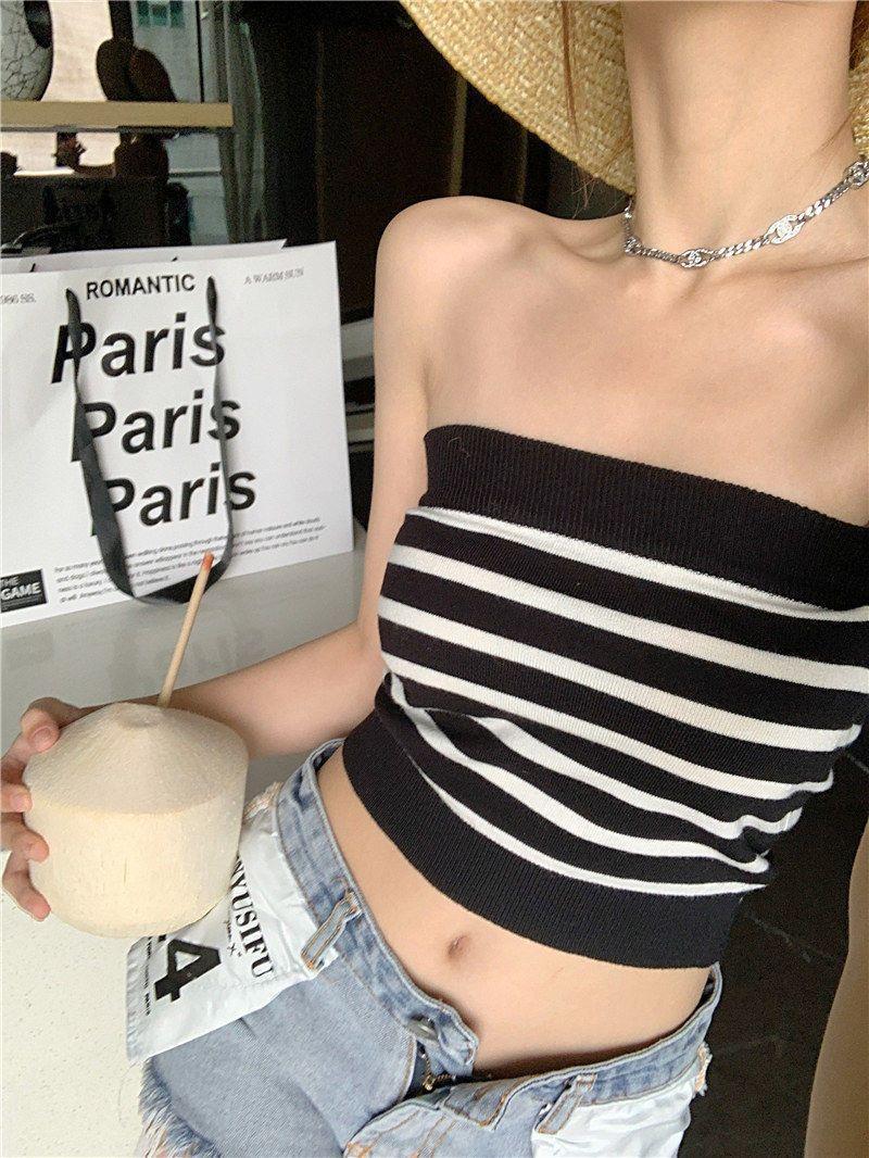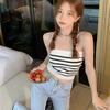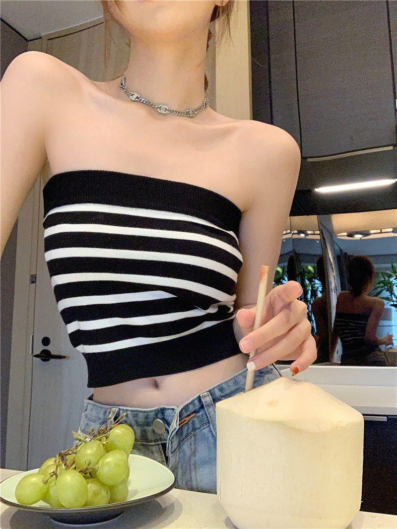 Camisola pequeña a rayas, estilo nuevo de verano 2023, dulce y picante, para uso exterior, top corto sin tirantes para mujer