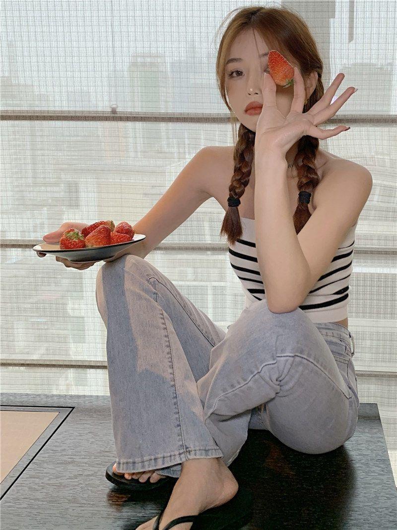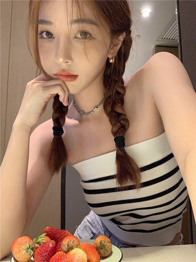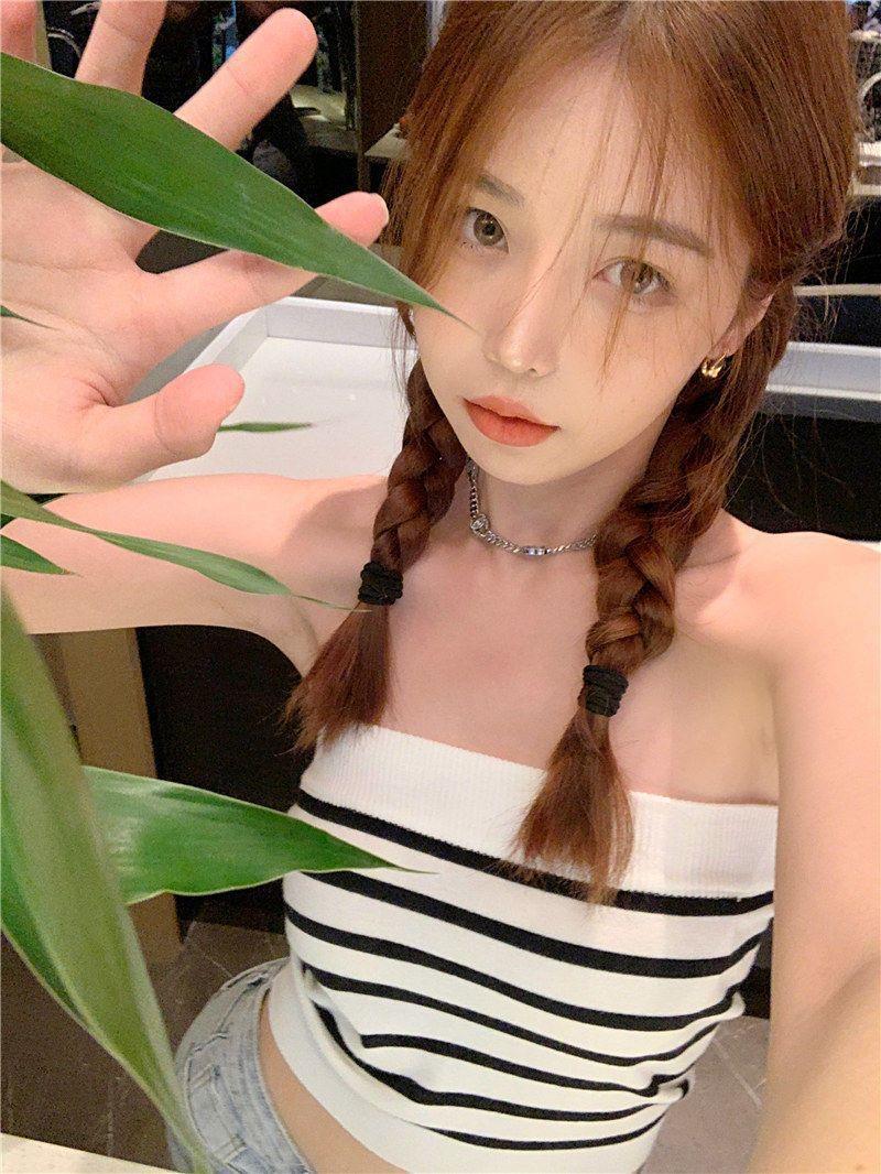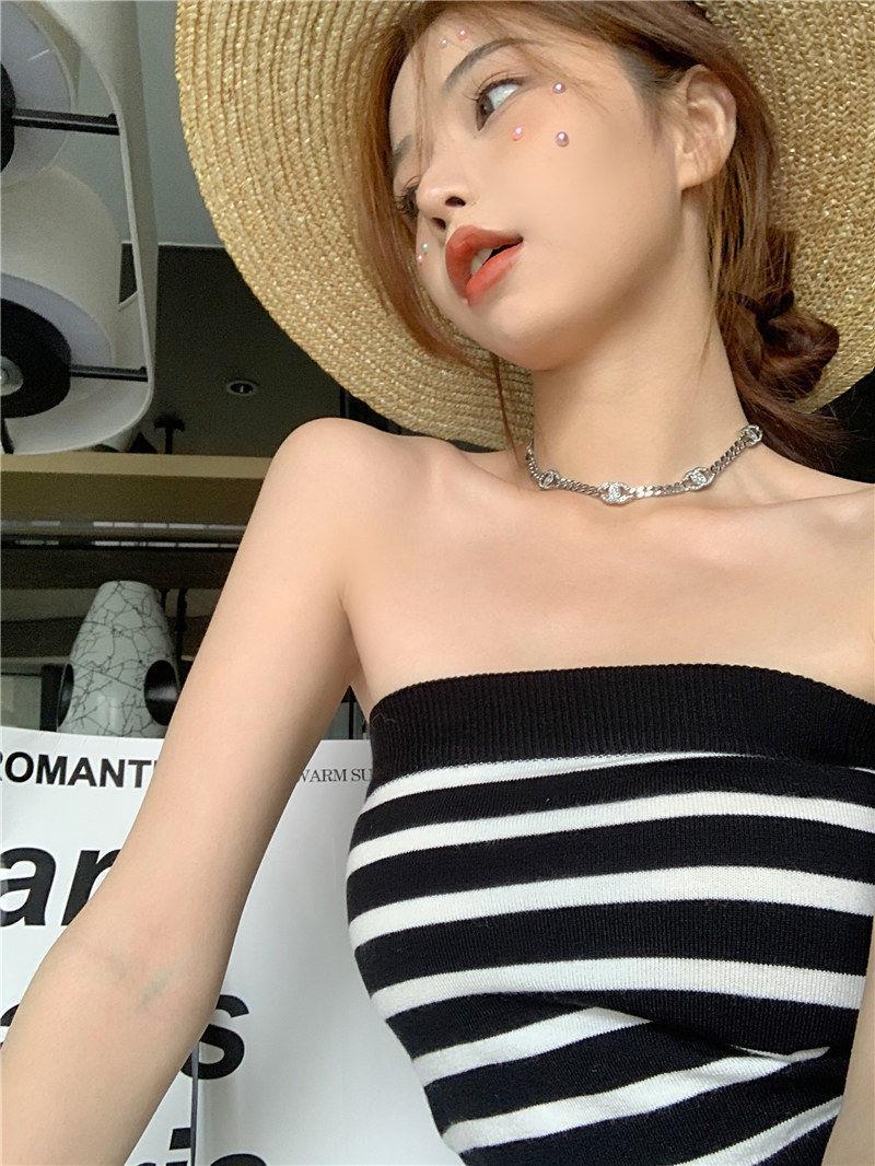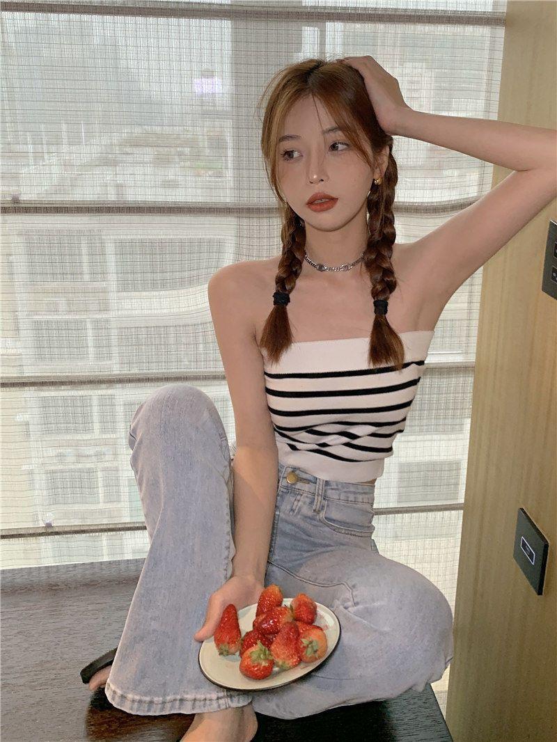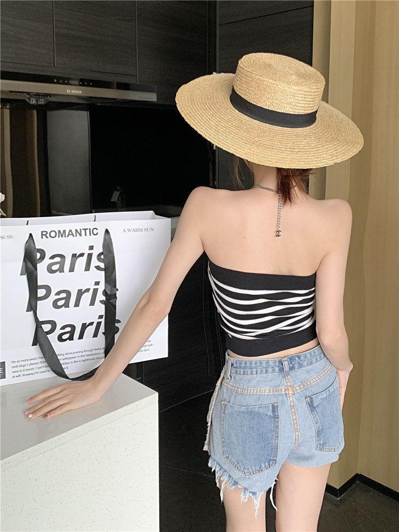 Camisola pequeña a rayas, estilo nuevo de verano 2023, dulce y picante, para uso exterior, top corto sin tirantes para mujer