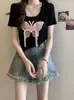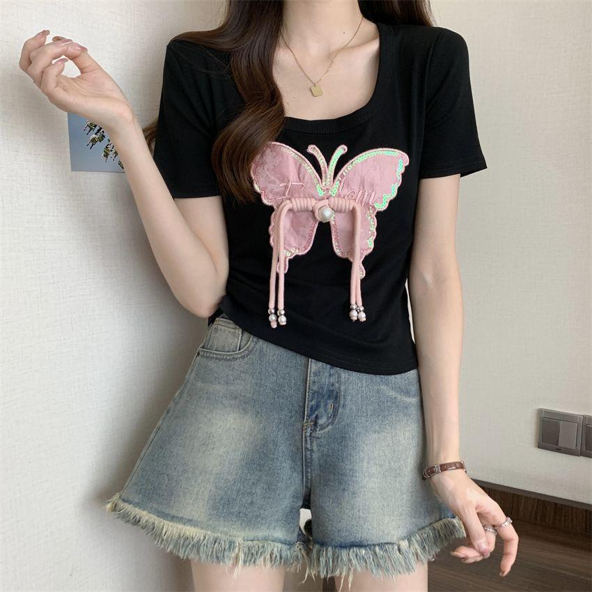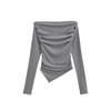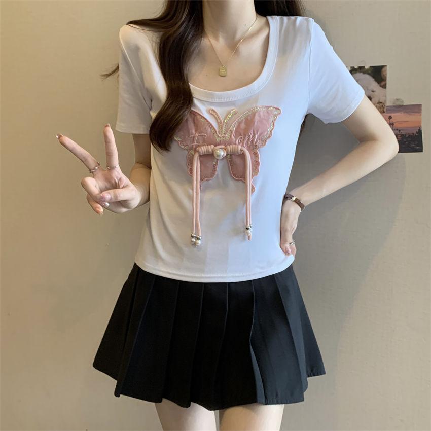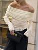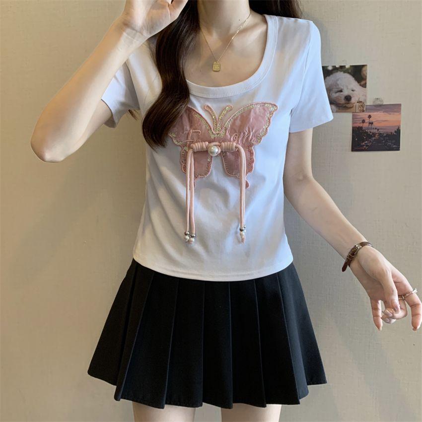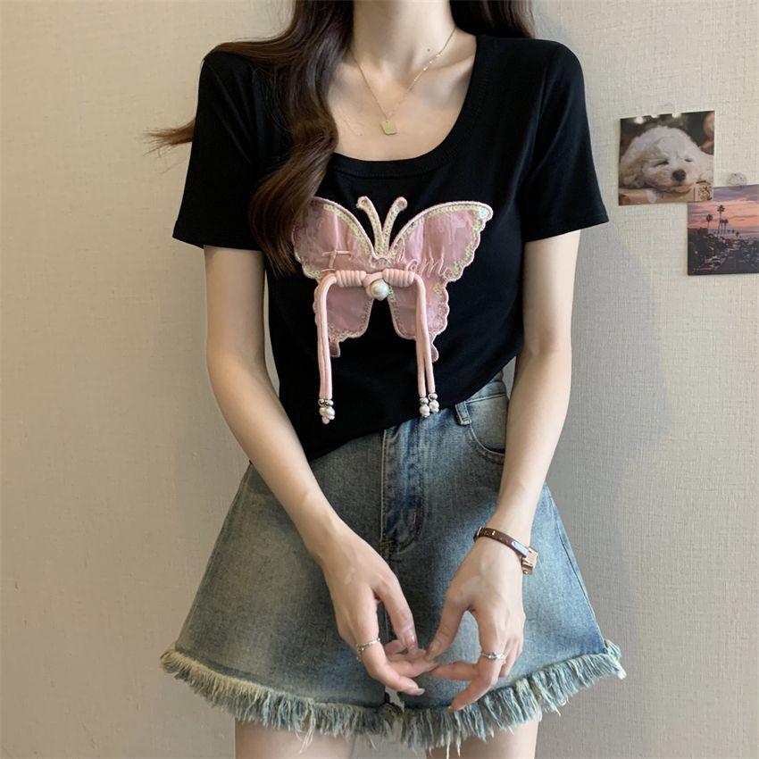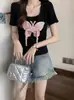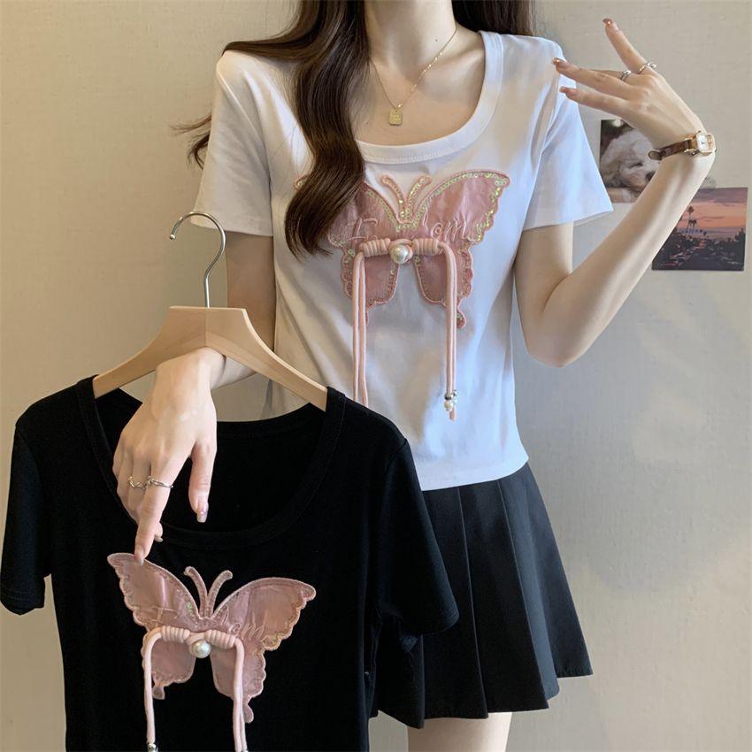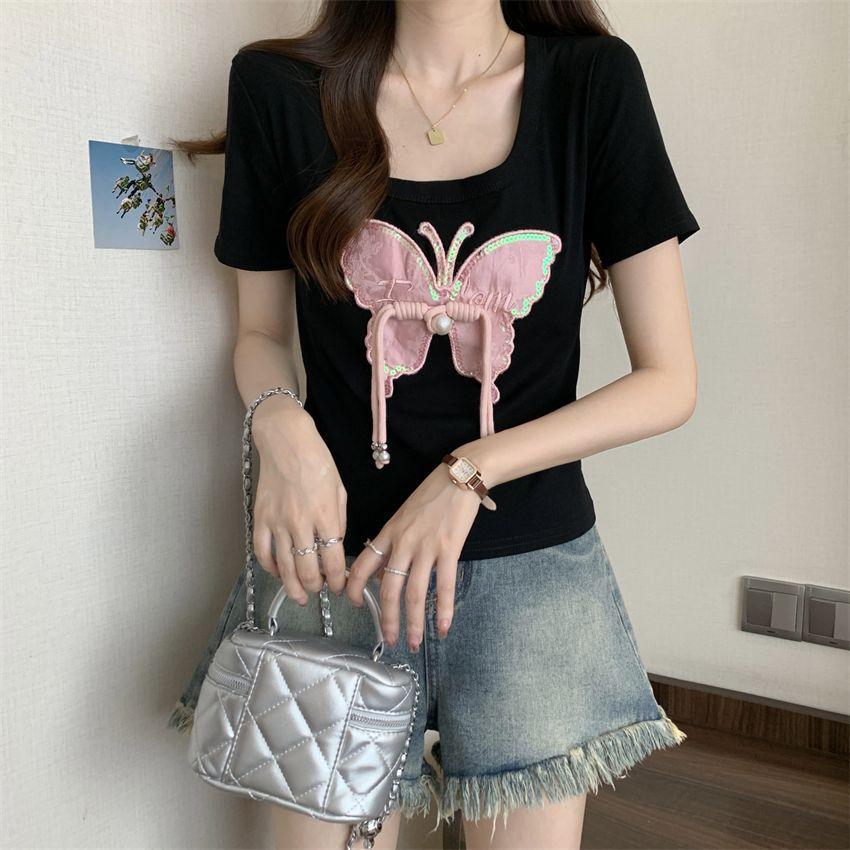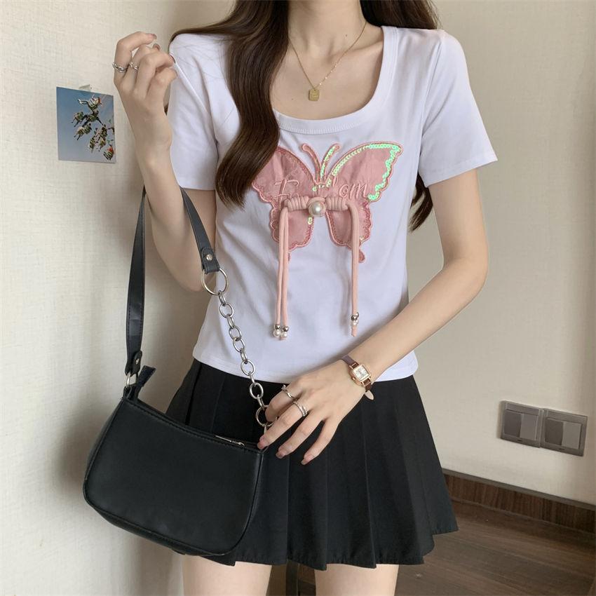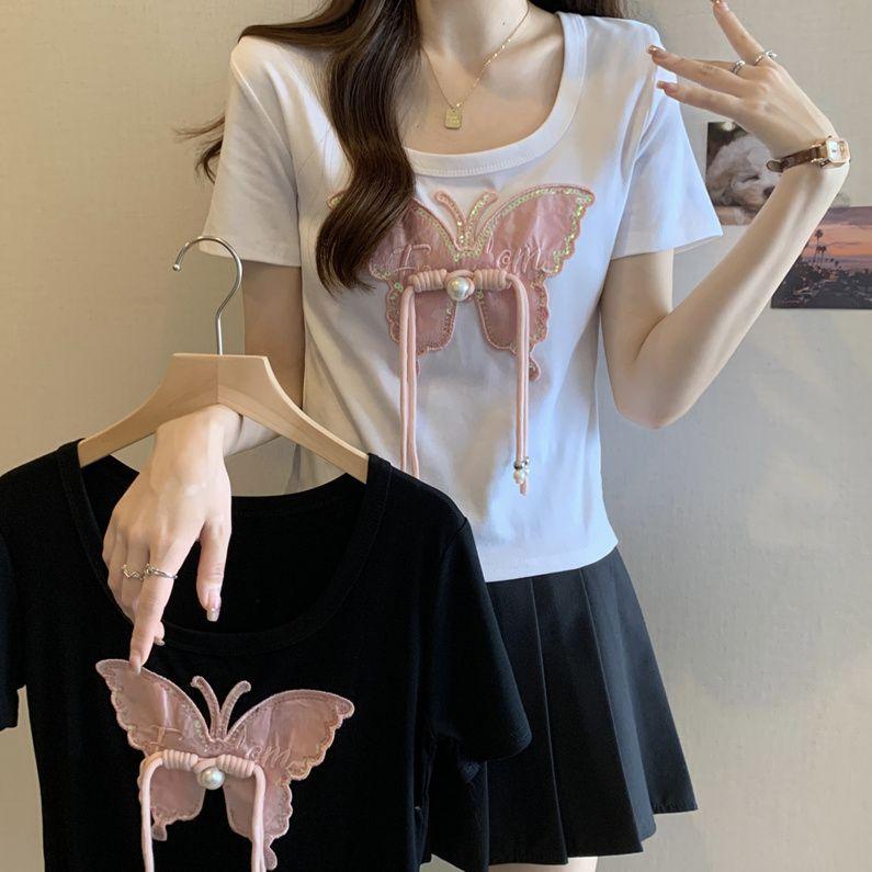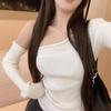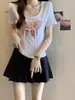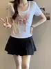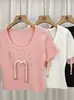 Diseño de Verano Deseo Puro Cuello Redondo Hombro Tejido Camiseta de Mujer Estilo Francés Nueva Llegada Top Estilizado con Lazo Ins