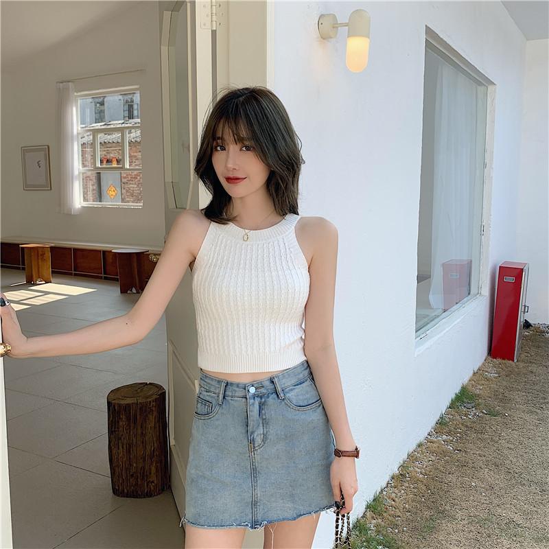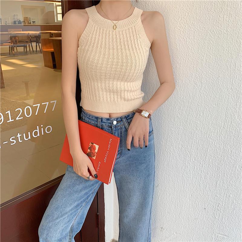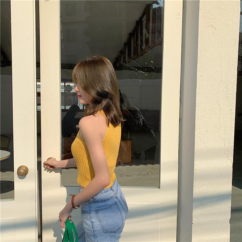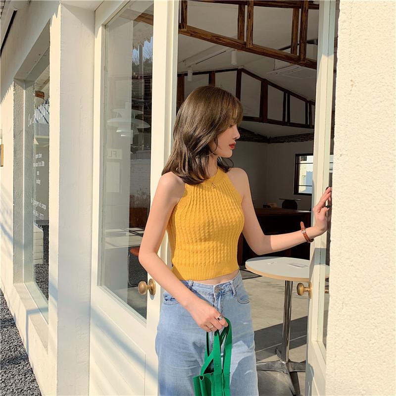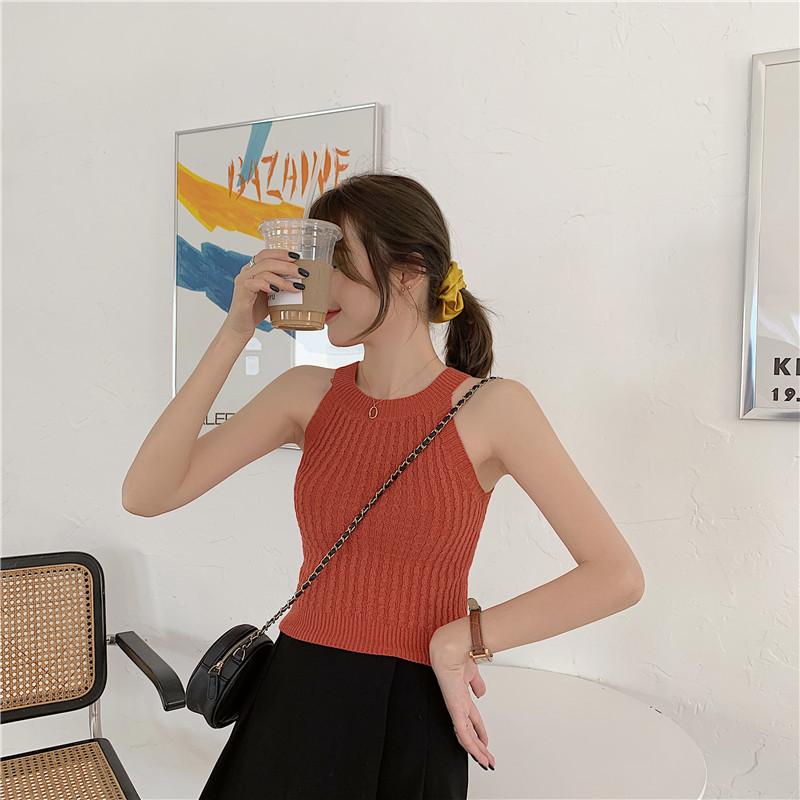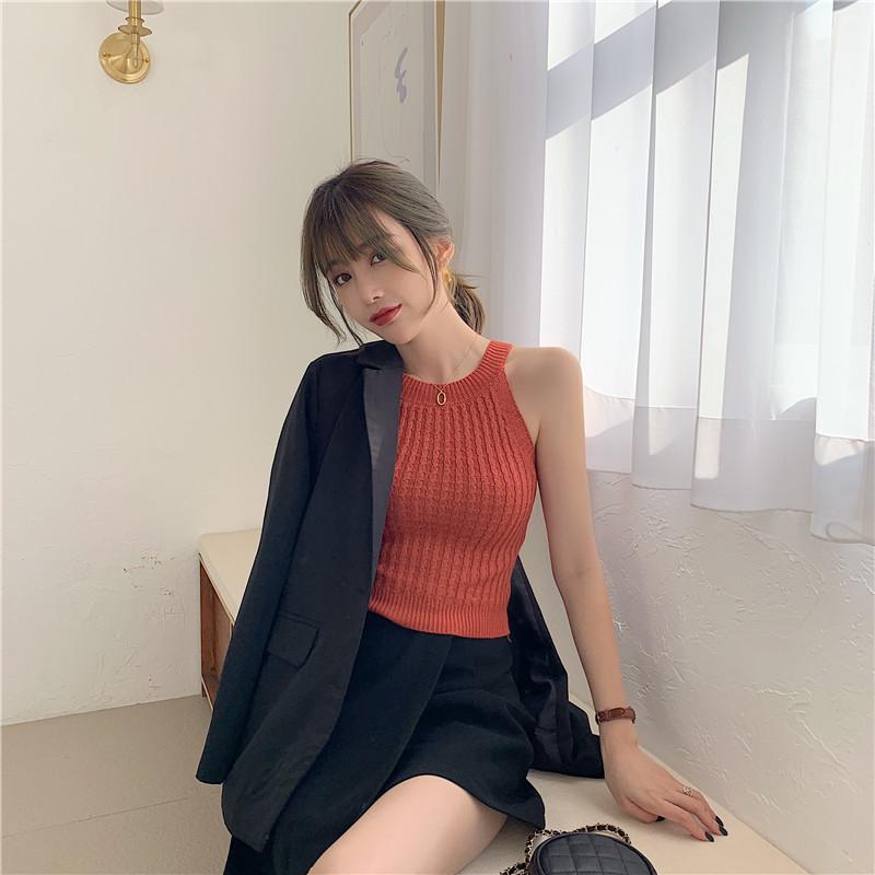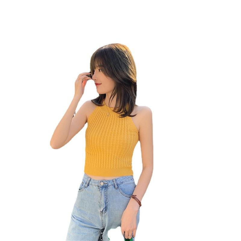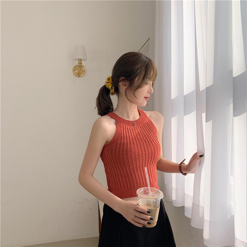 Camisola corta con cuello halter para mujer, prenda exterior que combina con todo, de punto, con hombros descubiertos, estilo coreano elegante, top preppy sin mangas