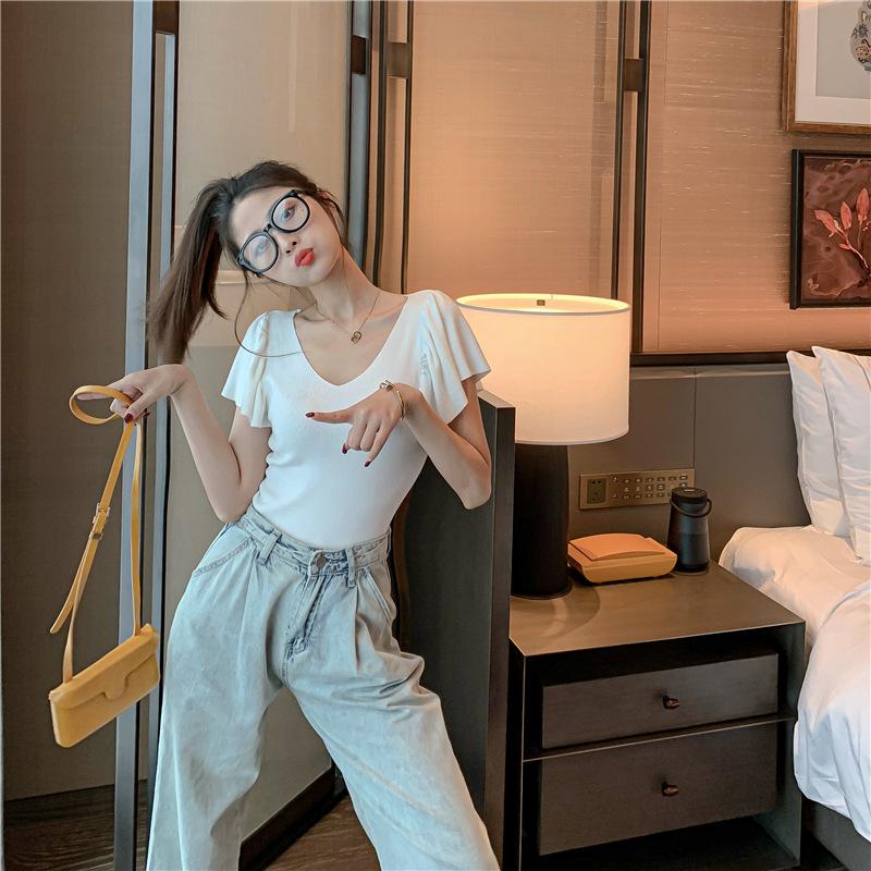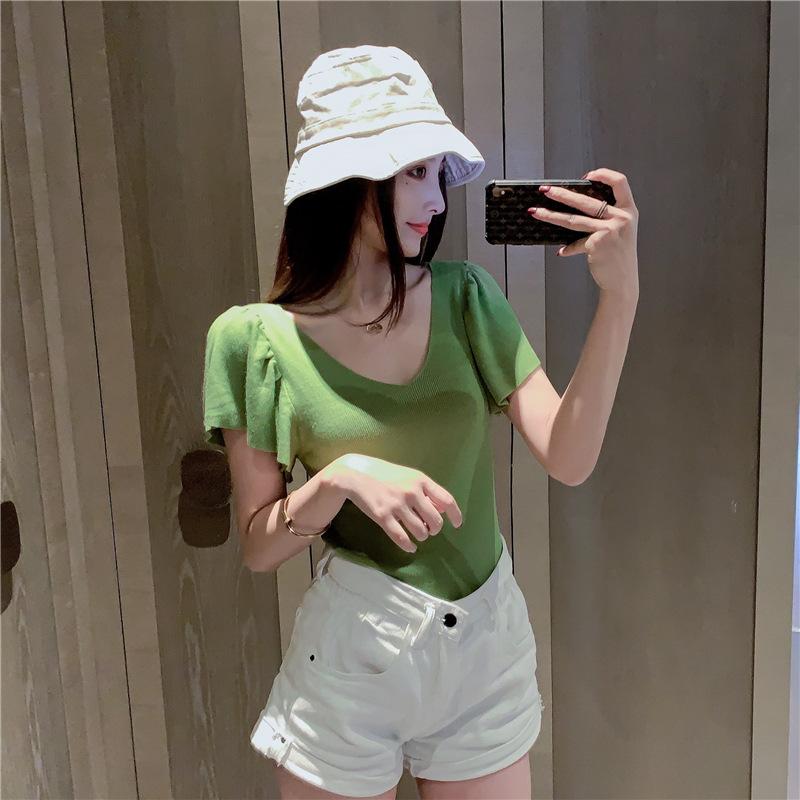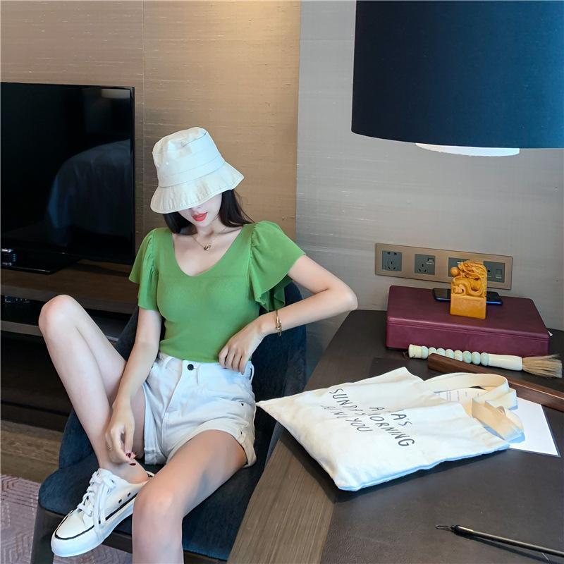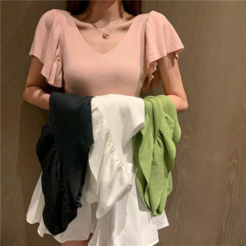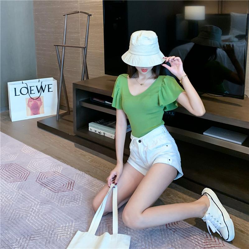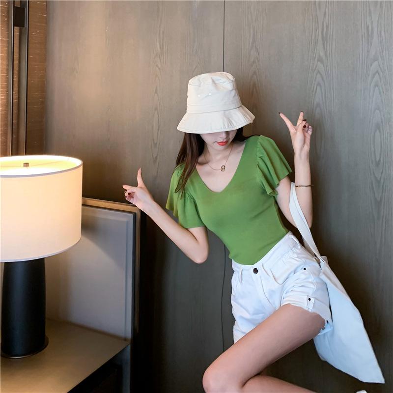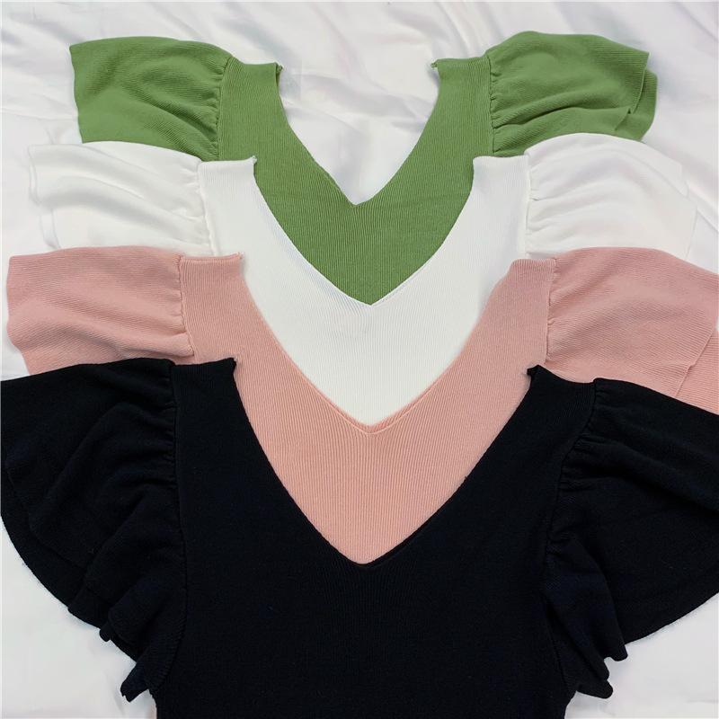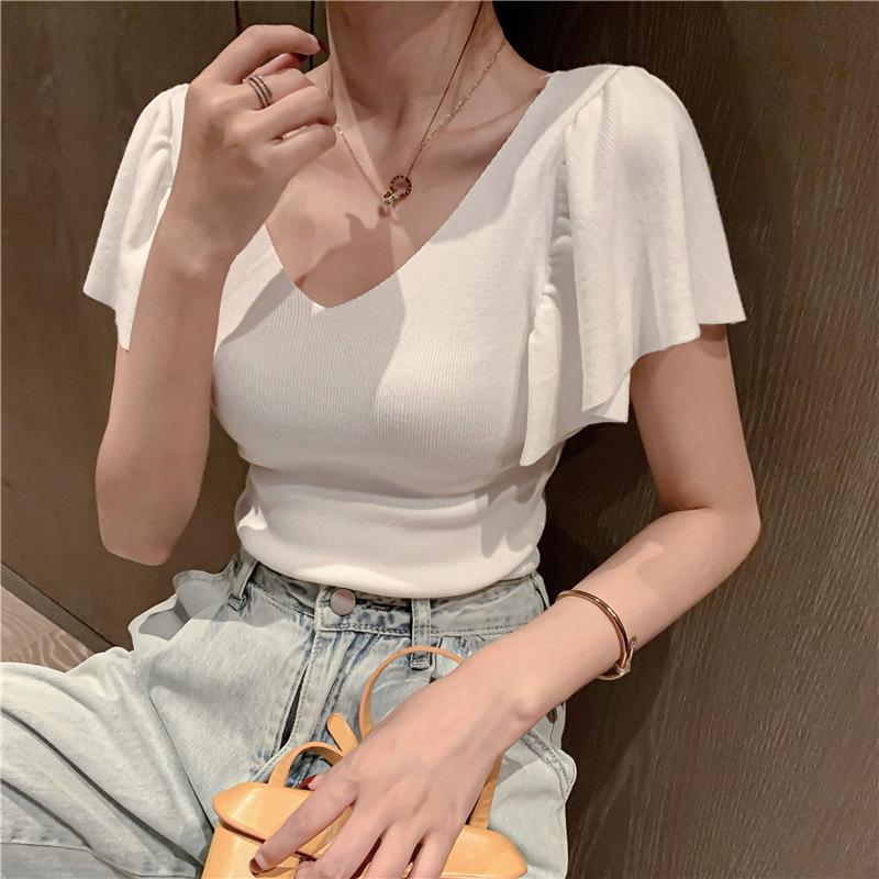 Suéter con cuello en V y mangas de hoja de loto, camiseta básica de manga corta ajustada, ropa de mujer, novedad de verano de 2024