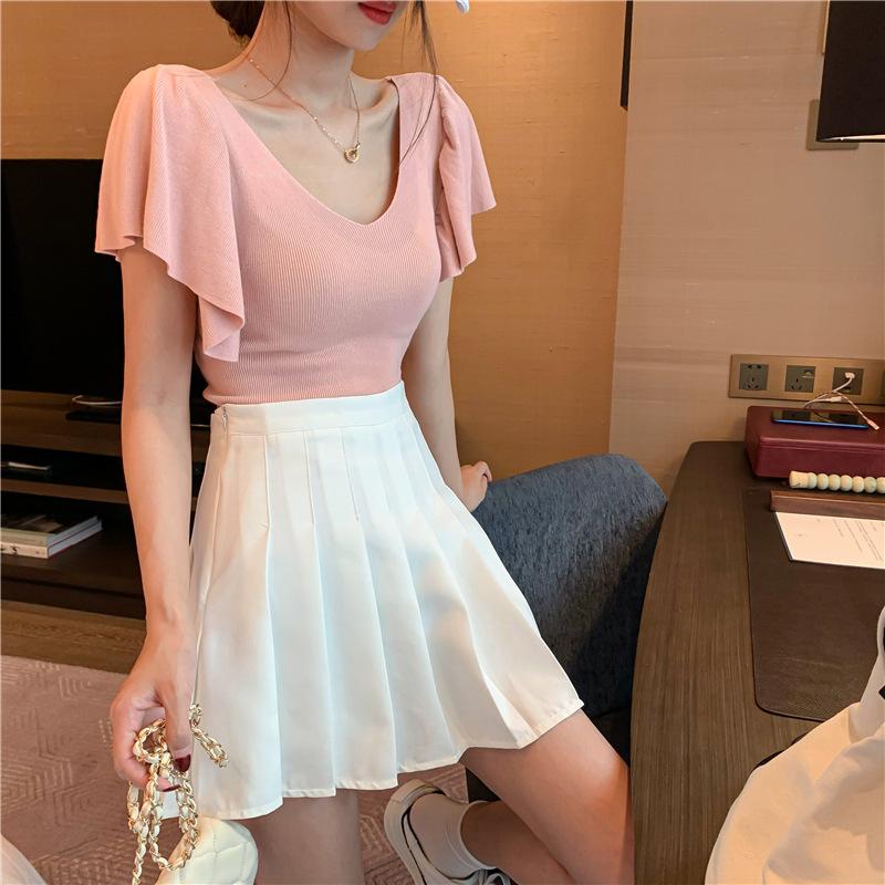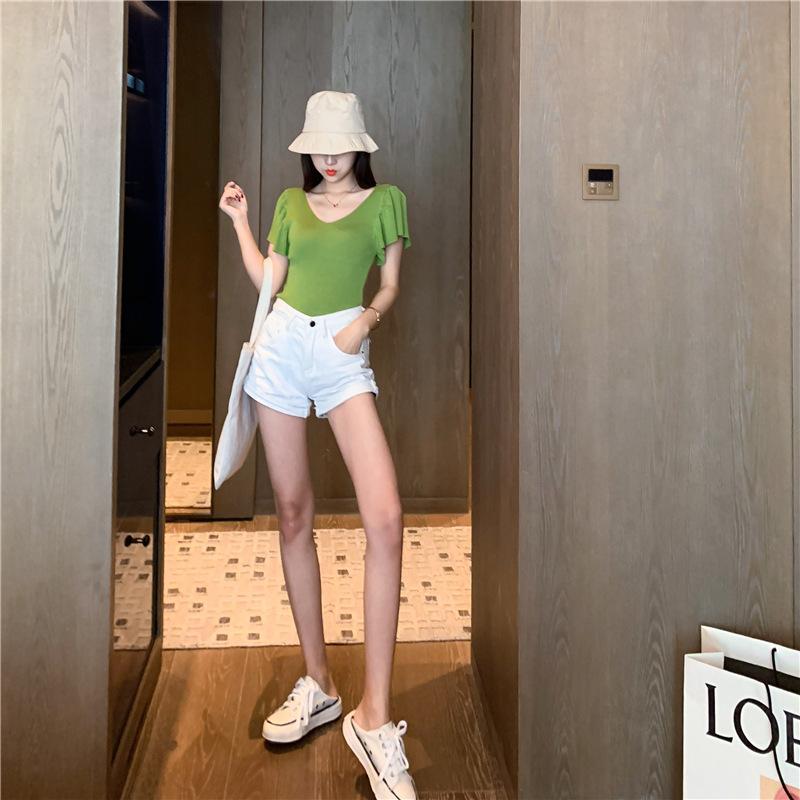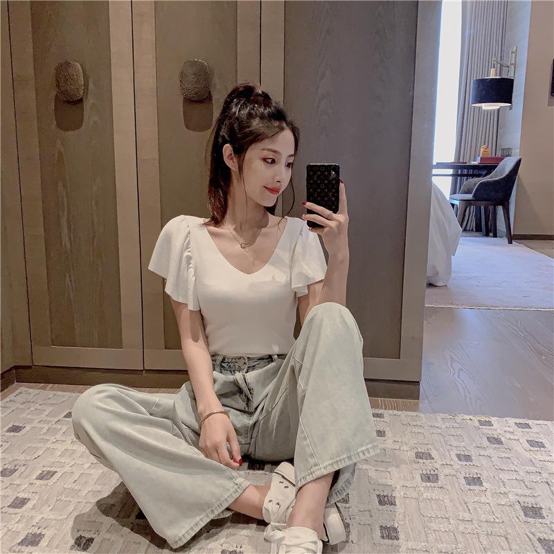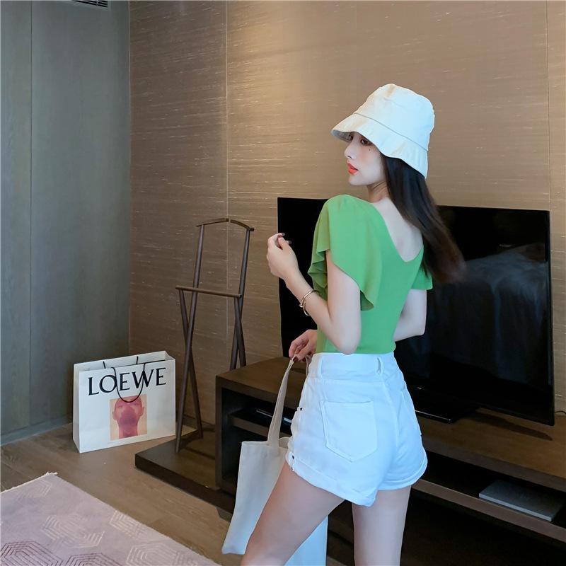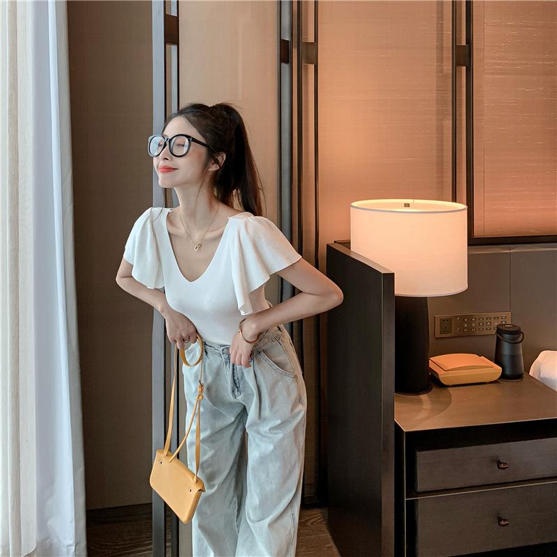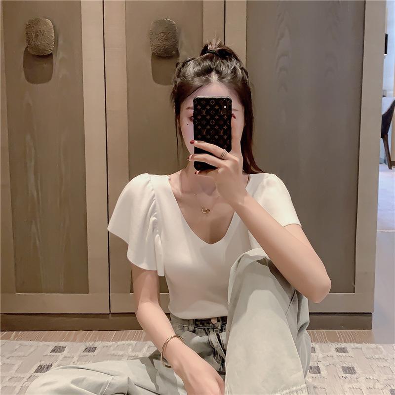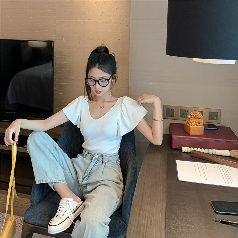 Suéter con cuello en V y mangas de hoja de loto, camiseta básica de manga corta ajustada, ropa de mujer, novedad de verano de 2024