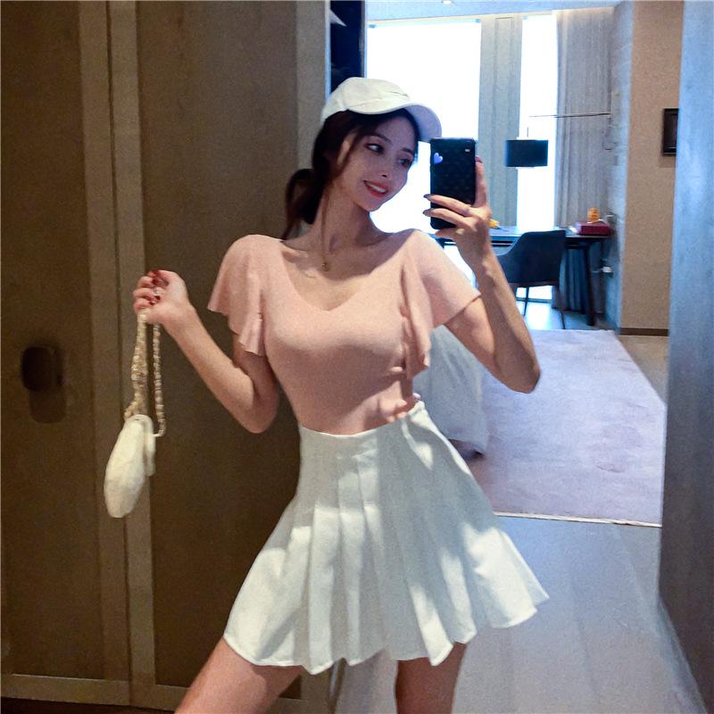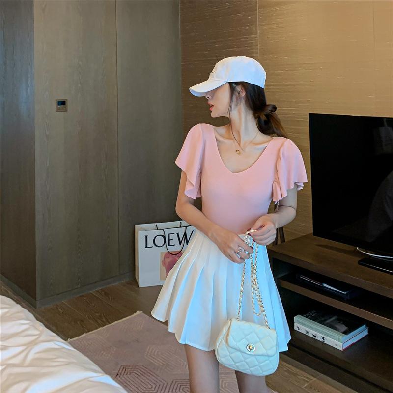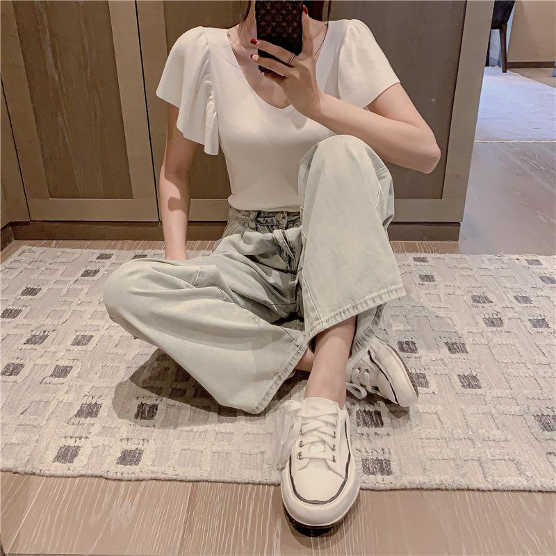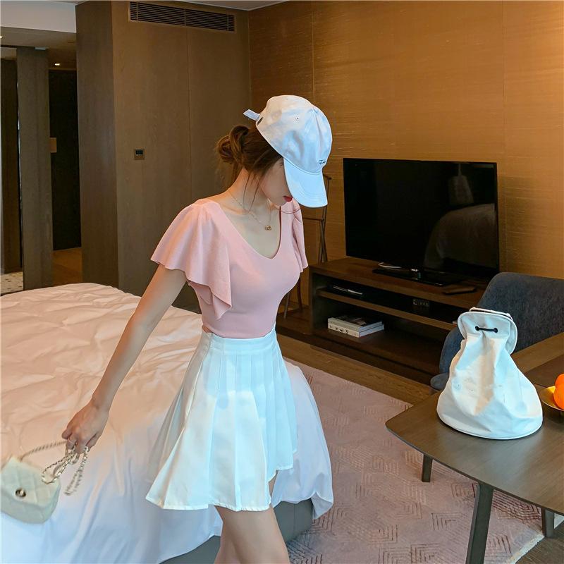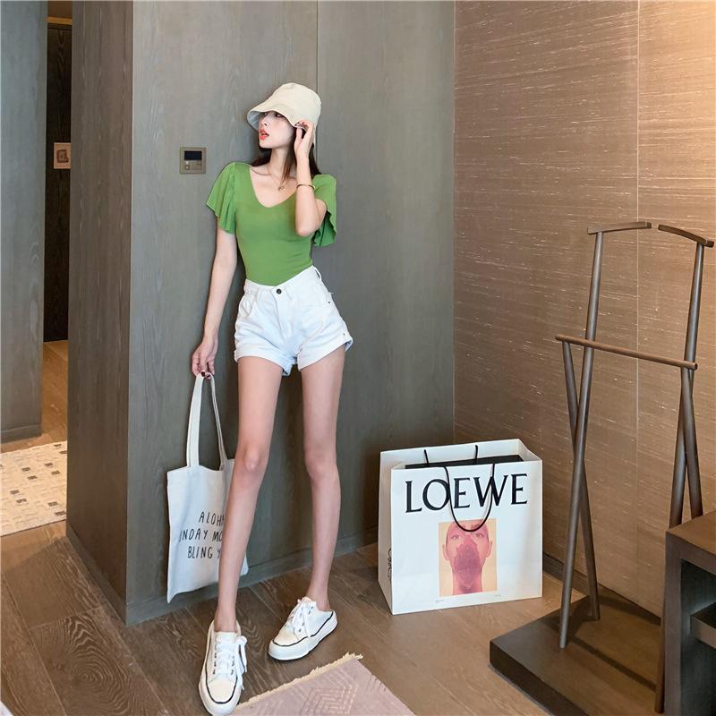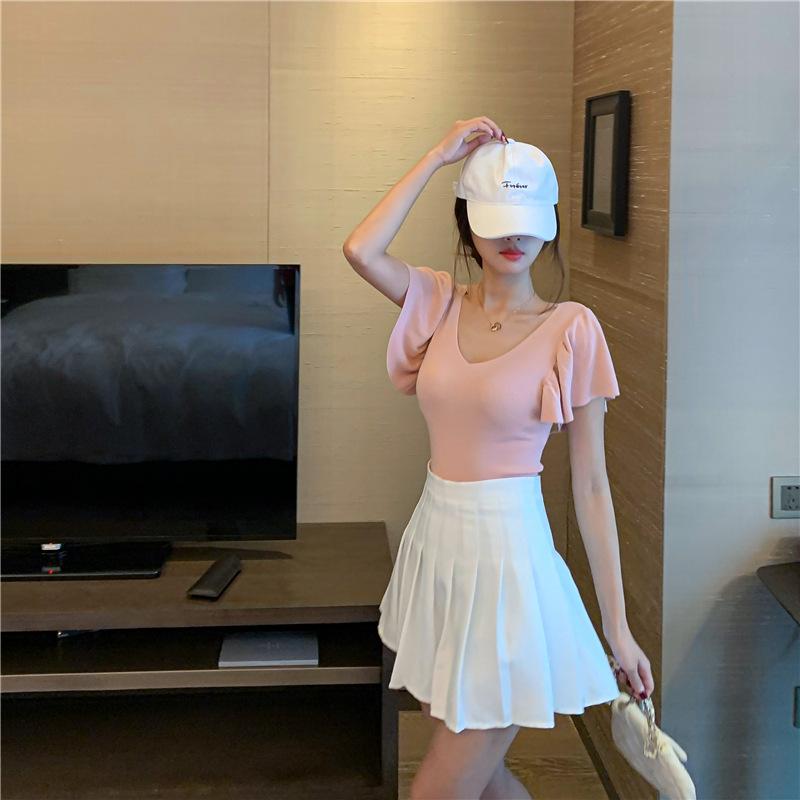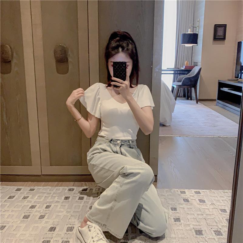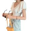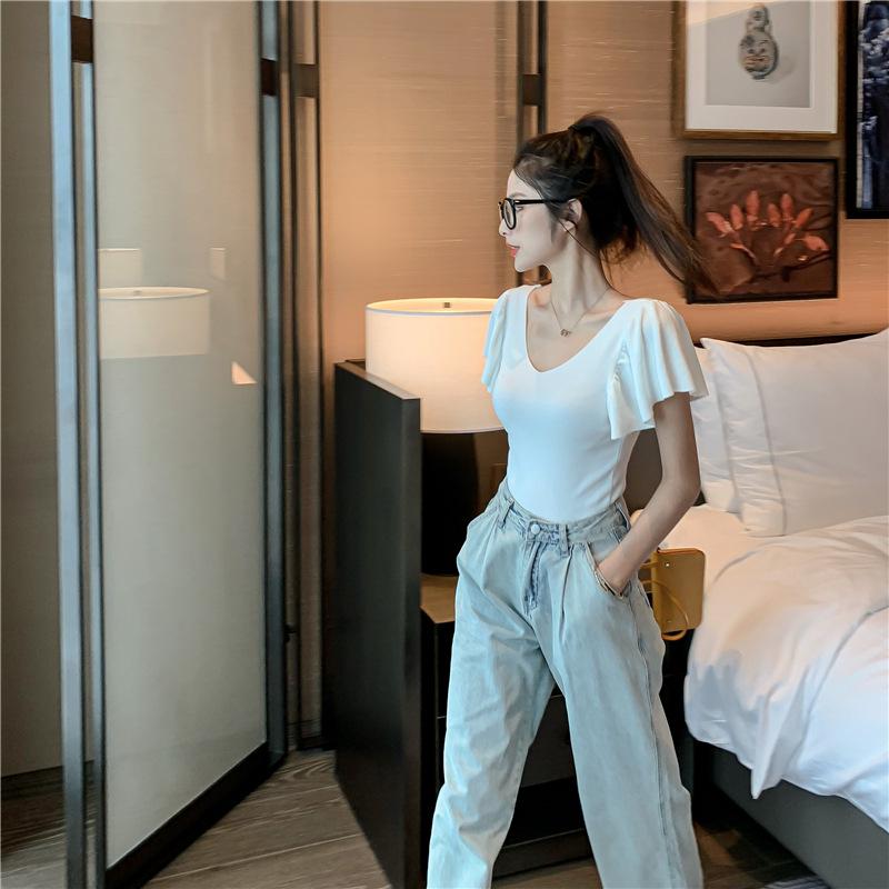 Suéter con cuello en V y mangas de hoja de loto, camiseta básica de manga corta ajustada, ropa de mujer, novedad de verano de 2024