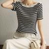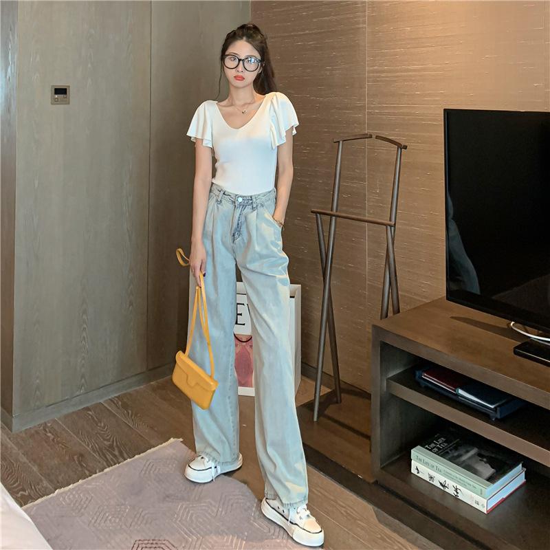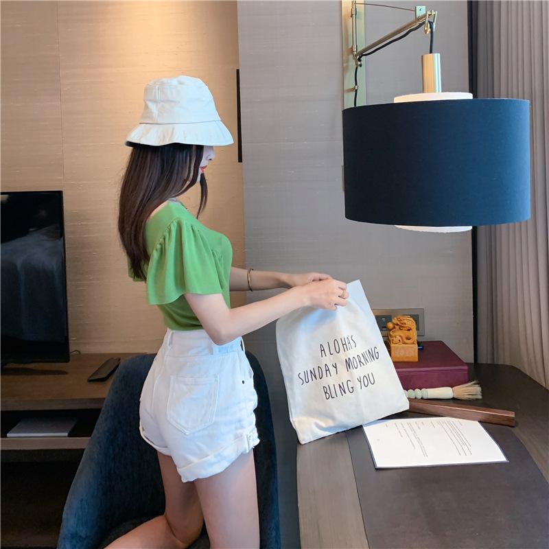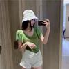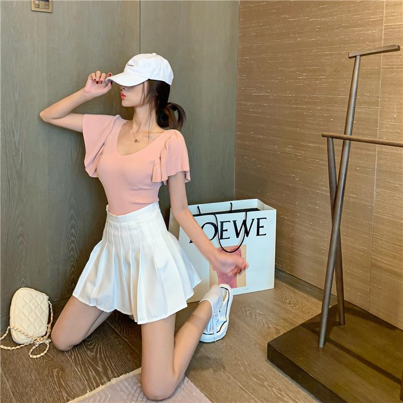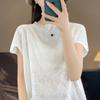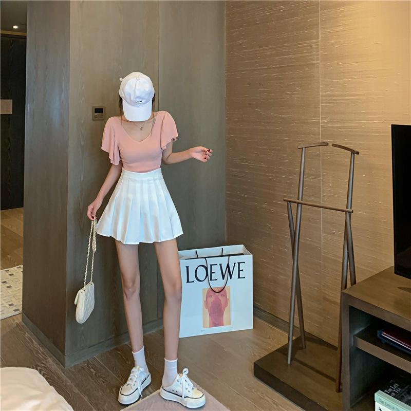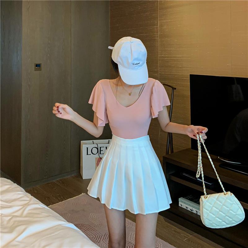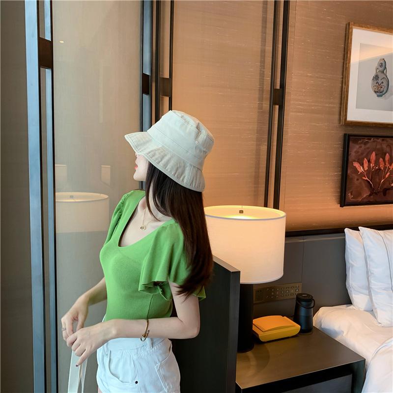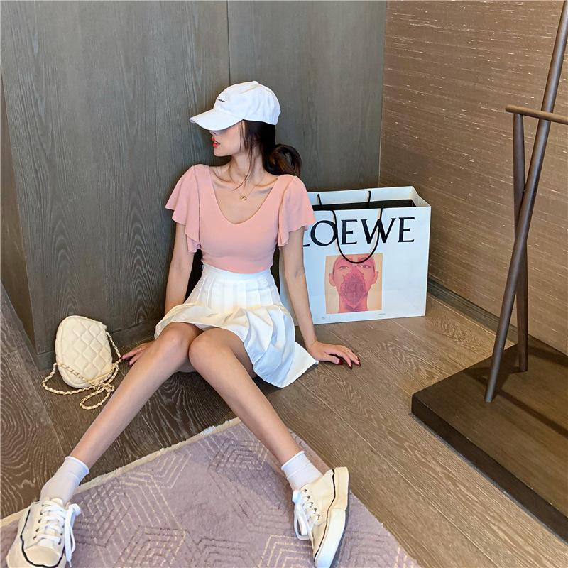Suéter con cuello en V y mangas de hoja de loto, camiseta básica de manga corta ajustada, ropa de mujer, novedad de verano de 2024