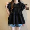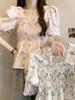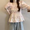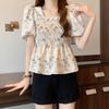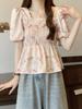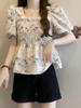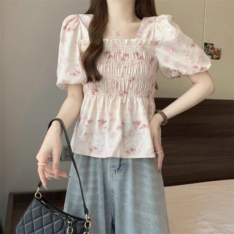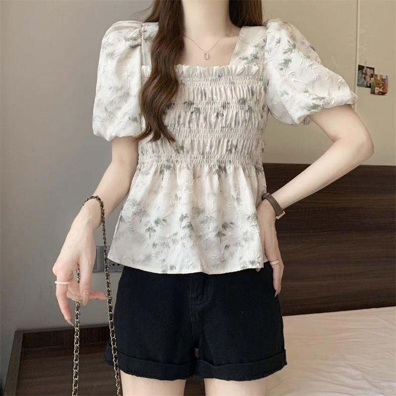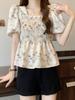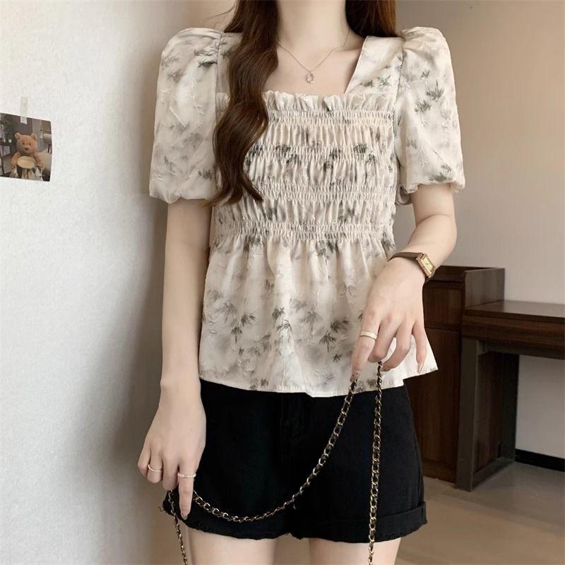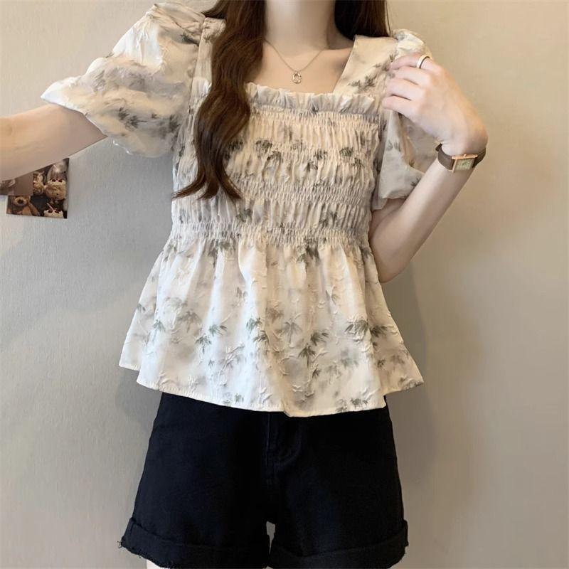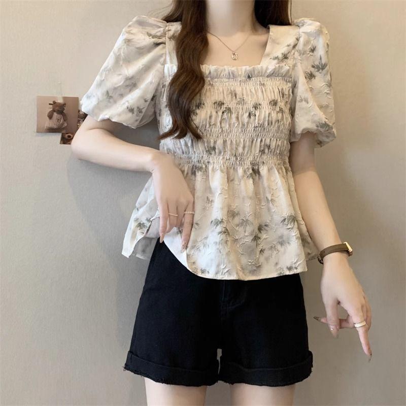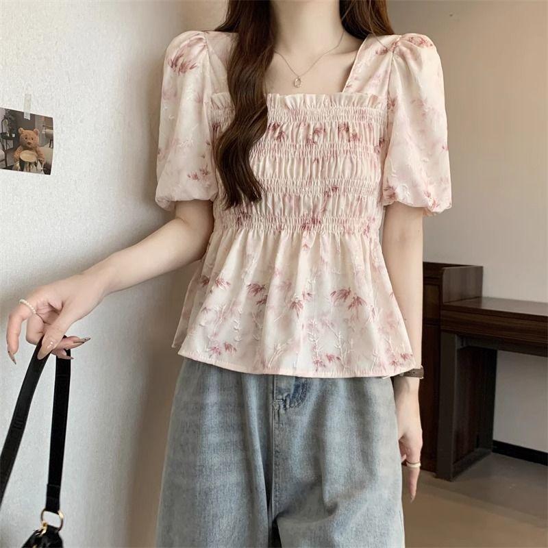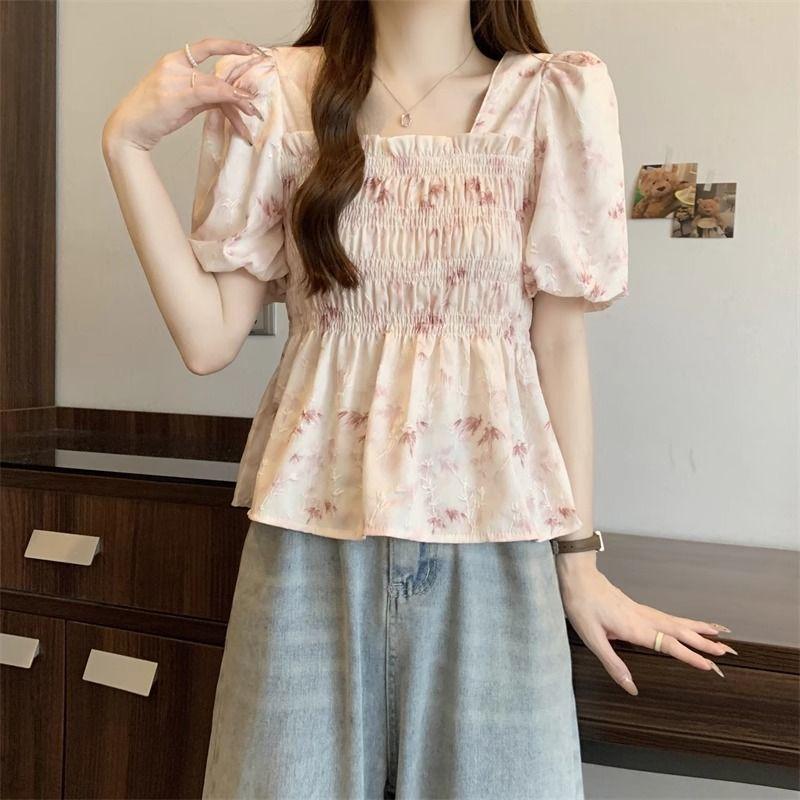 Talla grande Camisa de gasa de manga corta con cuello cuadrado para mujer, diseño de nicho con sentido del diseño para chica gordita, entallada en la cintura, adelgazante, dulce estilo francés, top floral