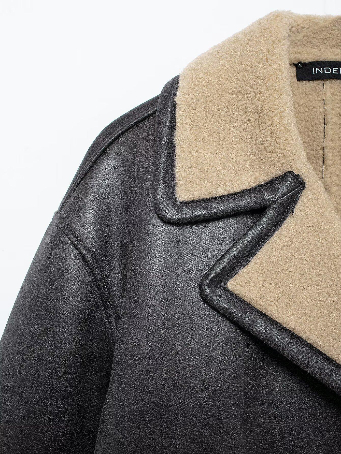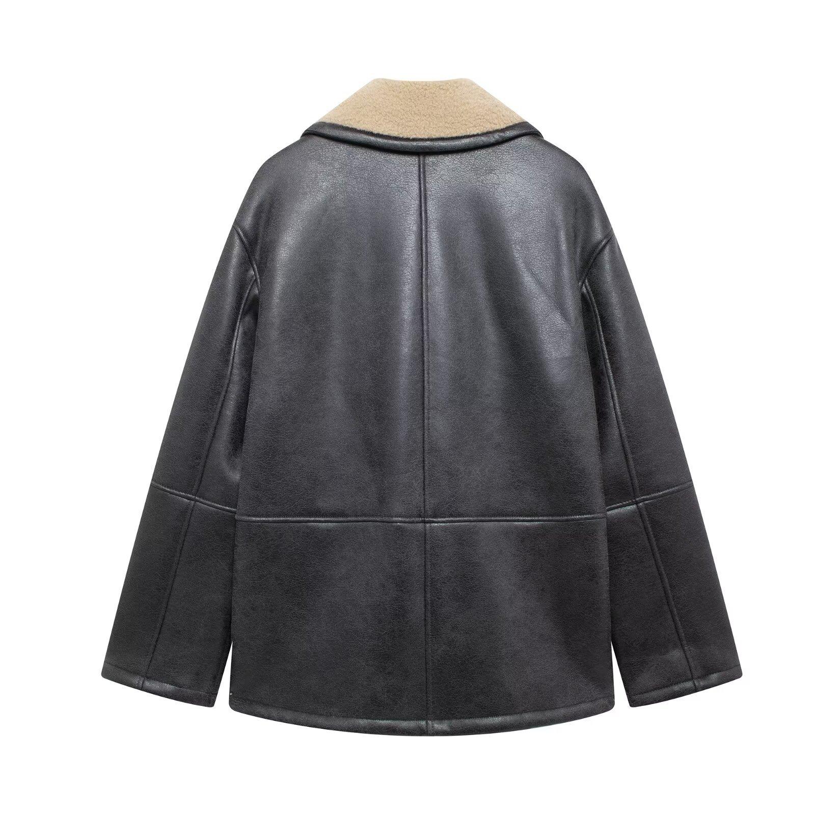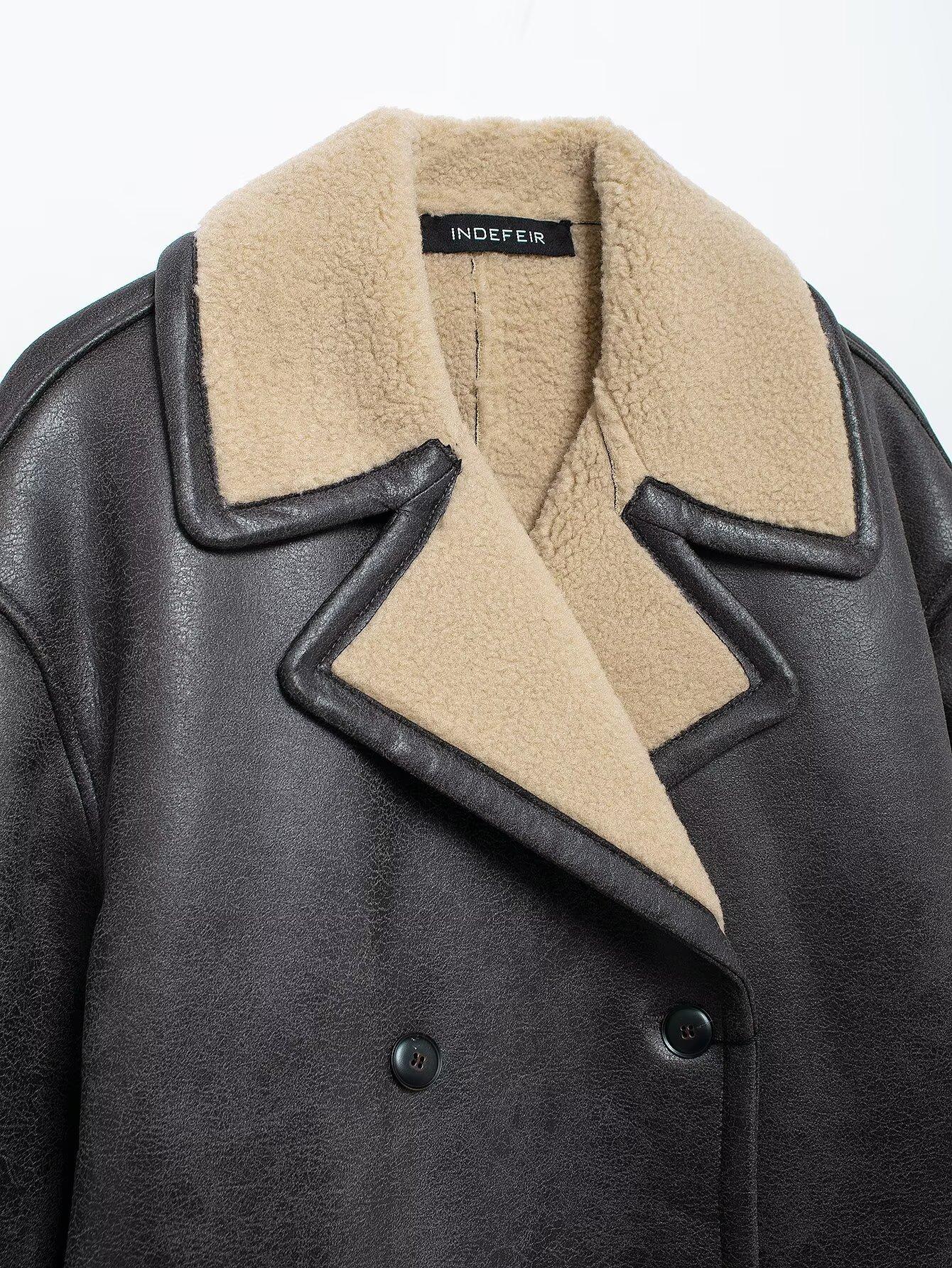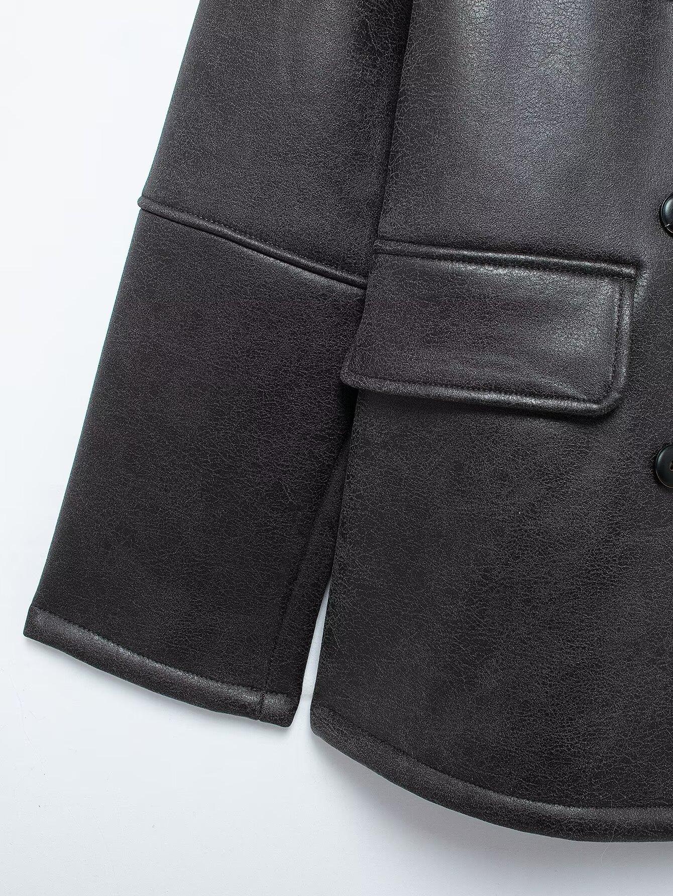 Chaqueta de una pieza de piel con doble botonadura y solapa para mujer, abrigo holgado de piel sintética de estilo europeo y americano de invierno 2024