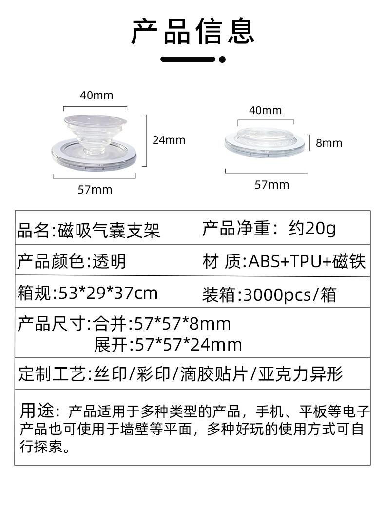 Modo de empleo: Tras recibir el producto,El imán puede estar pegado a la parte inferior del soporte., primero retire el anillo magnético y péguelo en la funda del teléfono, espere de 12 a 24 horas hasta que esté firmemente pegado, ¡luego puede usar directamente el soporte magnético de airbag! Si la funda del teléfono en sí tiene una función magnética, (imán fuerte) se puede usar directamente! La ventaja del producto es que se adsorbe en el teléfono, actúa como soporte para teléfono, soporte de escritorio, se puede girar y estirar al pensar, y también se puede usar como soporte de descompresión, el engranaje telescópico le permite relajarse; admite personalización de logotipo para regalo, una gran cantidad de existencias, producción artesanal, ¡bienvenidos clientes nuevos y antiguos a realizar pedidos!