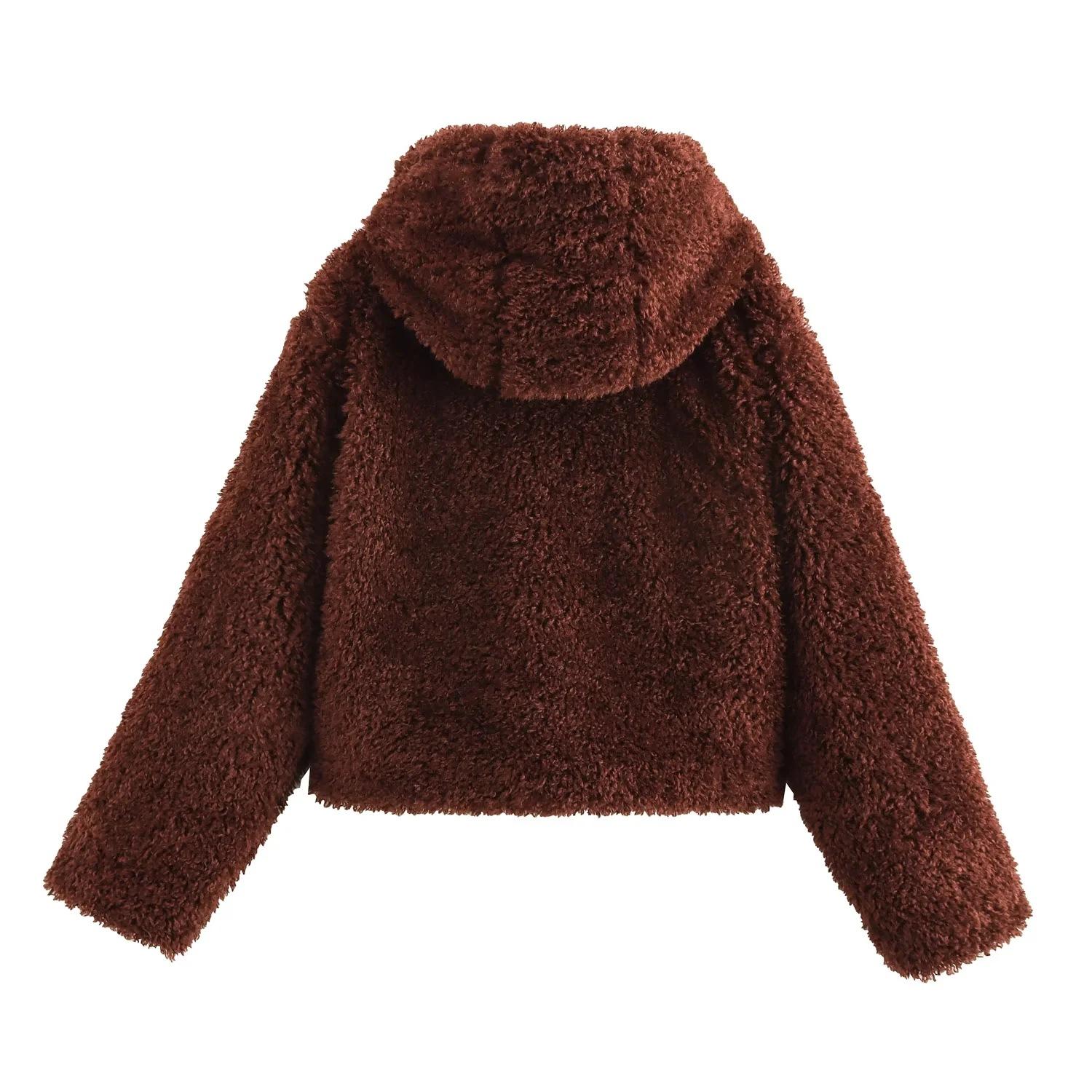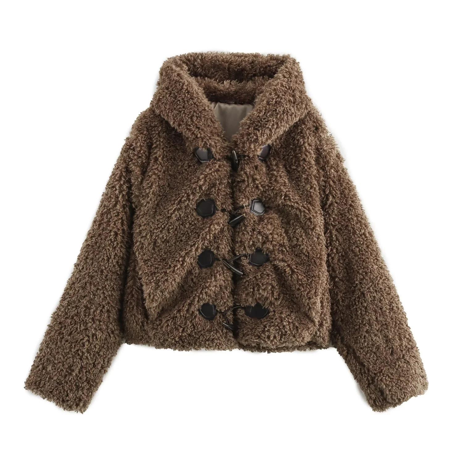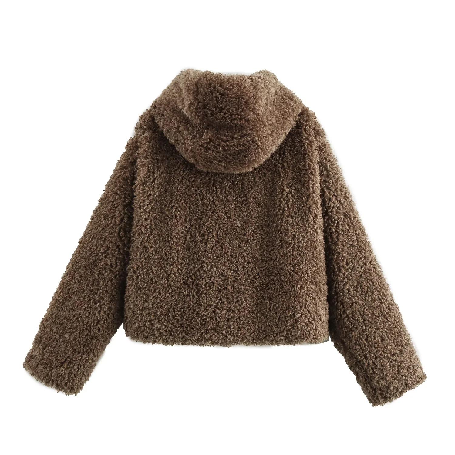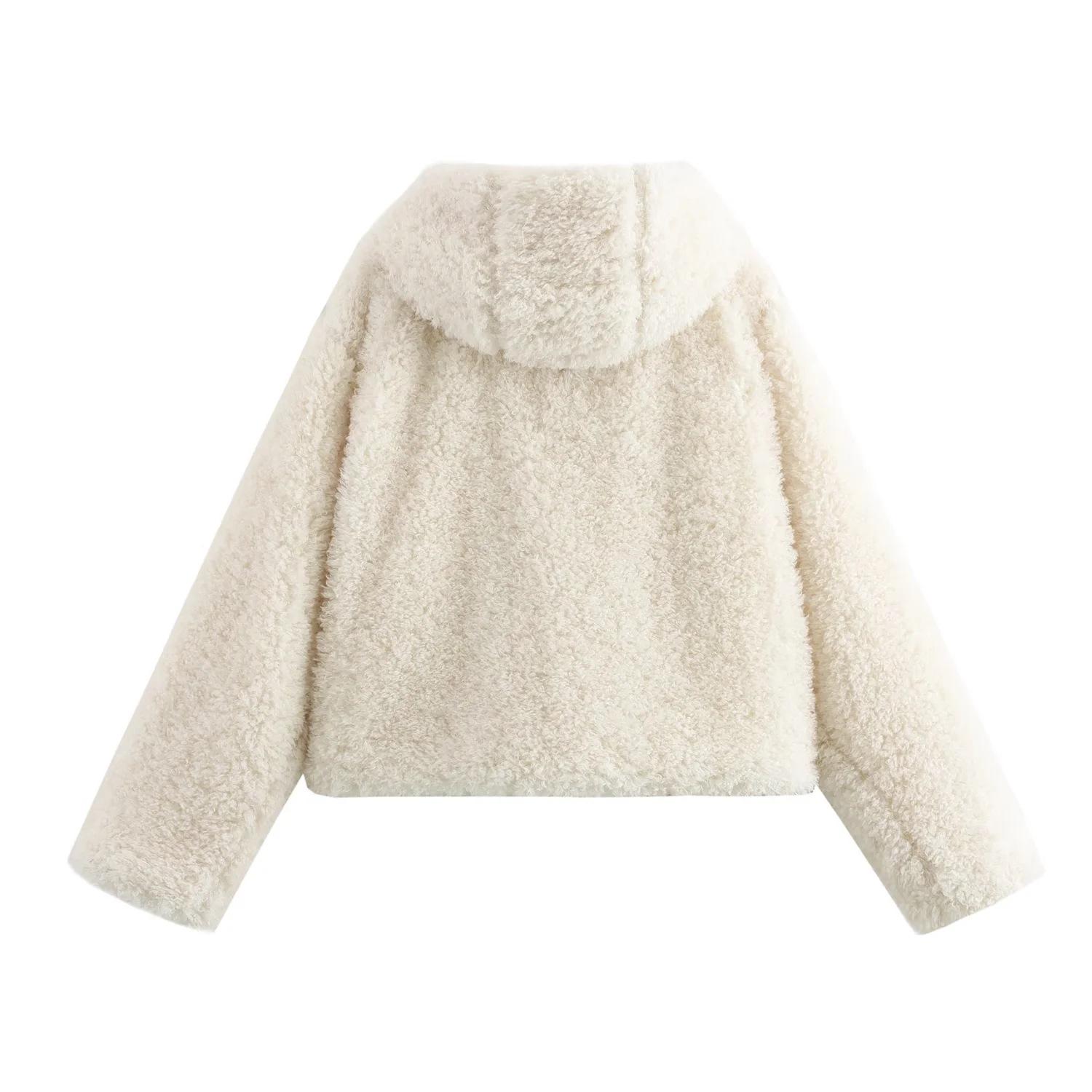 Invierno 2024 nuevo estilo europeo y americano ropa de mujer decoración nudo de cuerda efecto piel sintética abrigo corto combinable abrigo con capucha