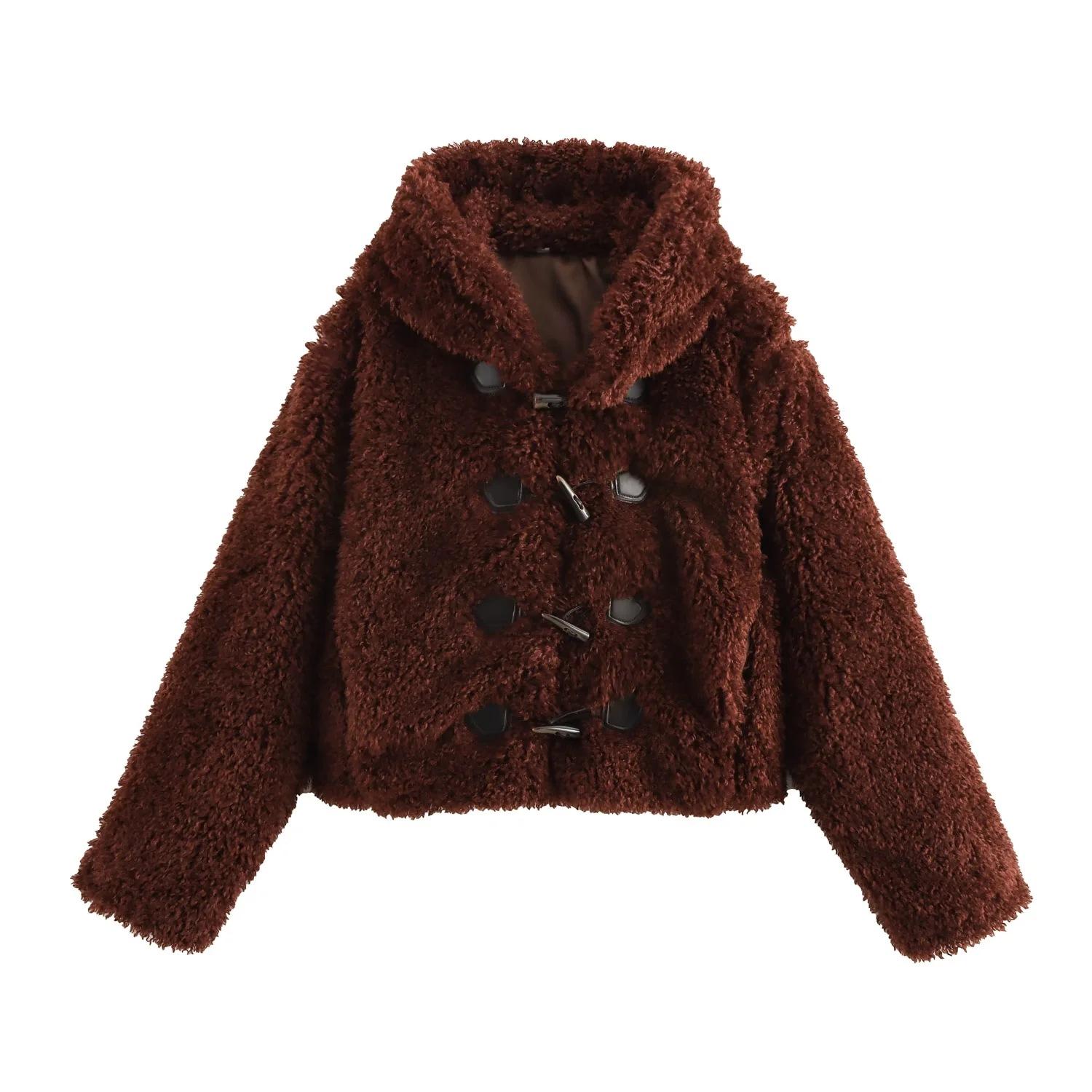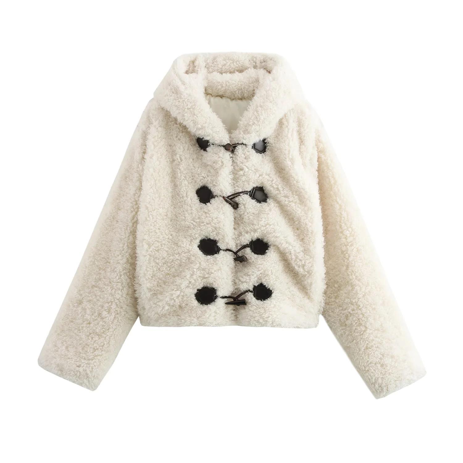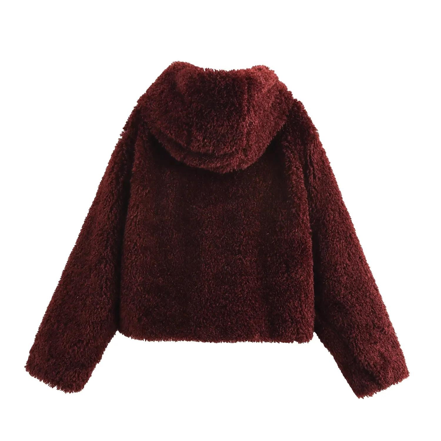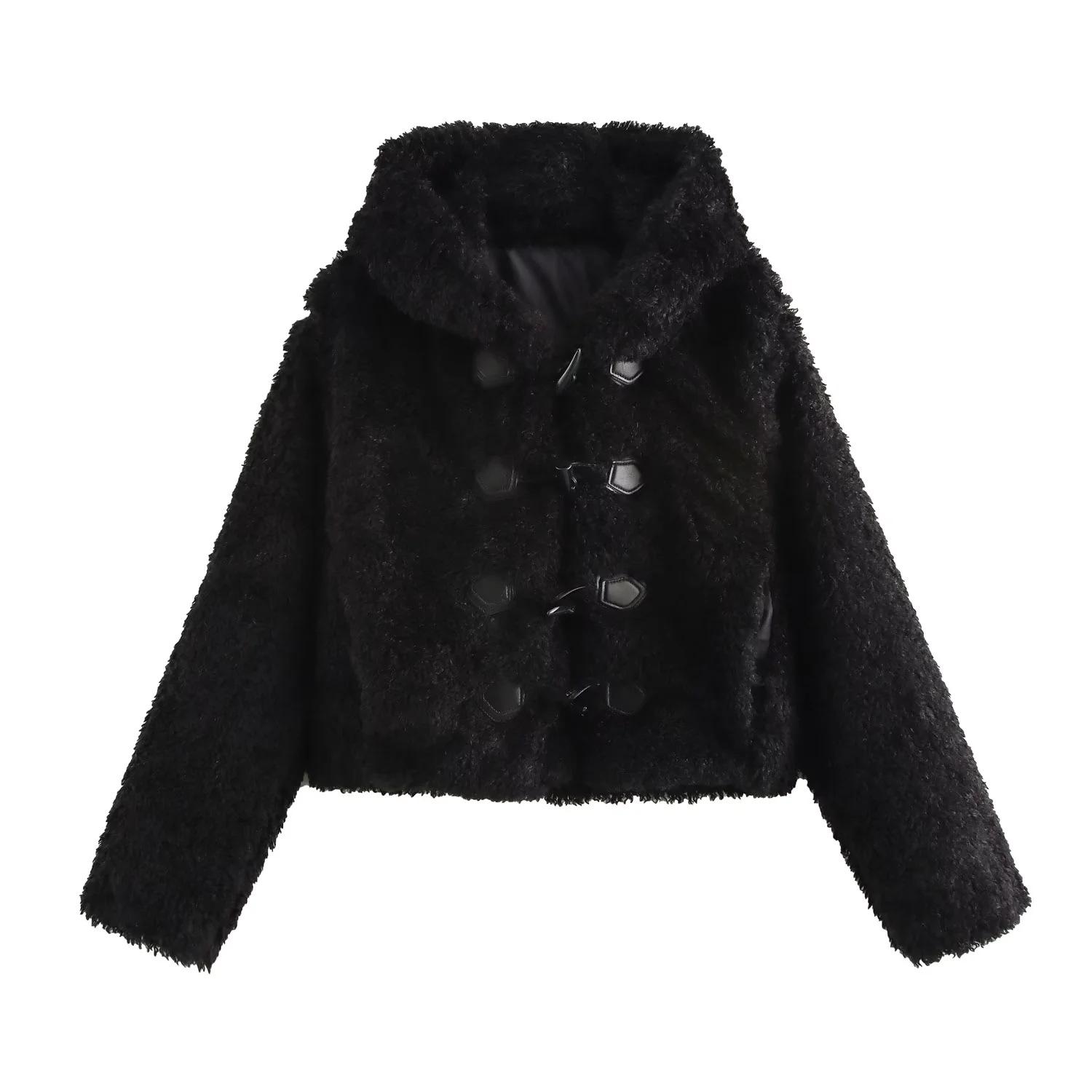 Invierno 2024 nuevo estilo europeo y americano ropa de mujer decoración nudo de cuerda efecto piel sintética abrigo corto combinable abrigo con capucha