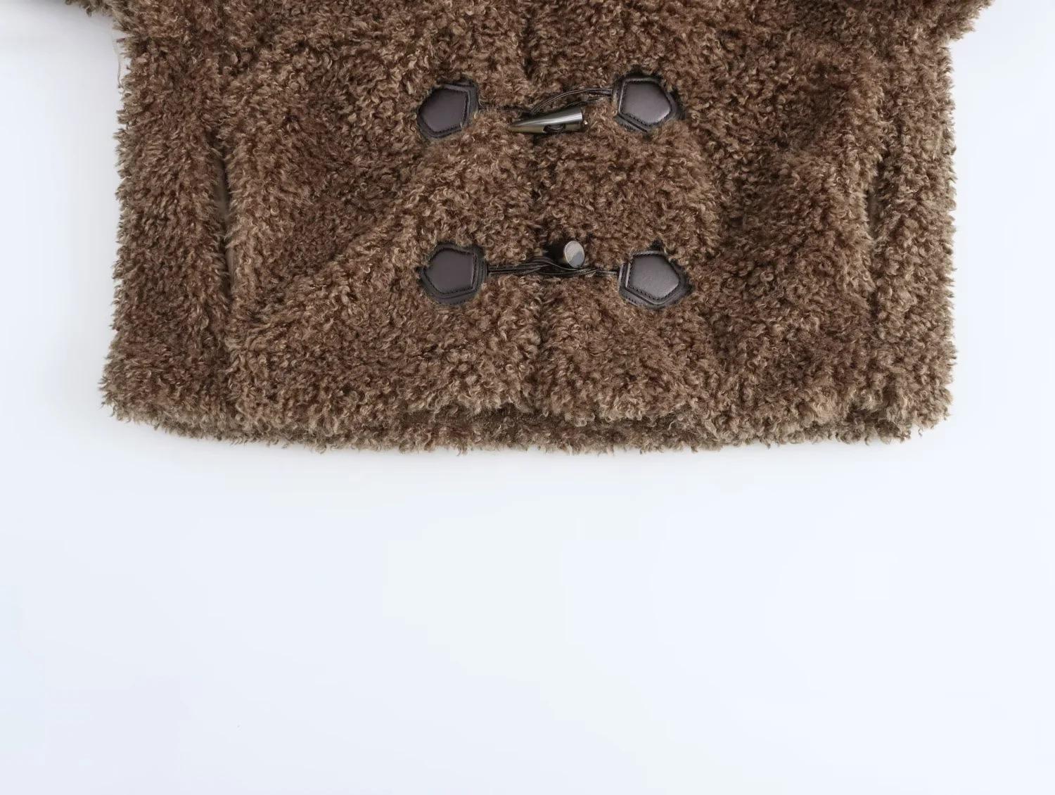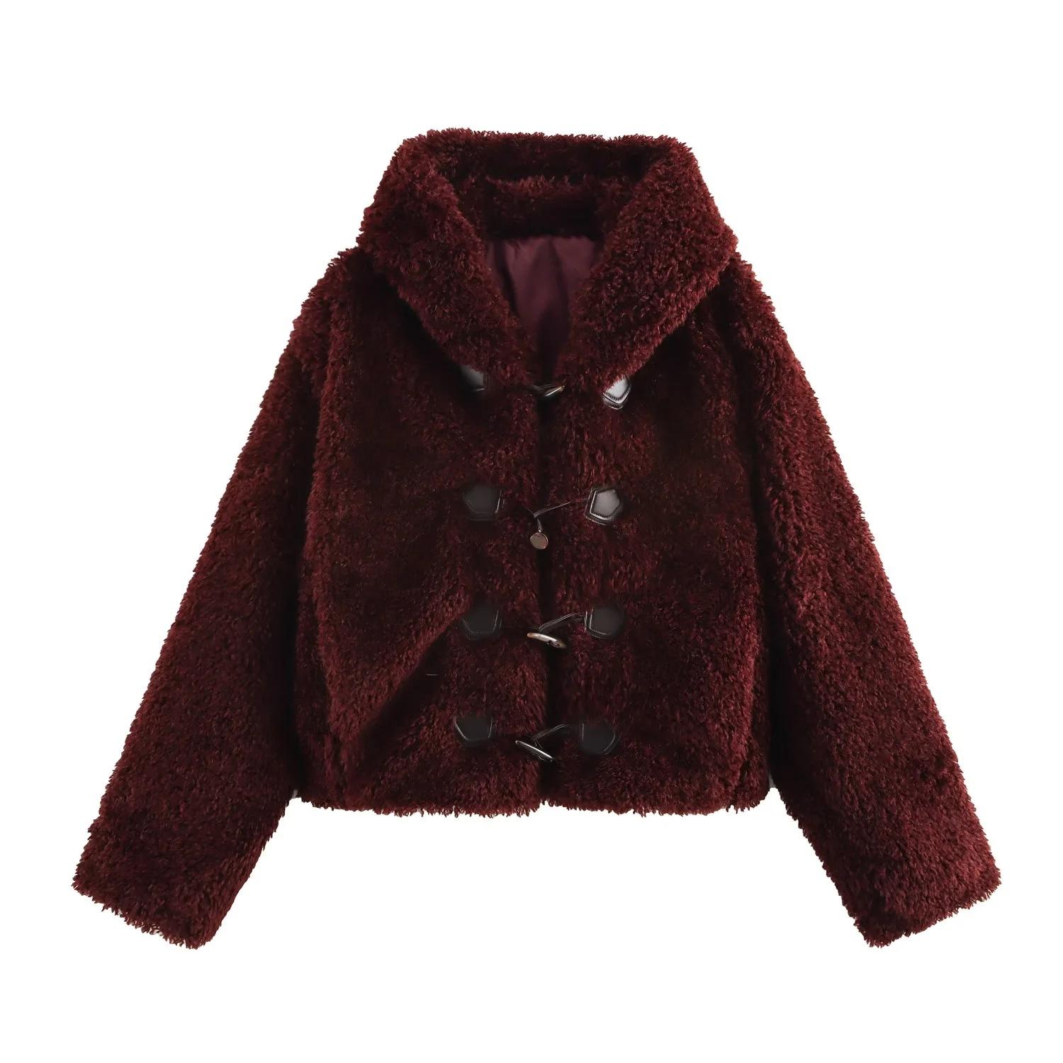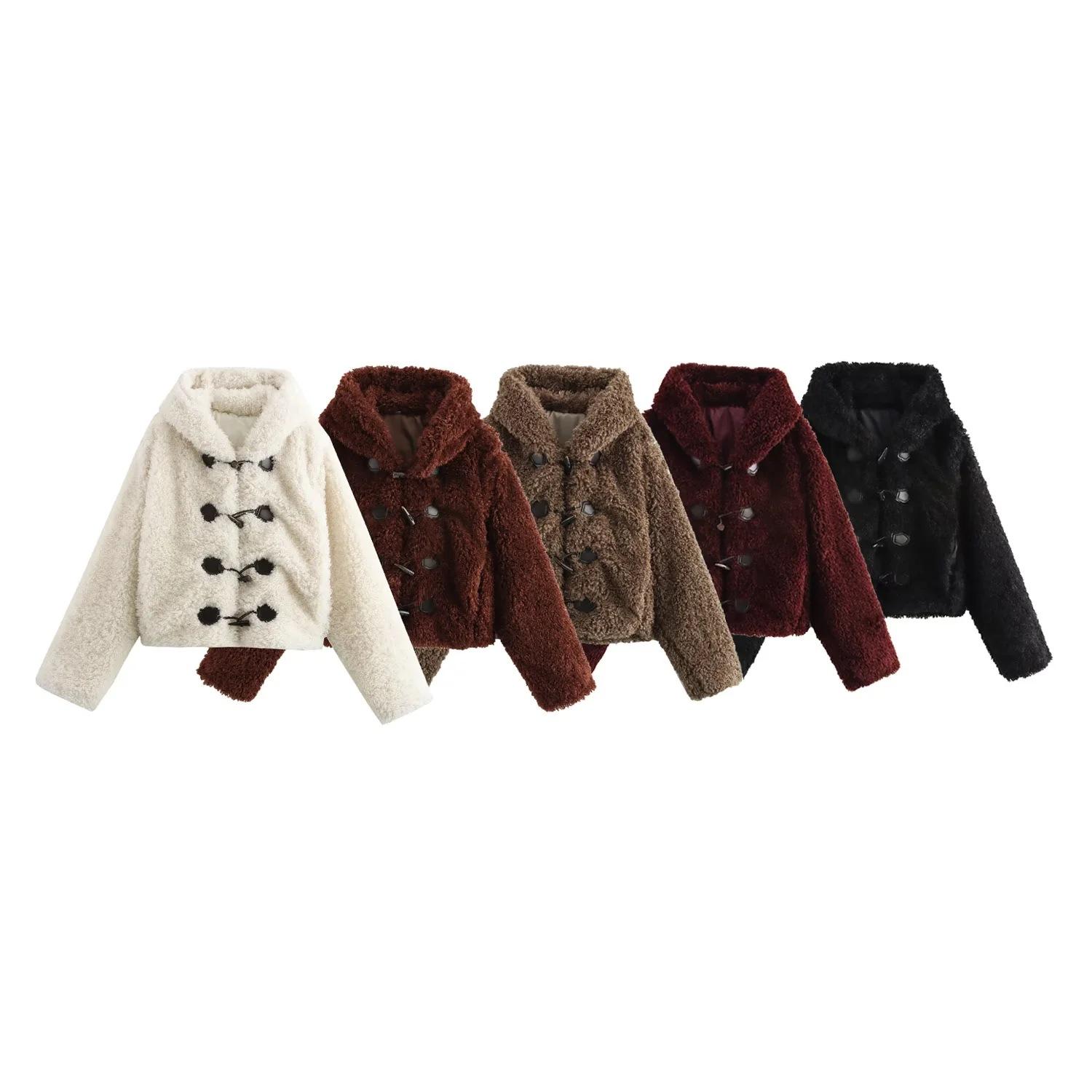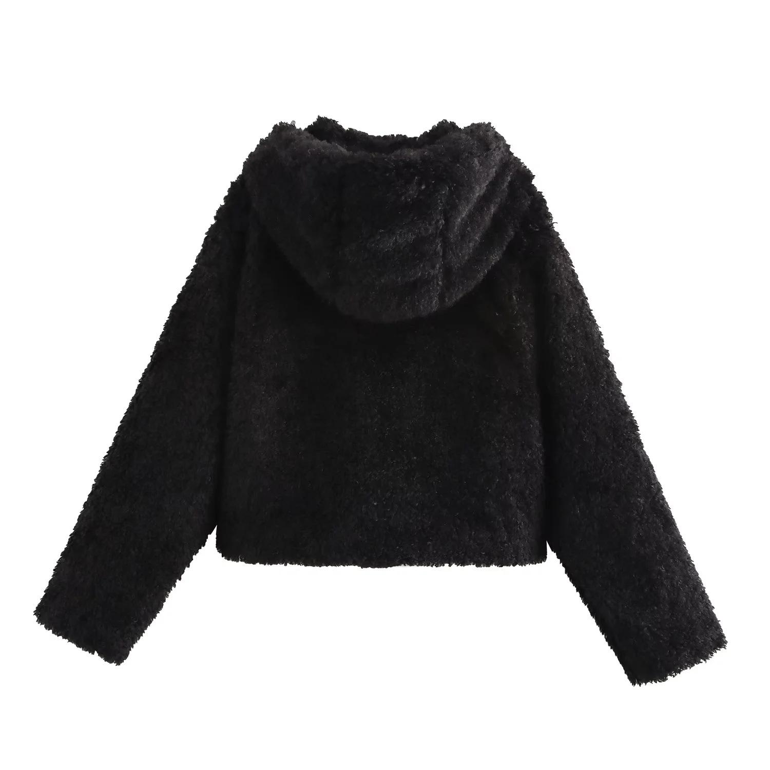 Invierno 2024 nuevo estilo europeo y americano ropa de mujer decoración nudo de cuerda efecto piel sintética abrigo corto combinable abrigo con capucha