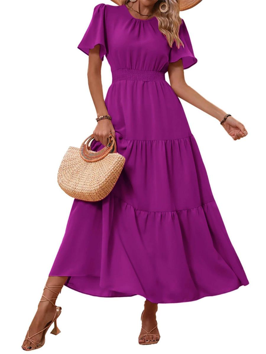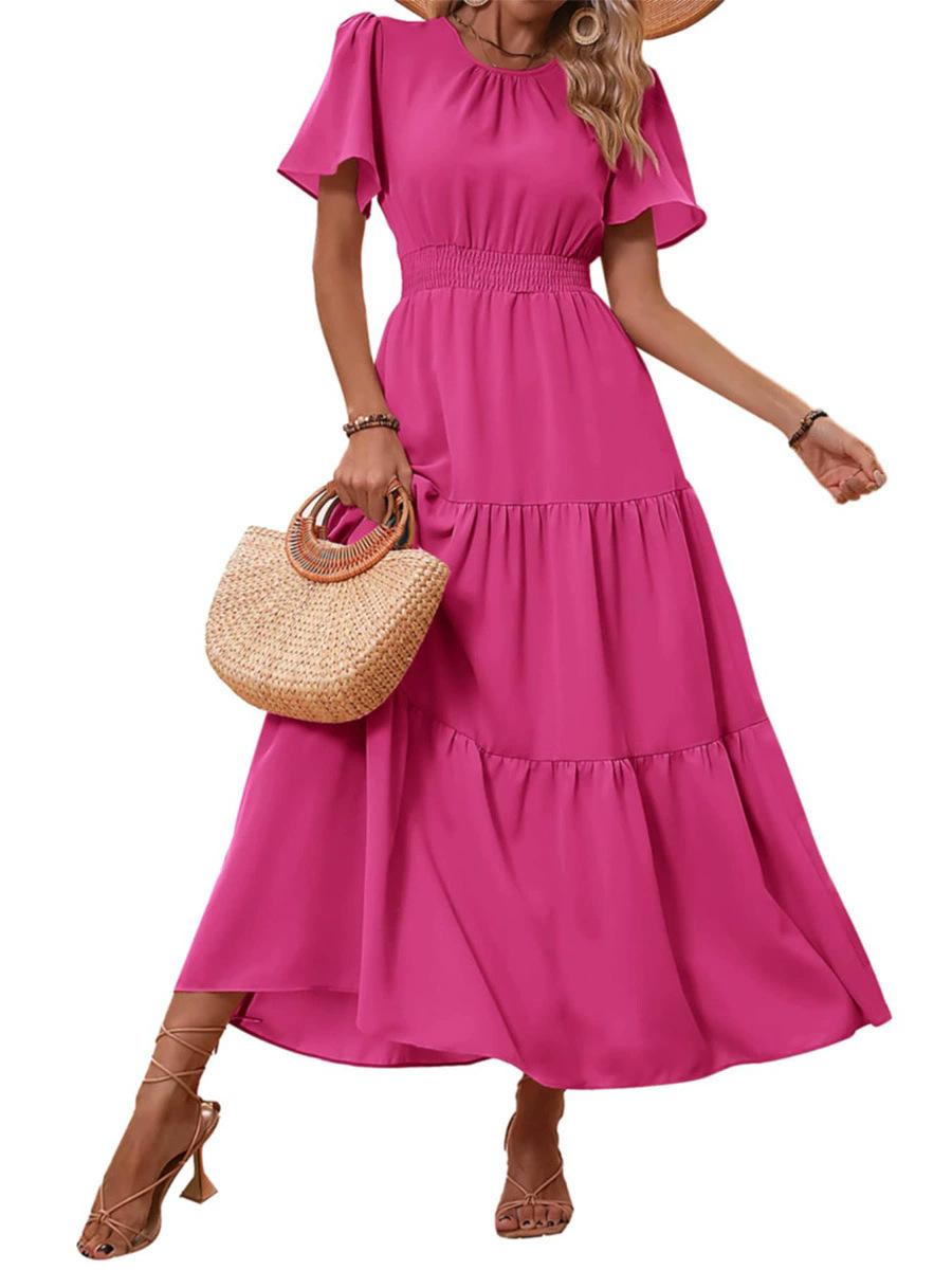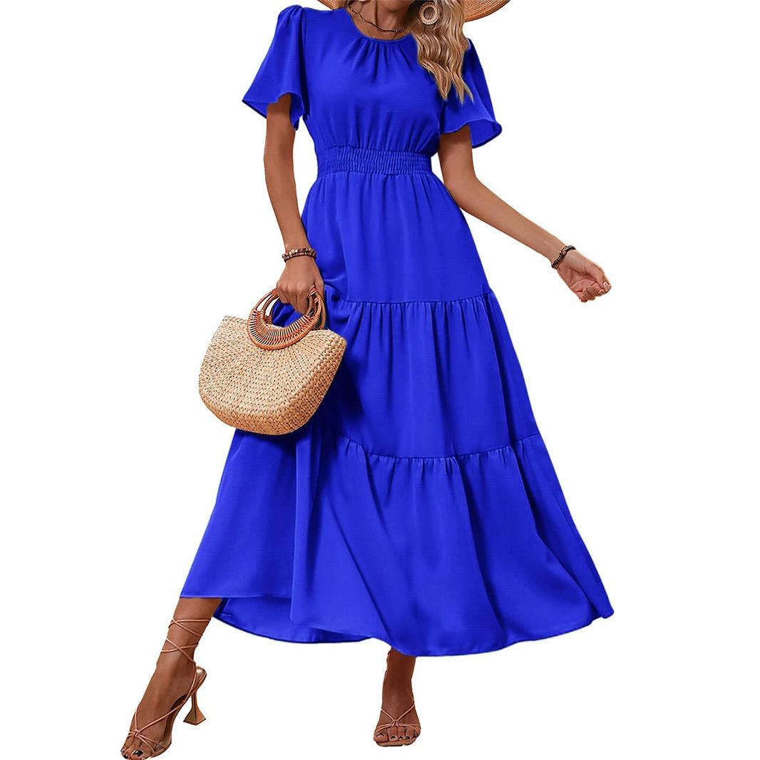 Amazon Europa y Estados Unidos comercio exterior transfronterizo 2025 nuevo cuello redondo color sólido volantes en capas bajo elegante vestido