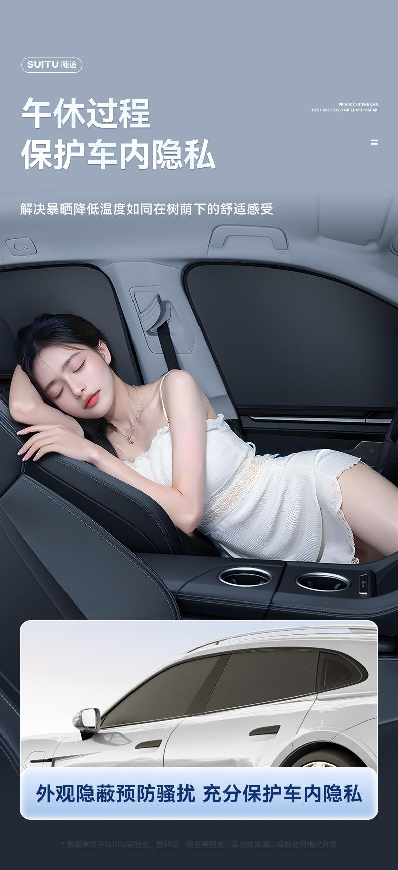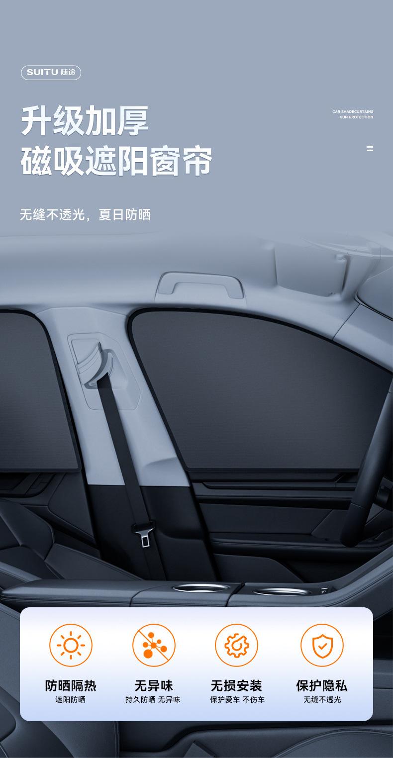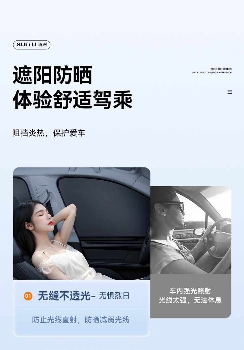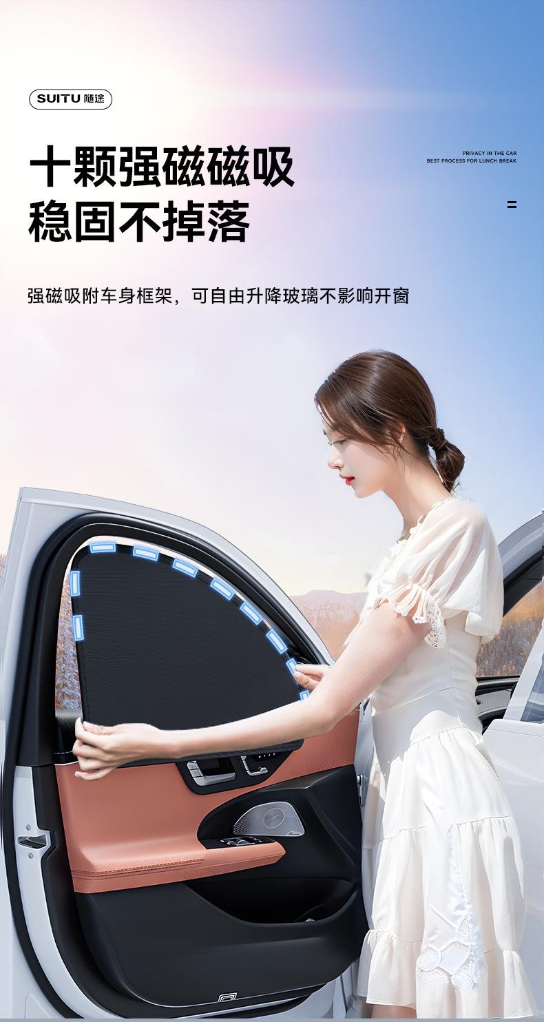 La fuerte luz solar entra directamente por las ventanillas laterales, lo que no solo deslumbra, afecta la conducción y resulta insoportable, sino que la alta temperatura también daña el interior de cuero del coche. Los imanes absorben la tela del parasol, bloqueando eficazmente los rayos ultravioleta y la exposición a altas temperaturas. ¡La adsorción magnética facilita su uso!