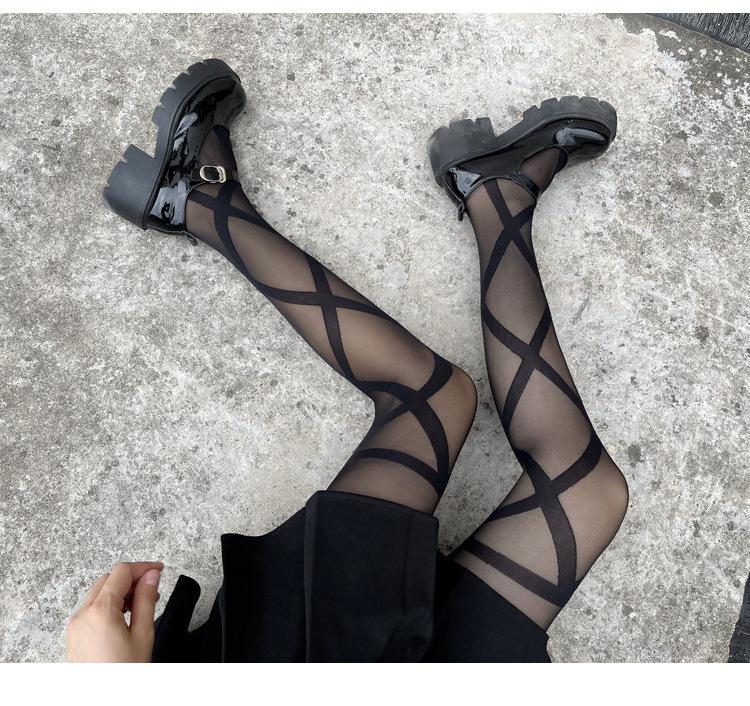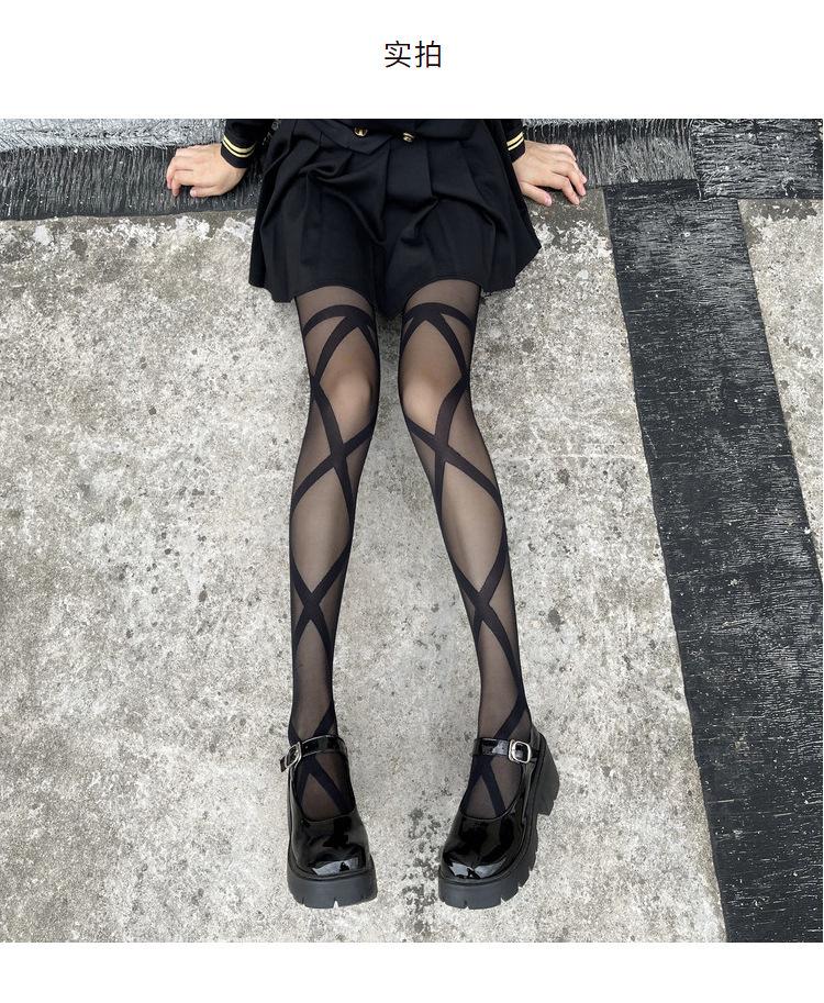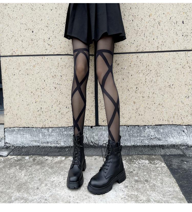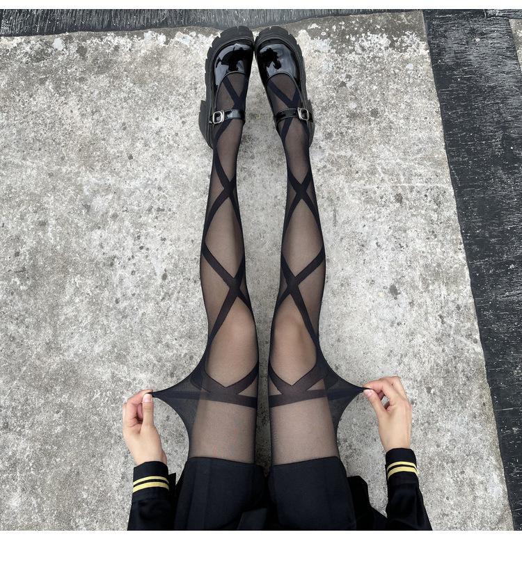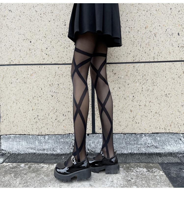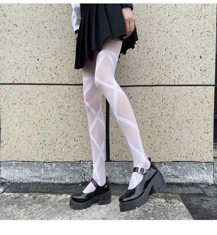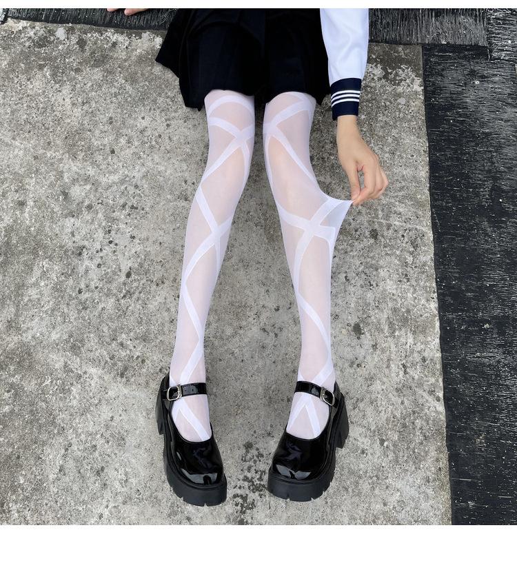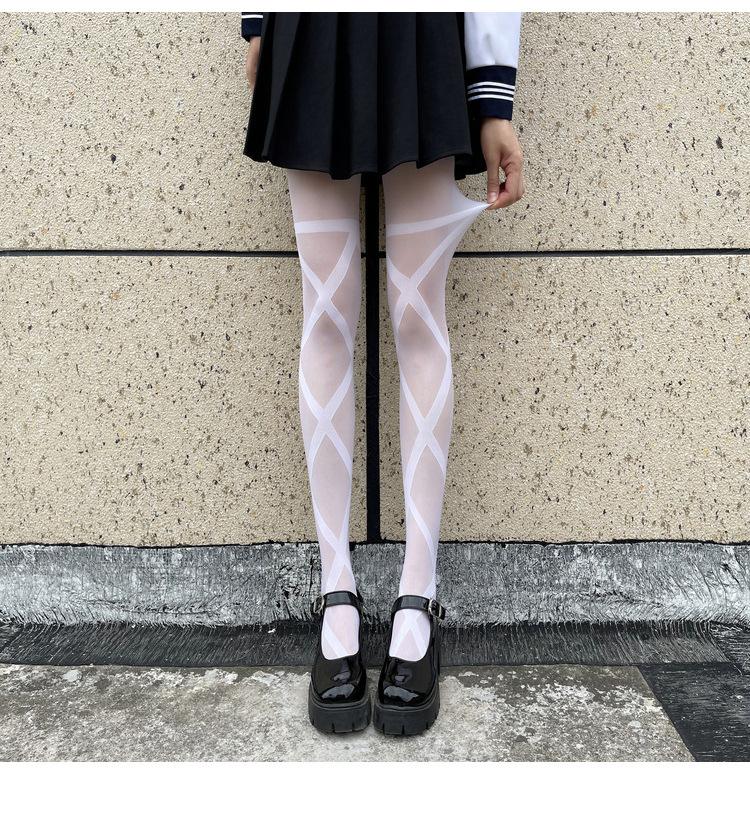 Chicas atractivas con medias de seda negras. Medias sexys con tiras cruzadas para mujer. Primavera y otoño. Medias de seda blanca JK con tiras negras. Medias de moda.