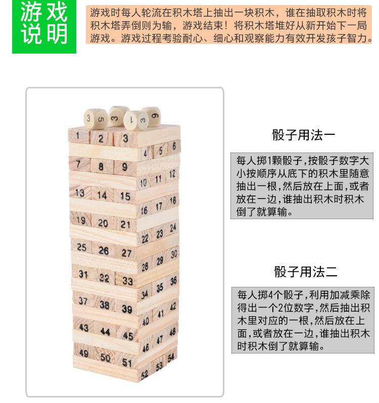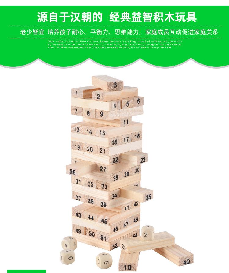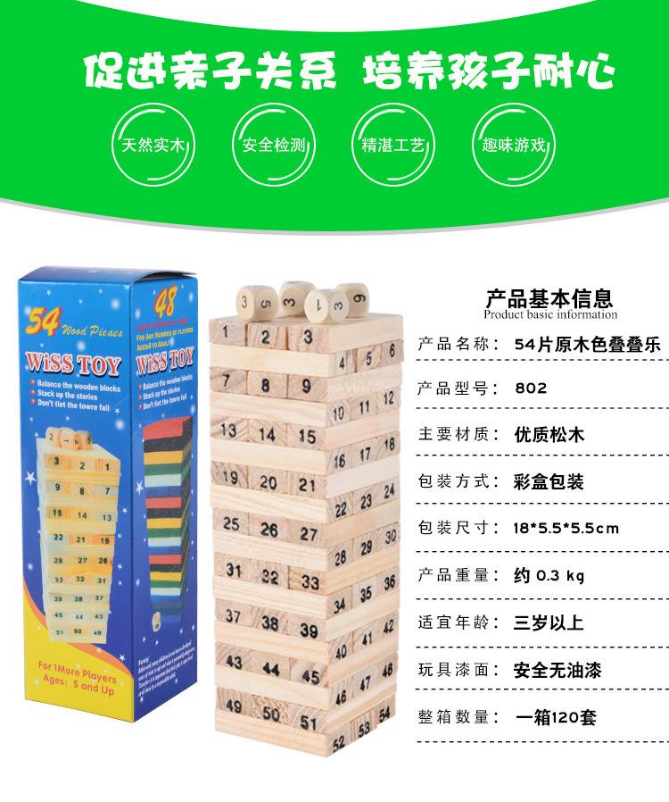 Apilar es un nuevo juego de rompecabezas popular, que puede ser jugado por una persona o por más de dos personas. Este juego puede hacerte sentir la sensación de "sacar leña del fondo de la olla". No solo tienes que extraer hábilmente madera del fondo del ya precario "edificio", sino que también debes colocarla cuidadosamente en la parte superior del edificio. Este producto no solo puede ejercitar la coordinación ojo-mano y la fuerza de voluntad de las personas, sino también cultivar el equilibrio. Al mismo tiempo, el proceso de construir bloques también puede mejorar la paciencia y el autocontrol, y puede ejercitar la aplicación flexible de los músculos de la mano. Lo más importante es que puede mejorar la amistad y las emociones de los jugadores.