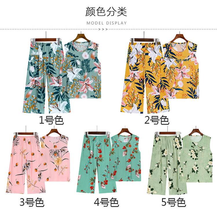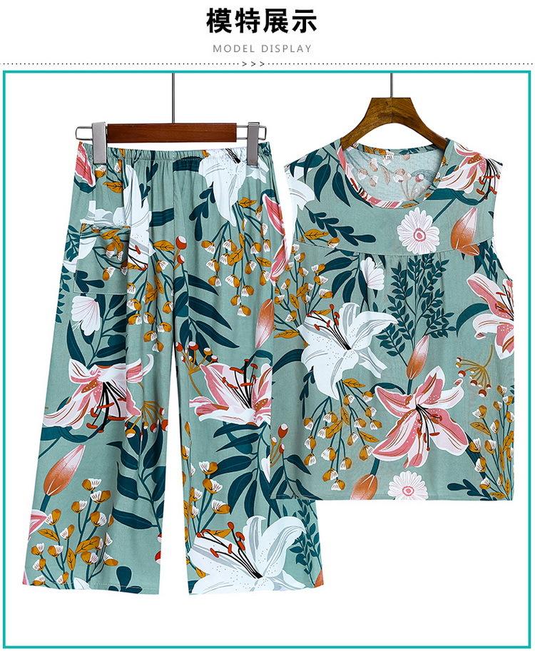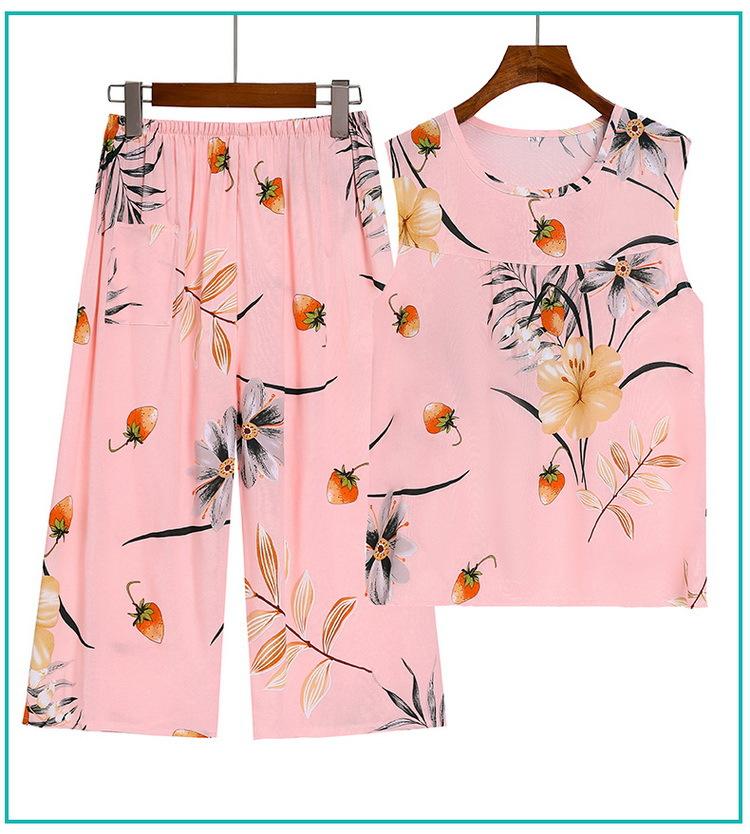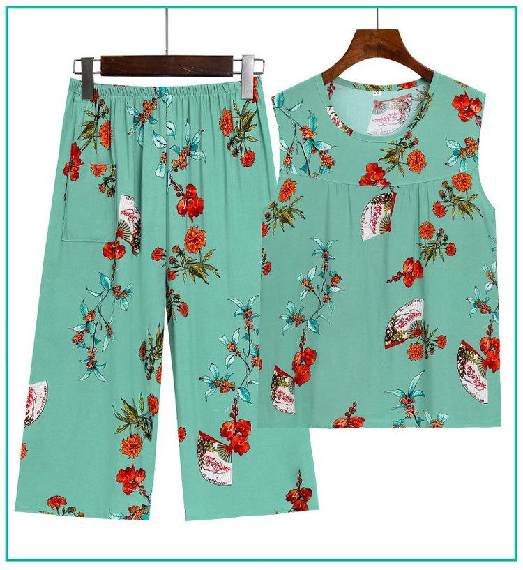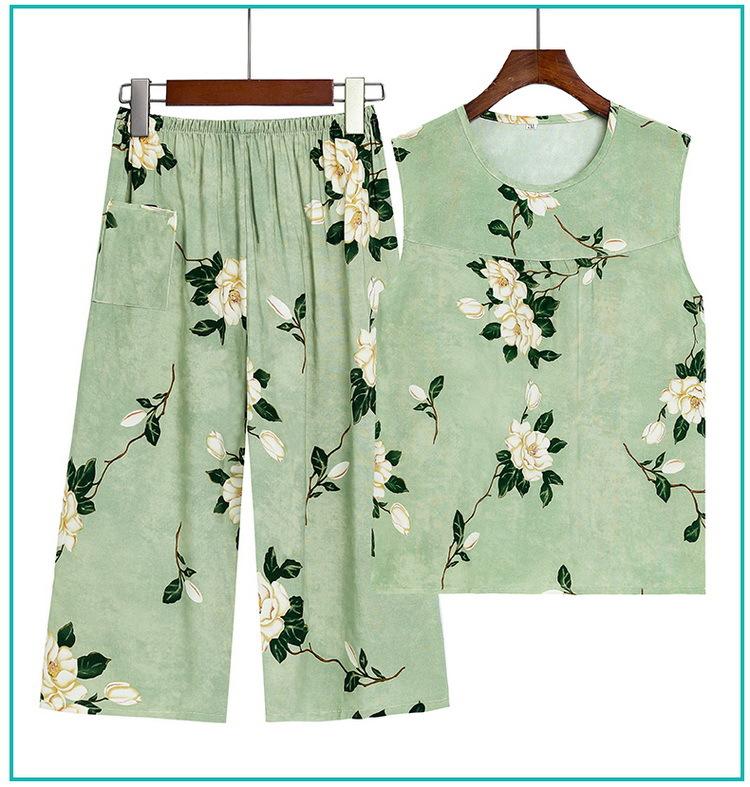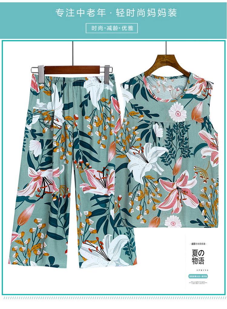 Pijama de dos piezas sin mangas de algodón y seda para mujer de verano, para madres de mediana edad y mayores, de algodón artificial, holgado y fino, para estar en casa.