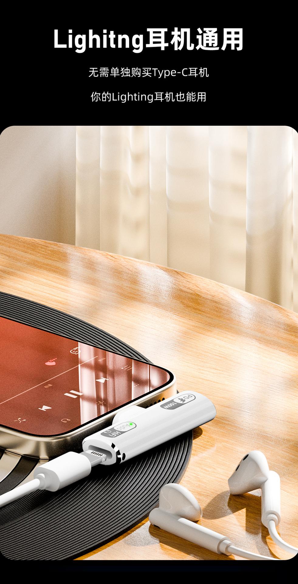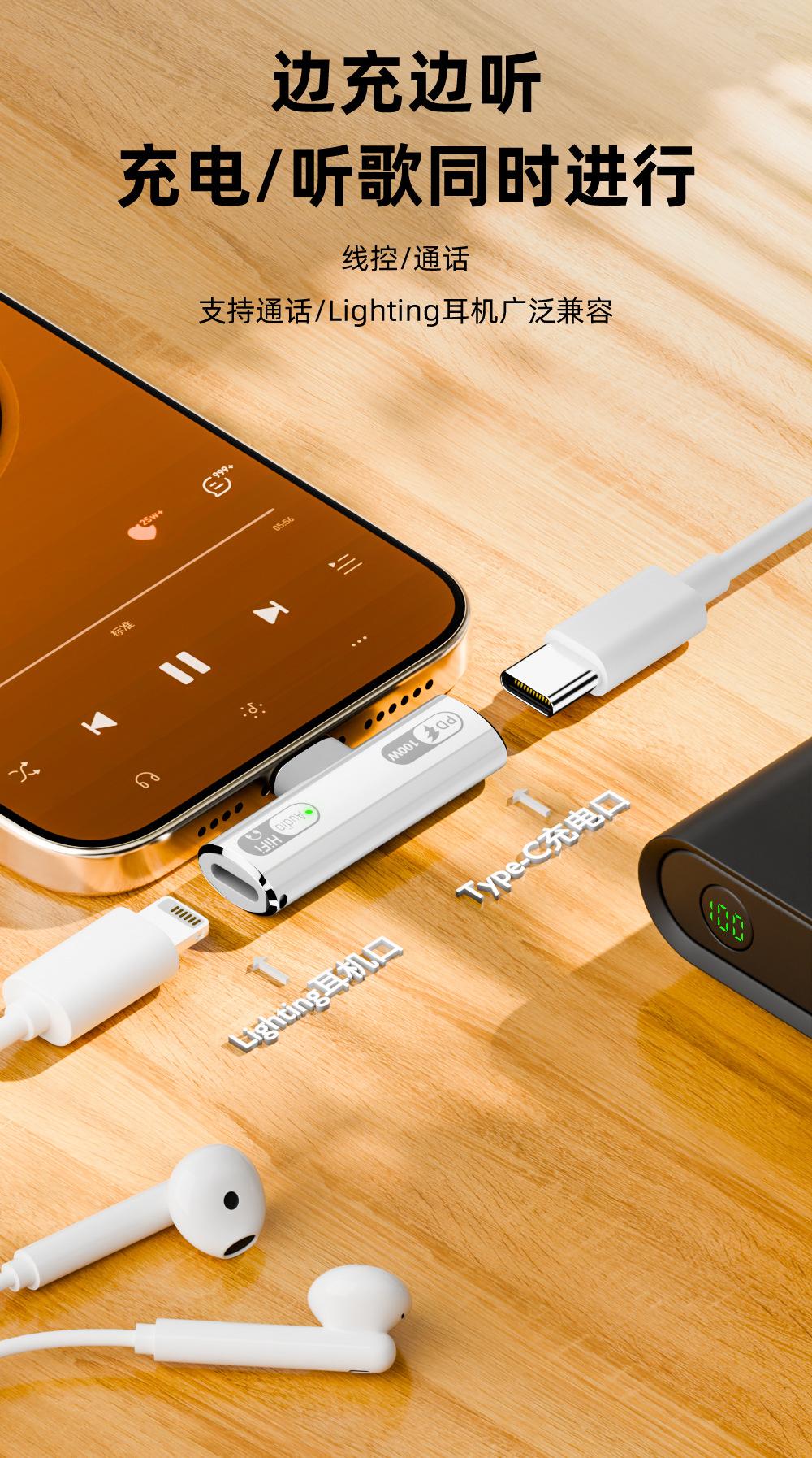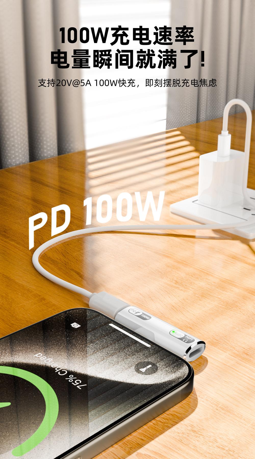 Nuevo adaptador USB-C transfronterizo PD100w apto para cargar auriculares Lightning a TypeC para escuchar música