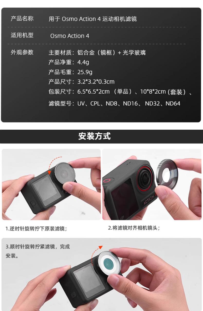 Cámara de movimiento con filtro Dajiang Action5pro/4, polarizador CPL, ND8/16/32/64, compatible