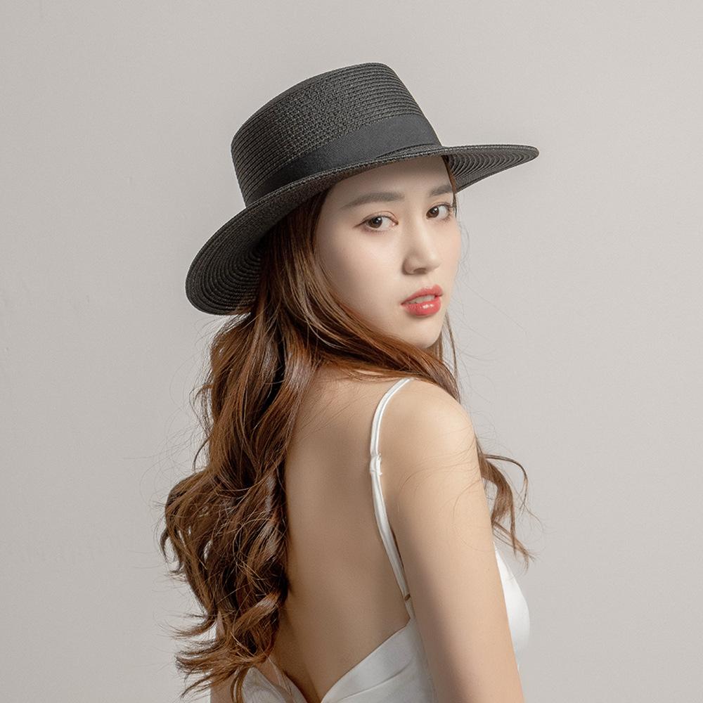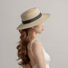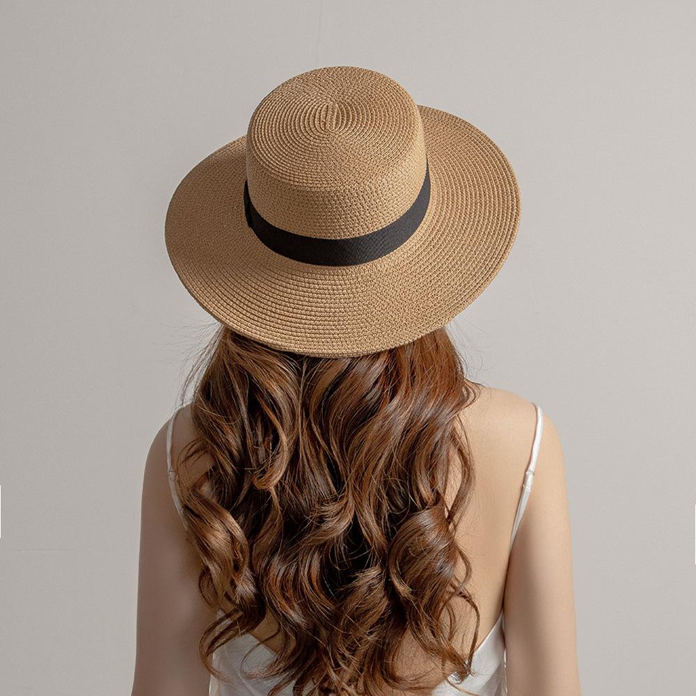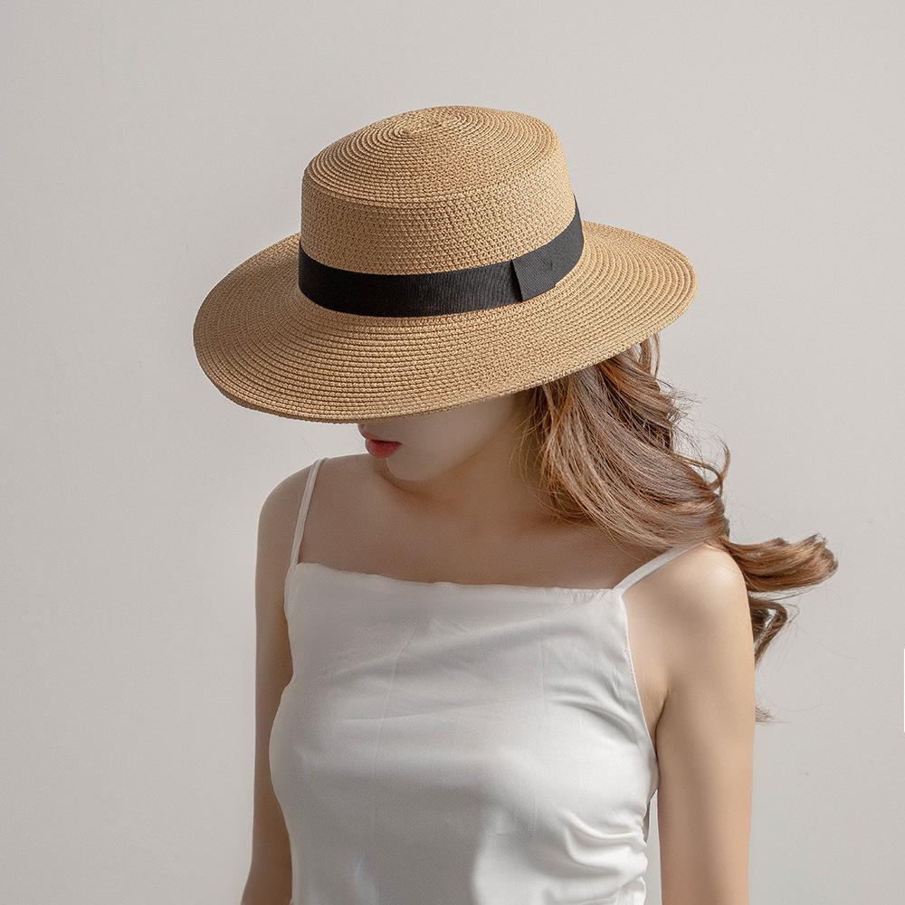 Sombrero de paja de papel con parte superior plana y cinta ancha informal de moda para mujer, sombrero de paja con protección solar para viajes al aire libre, de primavera y verano, a la moda.