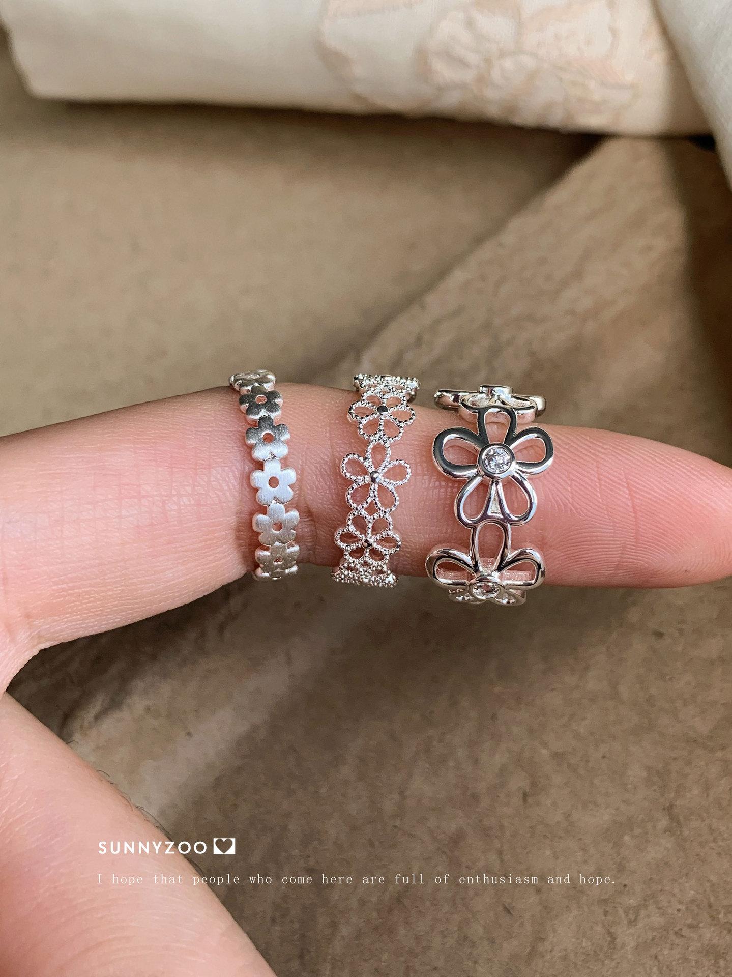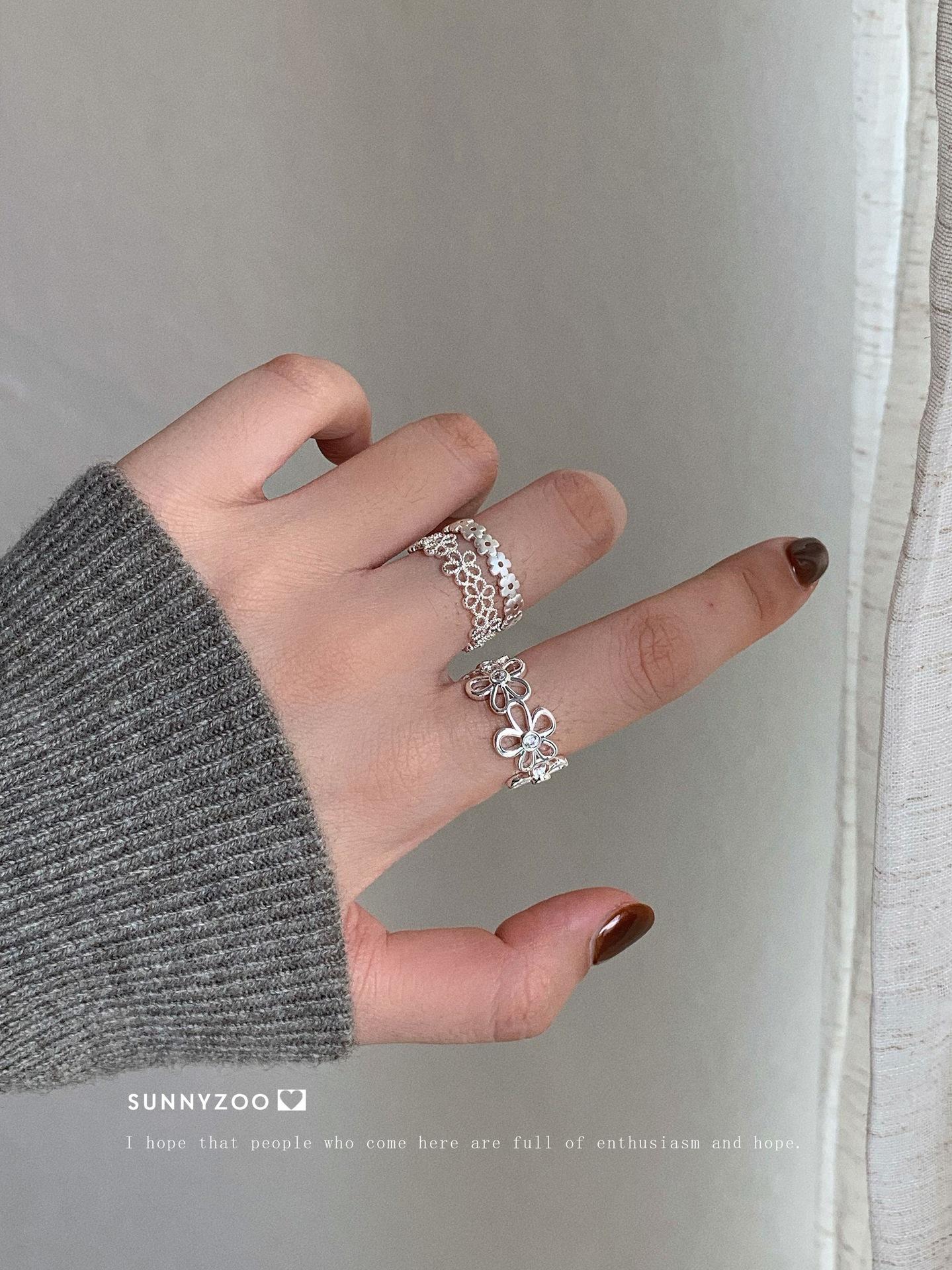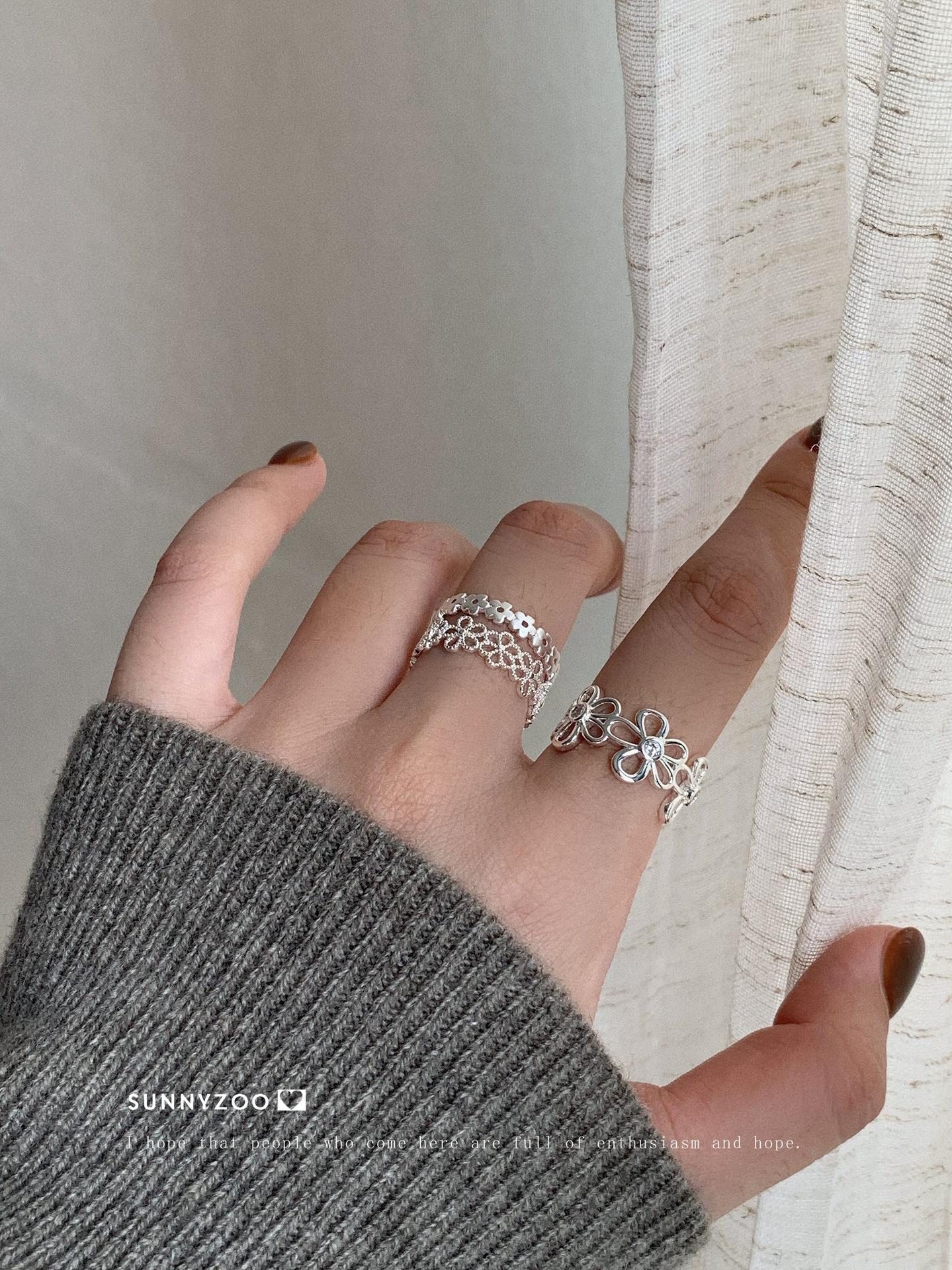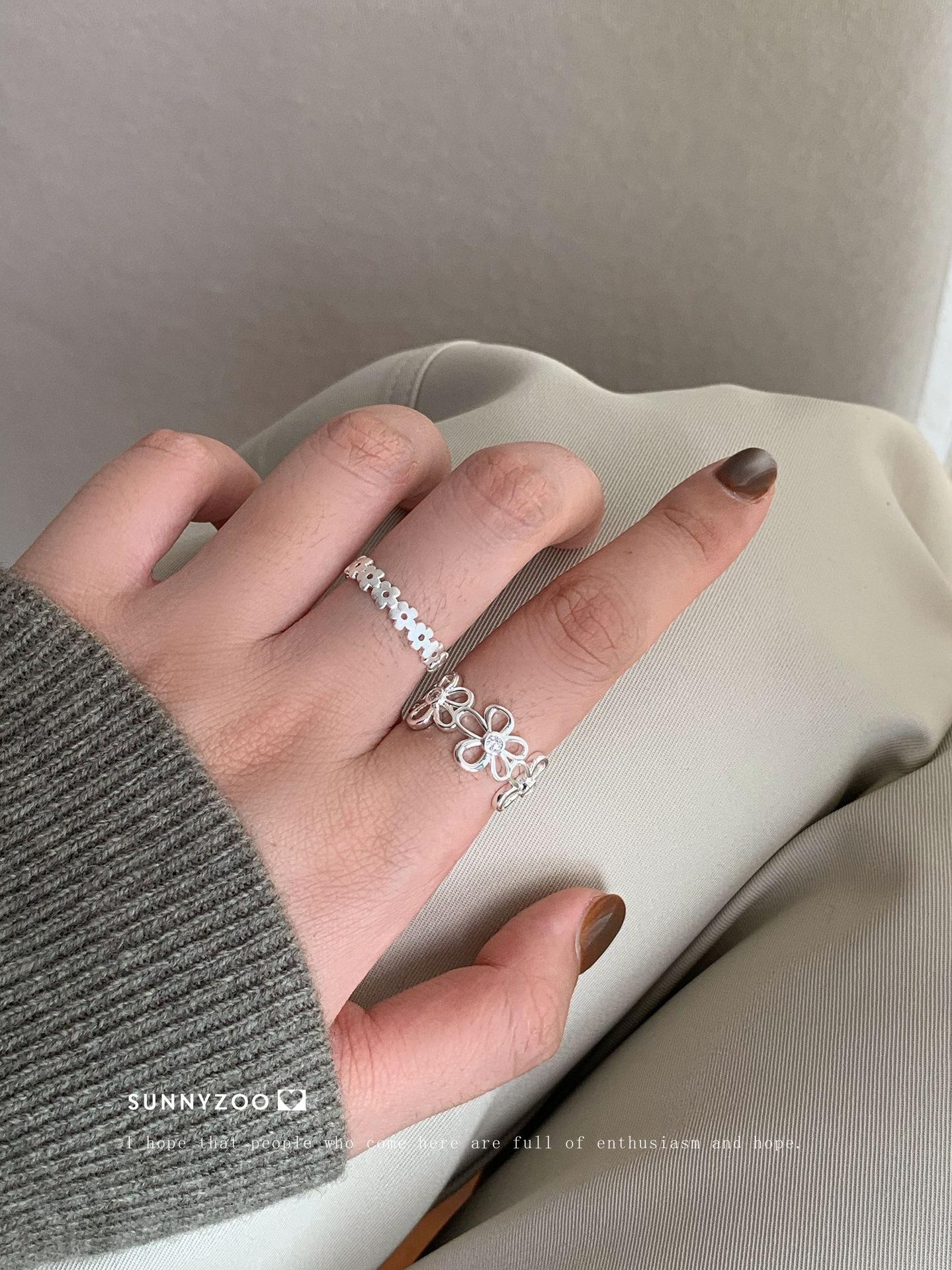 Anillo de flor cepillada hueca para mujer, simple, elegante, de moda, anillo de dedo abierto chapado en plata S925, anillo de dedo de nicho