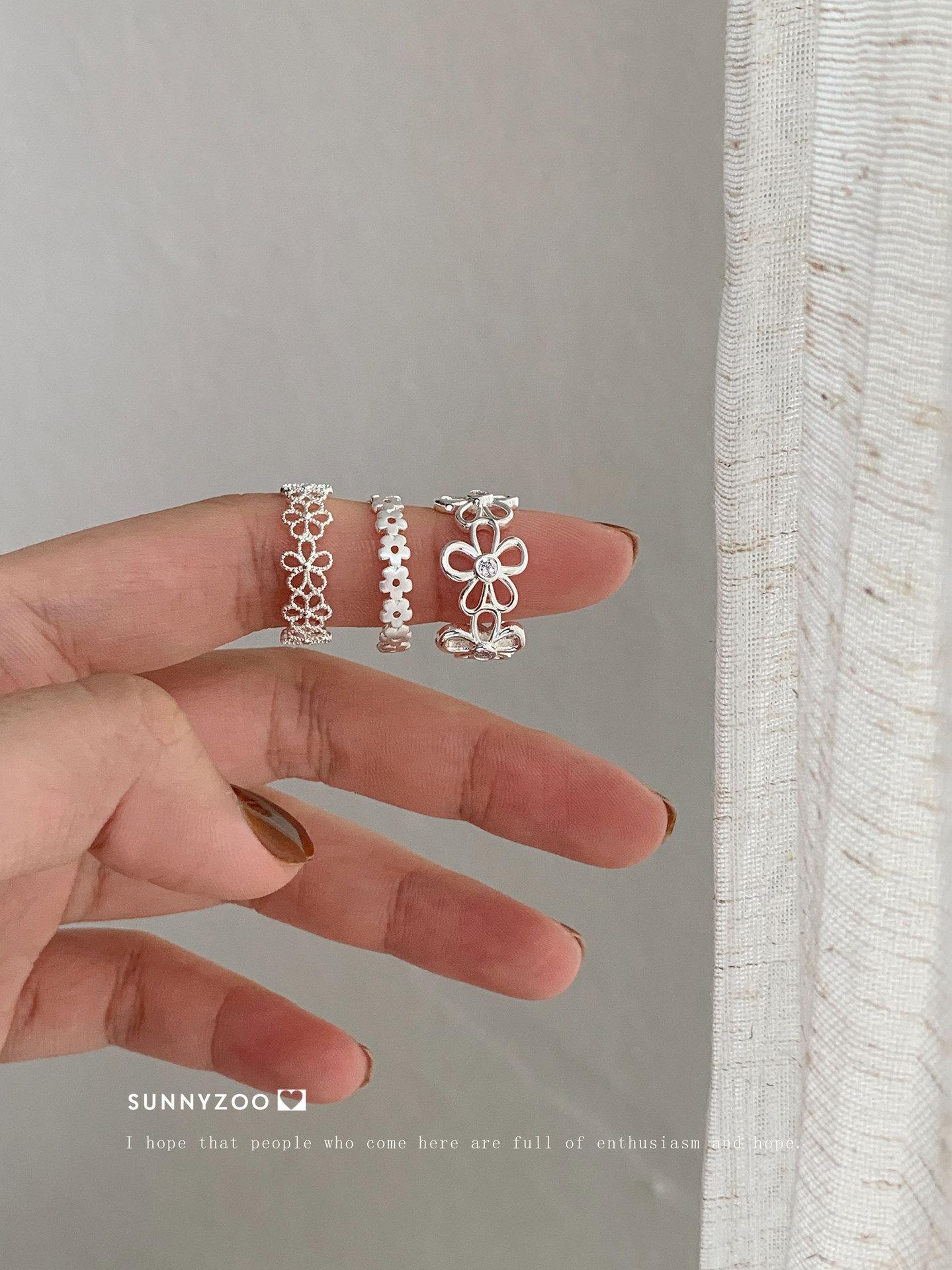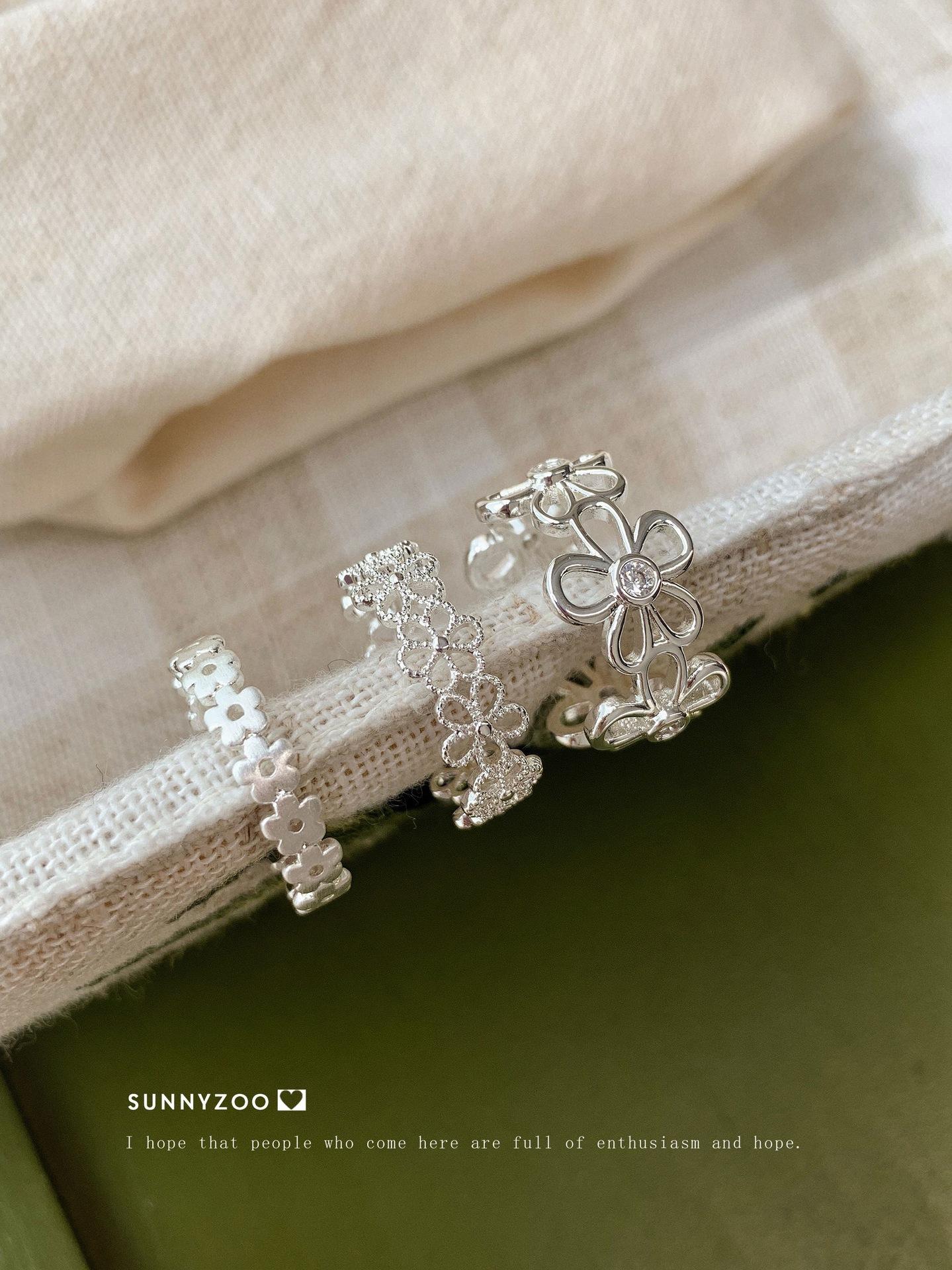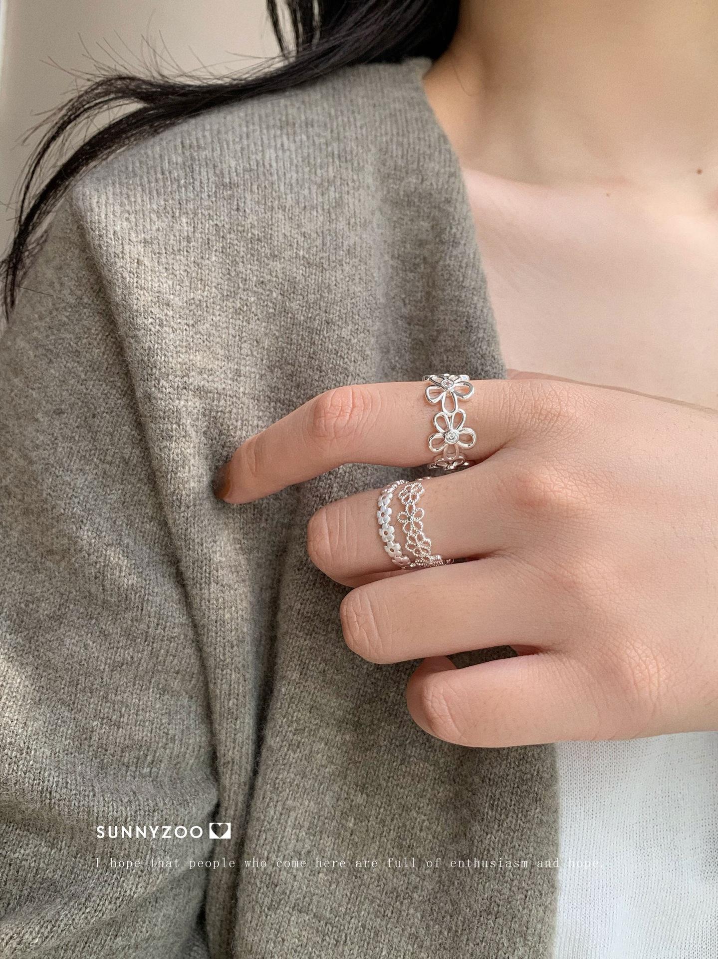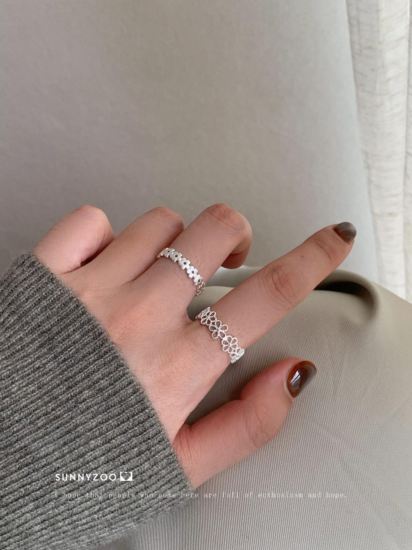 Anillo de flor cepillada hueca para mujer, simple, elegante, de moda, anillo de dedo abierto chapado en plata S925, anillo de dedo de nicho