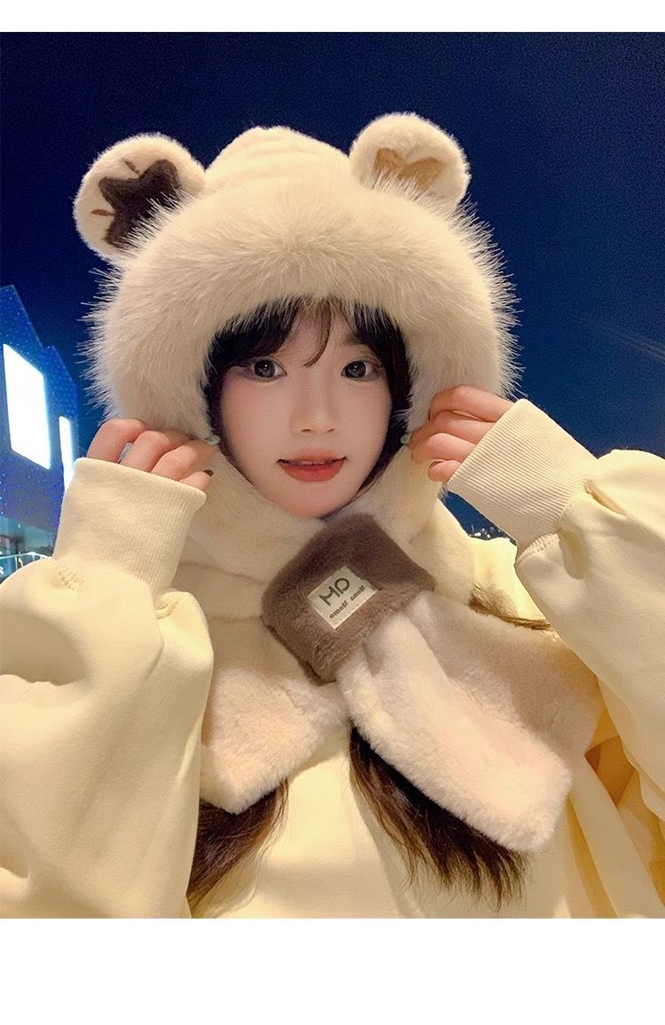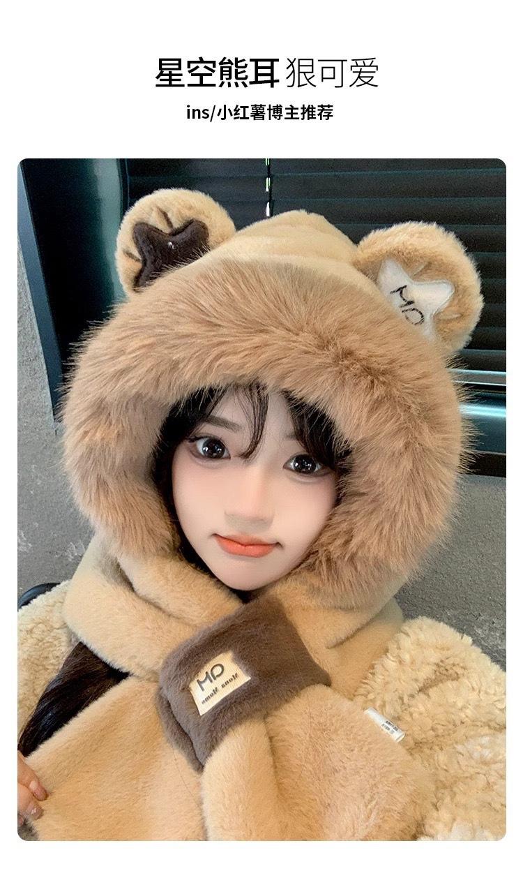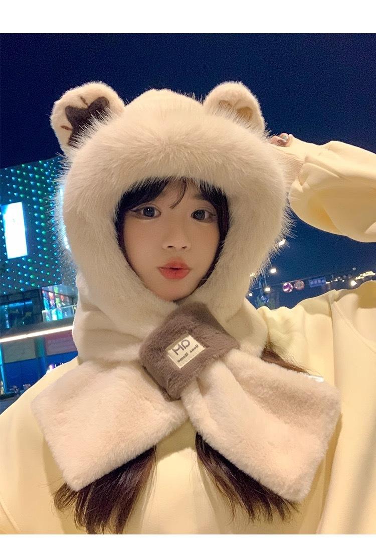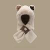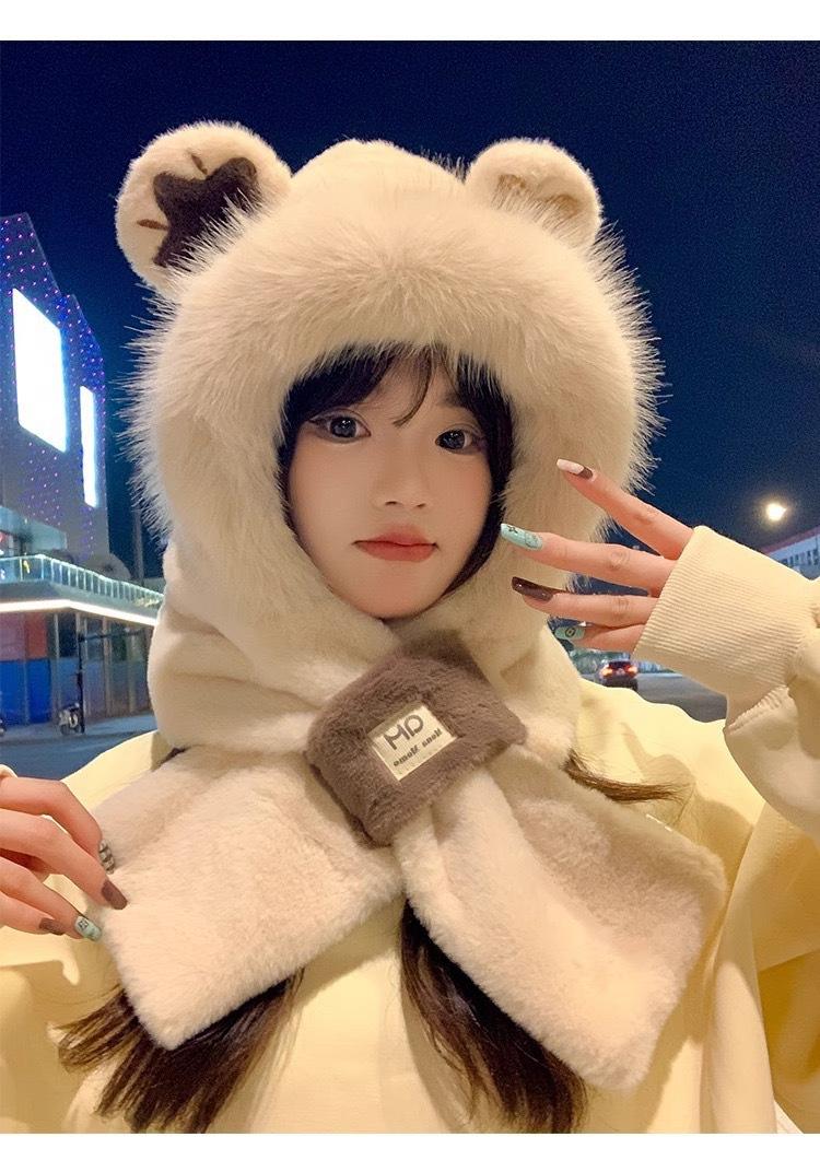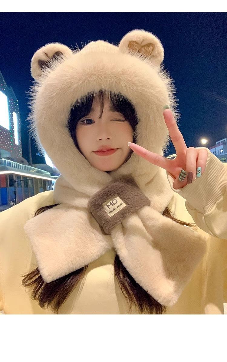 Lindo Gorro de Oso Bufanda Conjunto de Dos Piezas para Mujer Invierno Forrado de Polar Grueso Nuevo Cálido Esponjoso Gorro Bufanda con Capucha