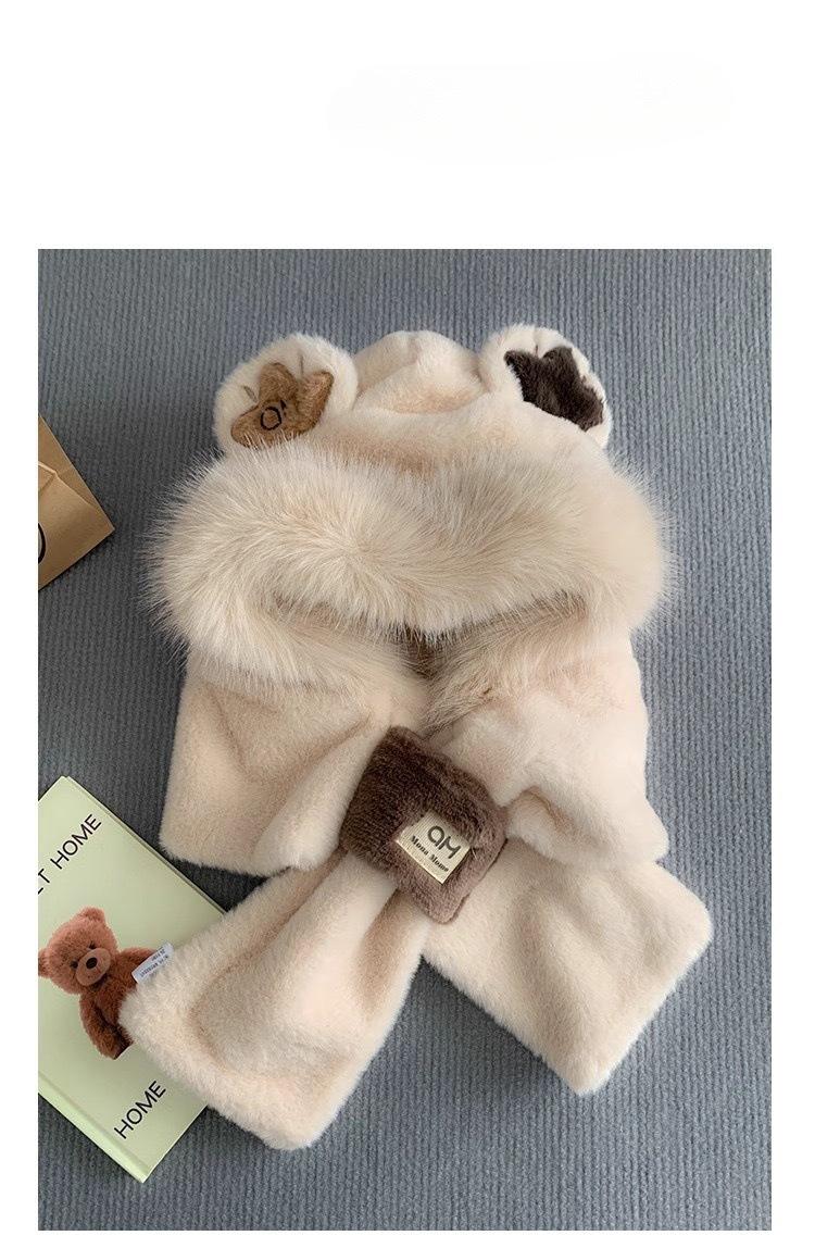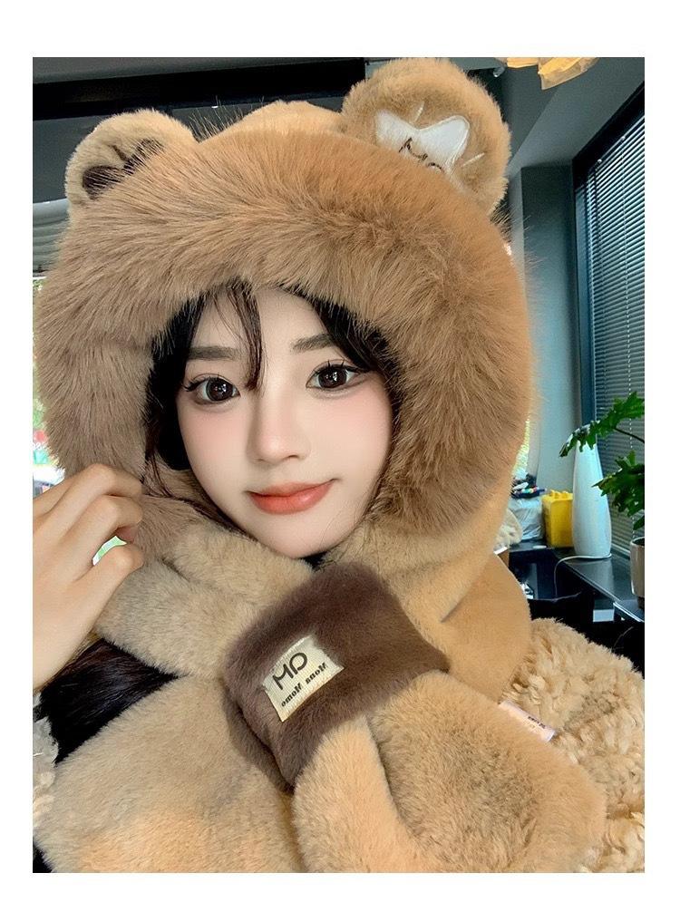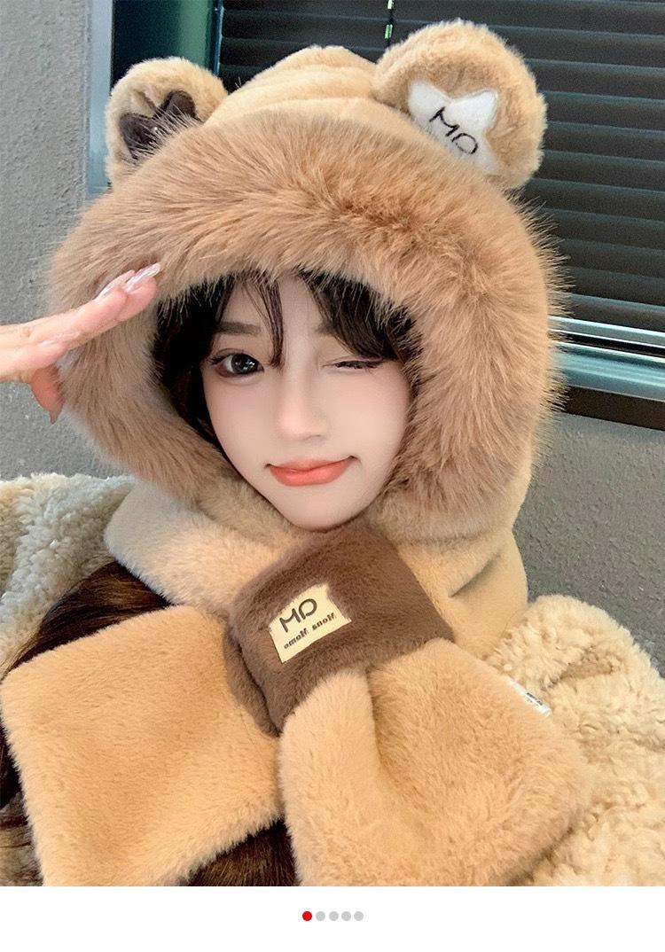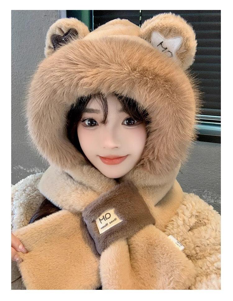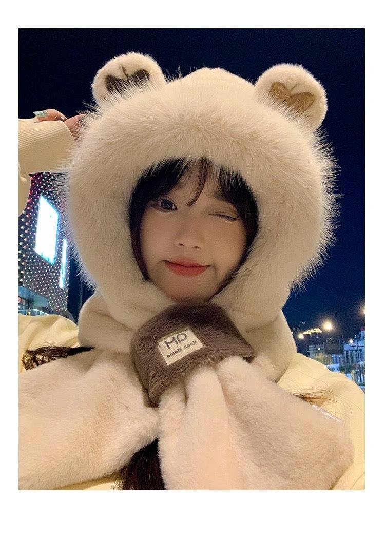 Lindo Gorro de Oso Bufanda Conjunto de Dos Piezas para Mujer Invierno Forrado de Polar Grueso Nuevo Cálido Esponjoso Gorro Bufanda con Capucha