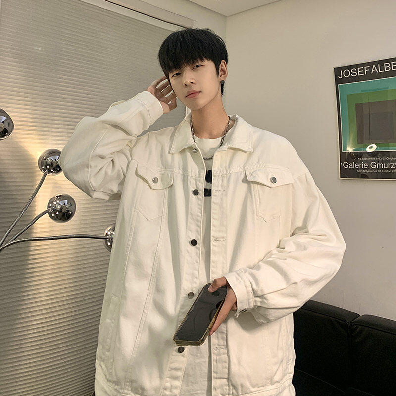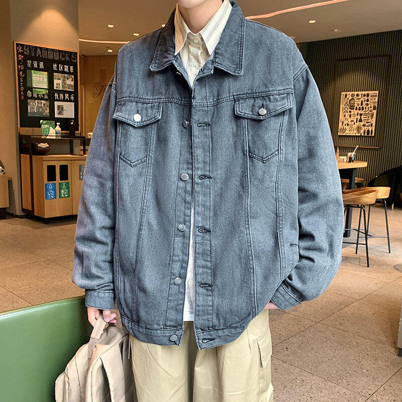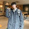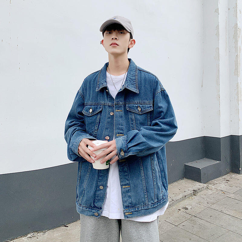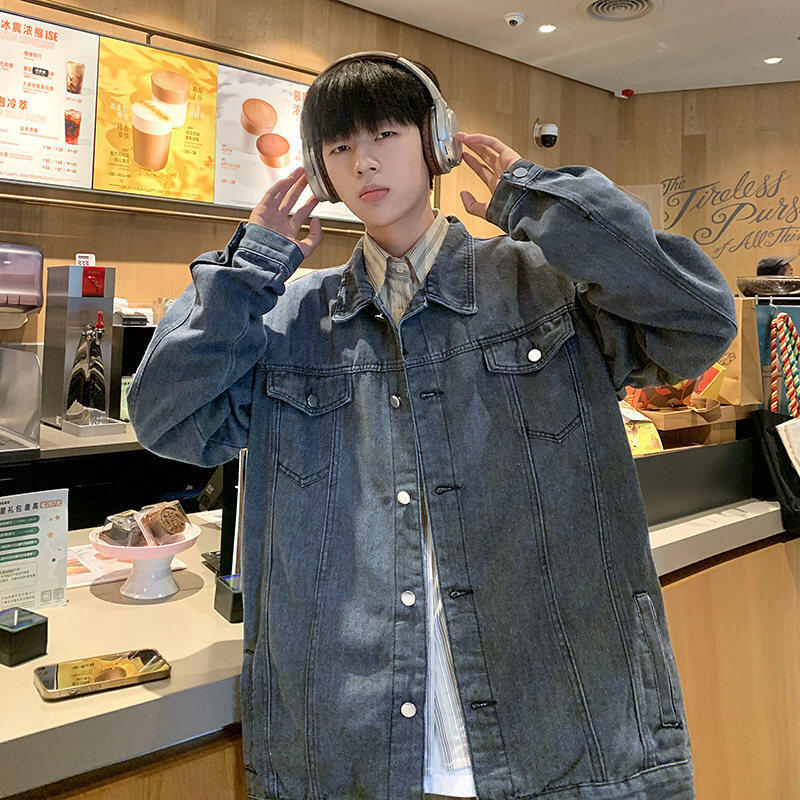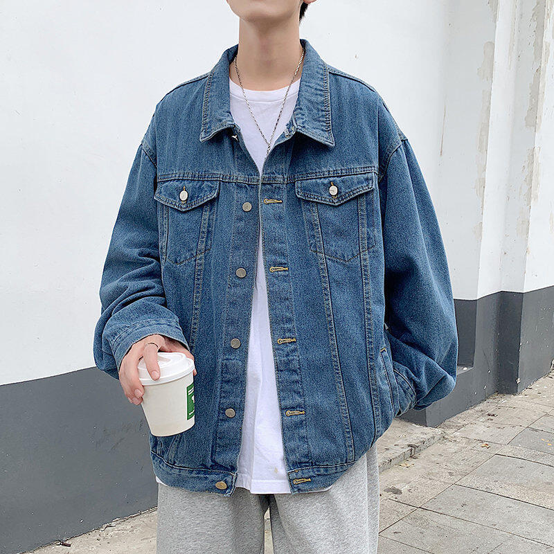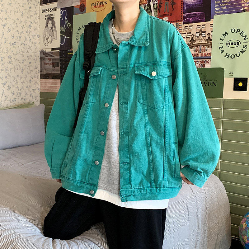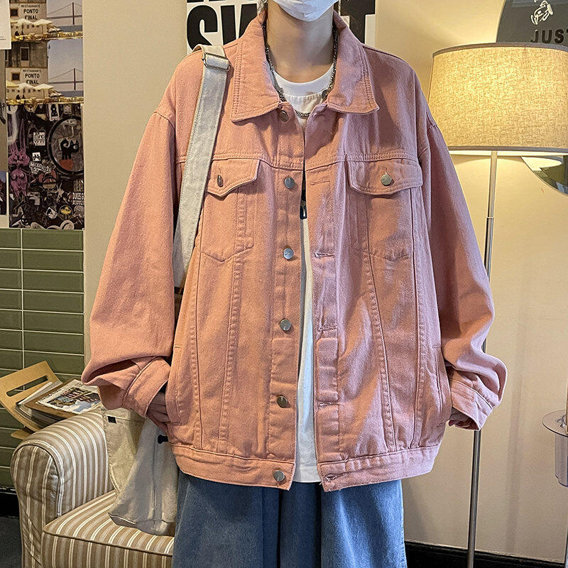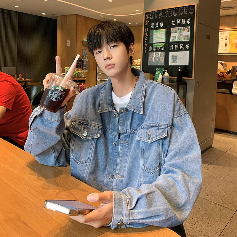 Chaqueta de Mezclilla Nueva de Primavera y Otoño Estilo Hong Kong Unisex Juvenil Color Puro Simple Solapa Sencilla Chaqueta Holgada Top