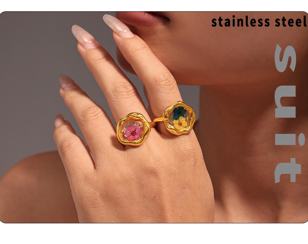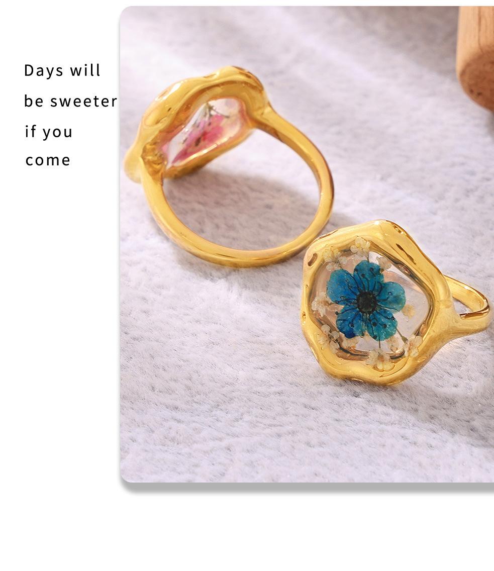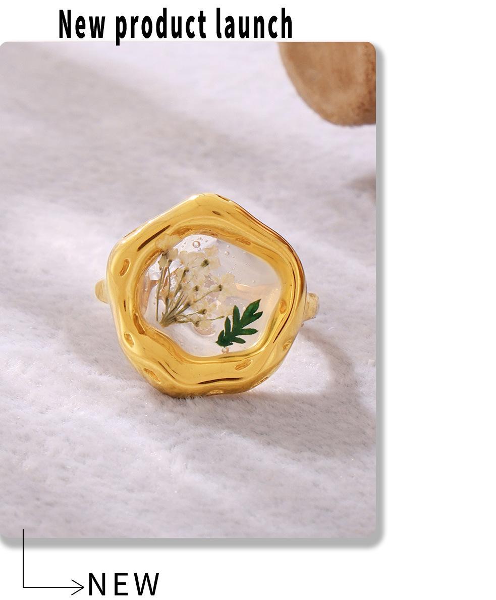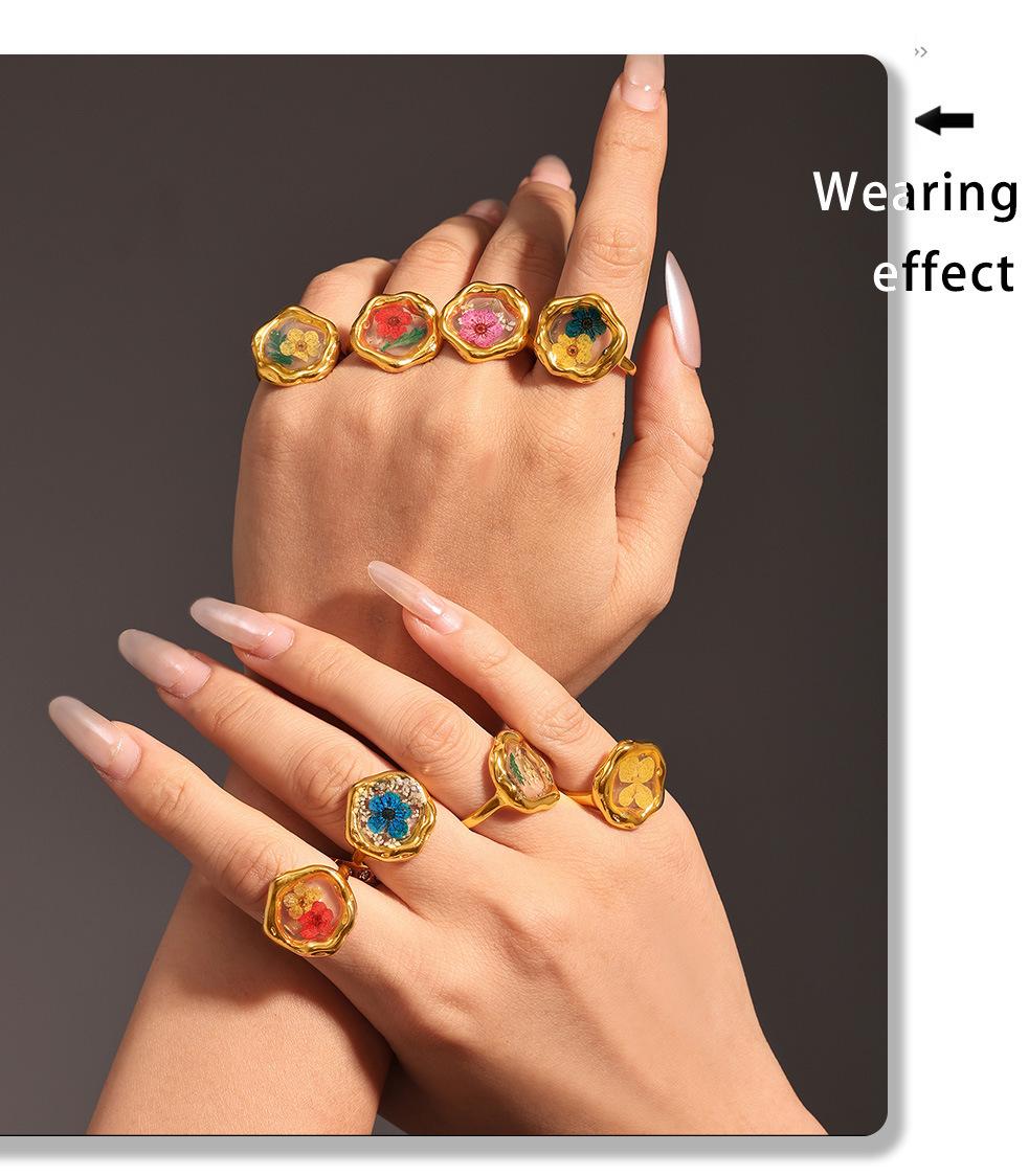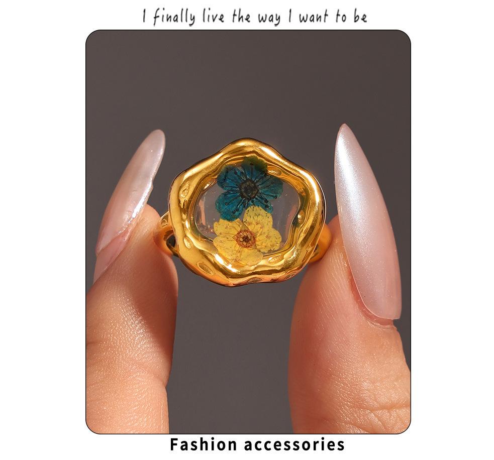 Xinyi Xinmei Anillo de Luz de Flor Seca con Gota de Aceite Xiaozhong Lujo Viento Frío Planta Flor Acero Inoxidable Anillo de Dedo para Mujer