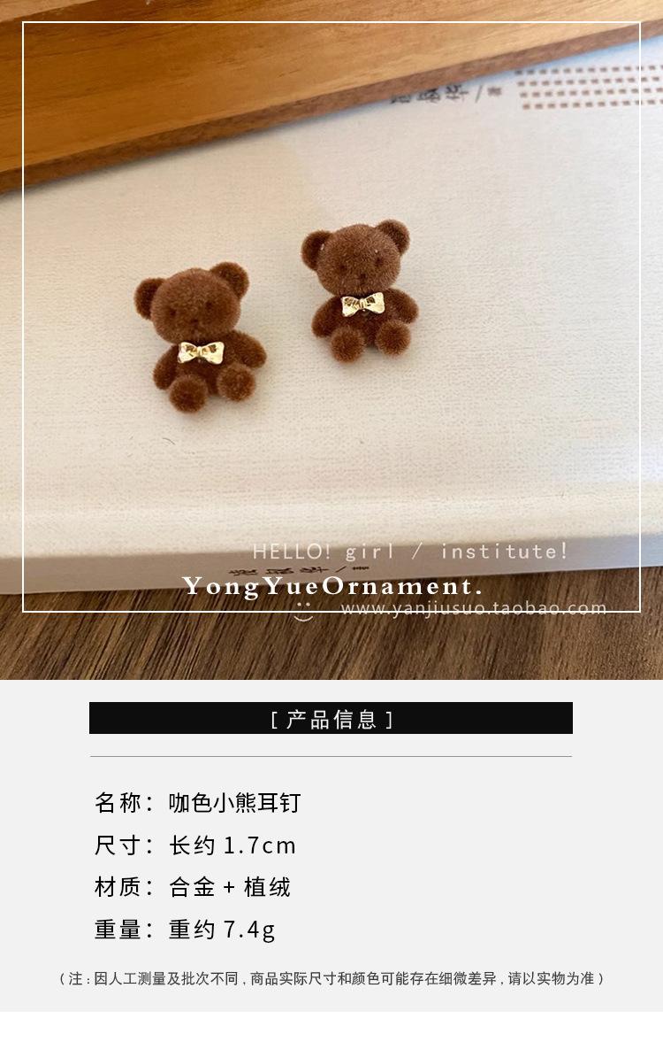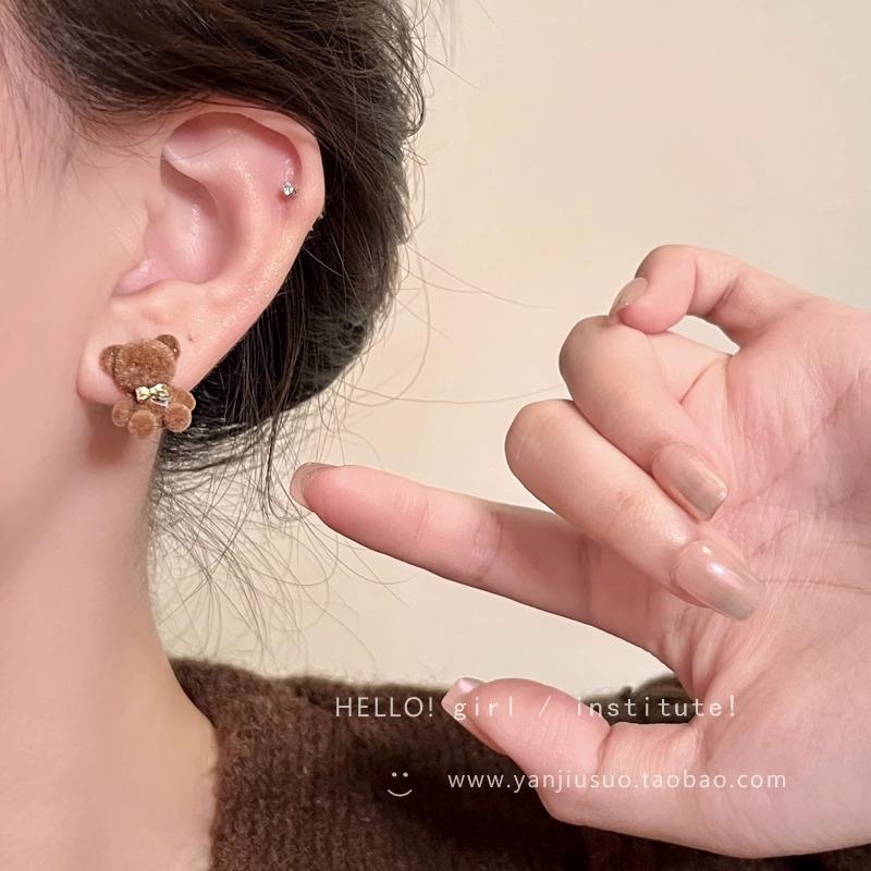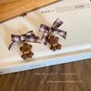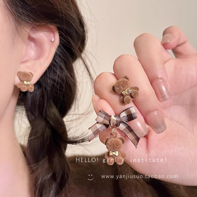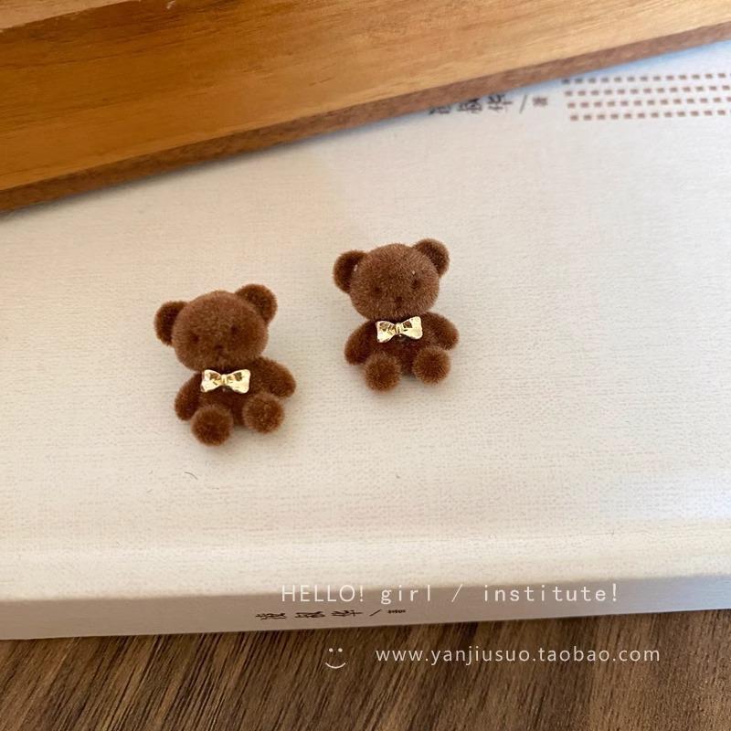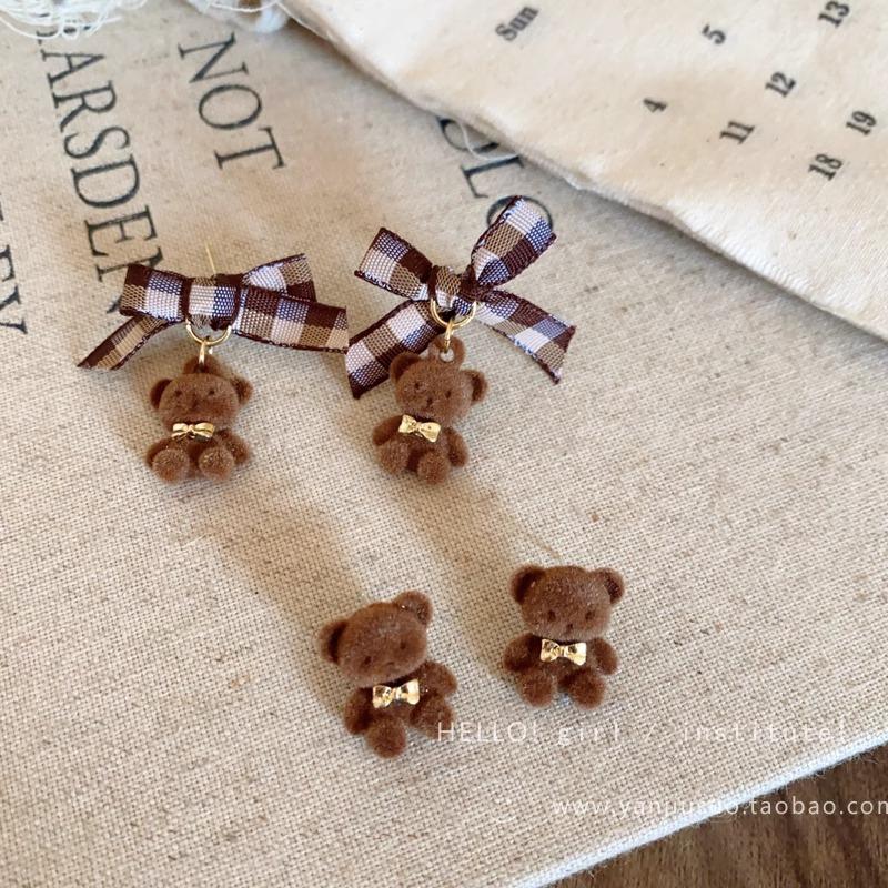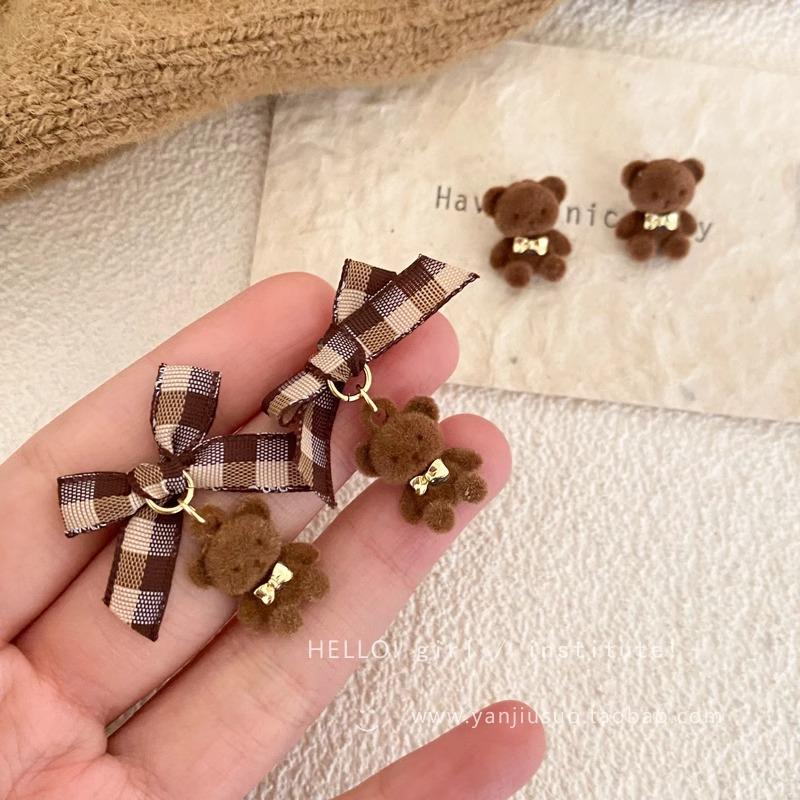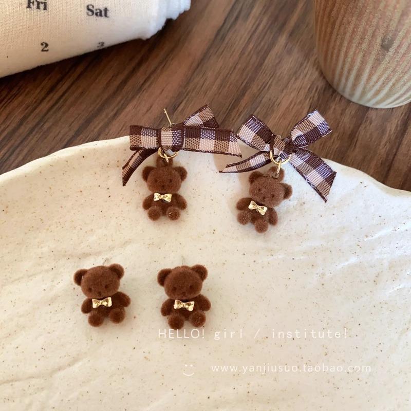 Aretes de oso de peluche con lazo de dibujos animados estilo inglés, dulces, lindos, pequeños, marrones, flocado, femeninos