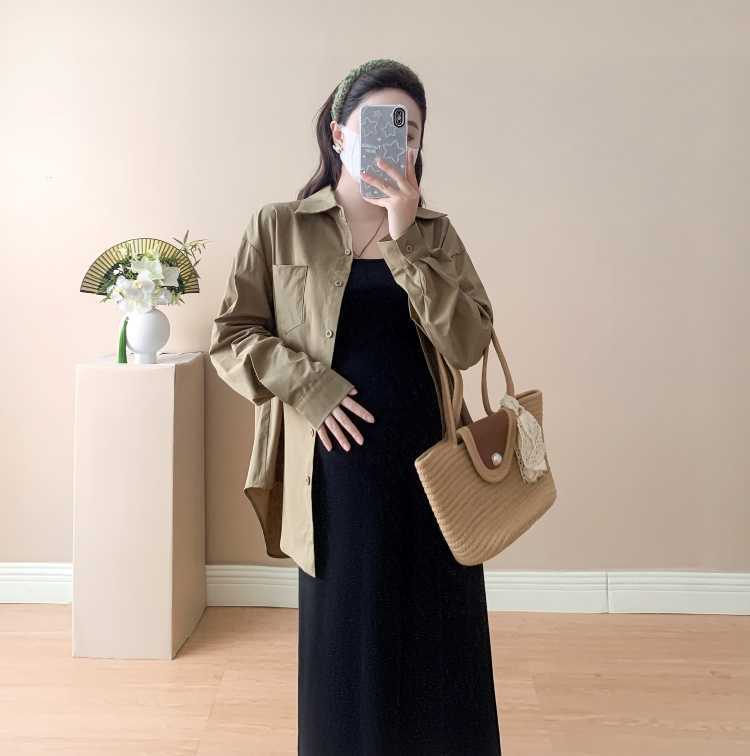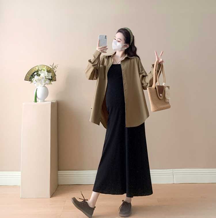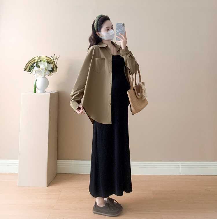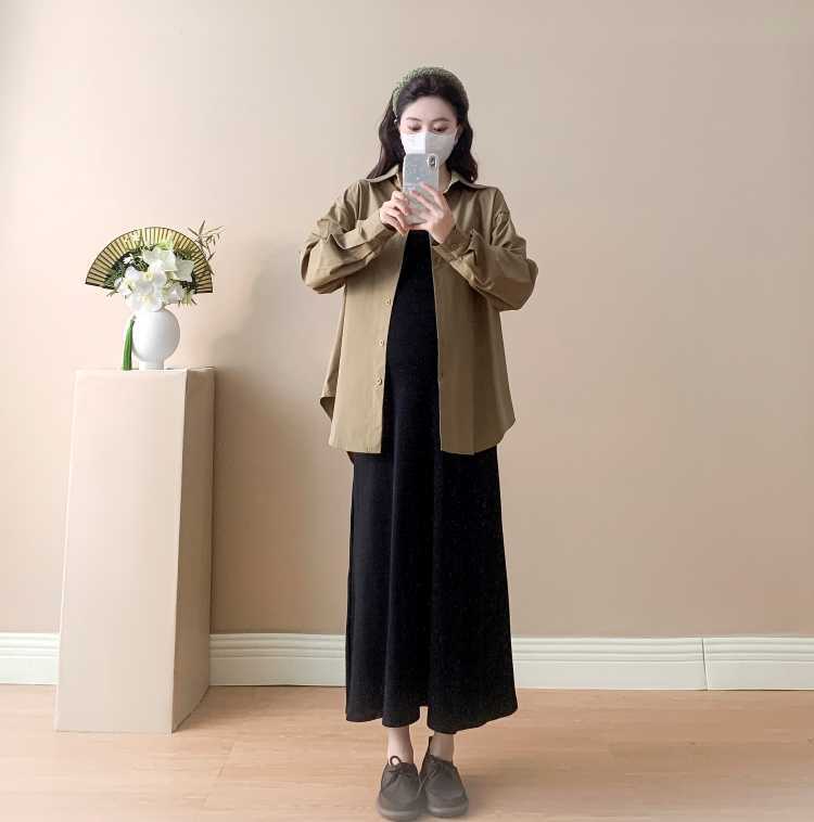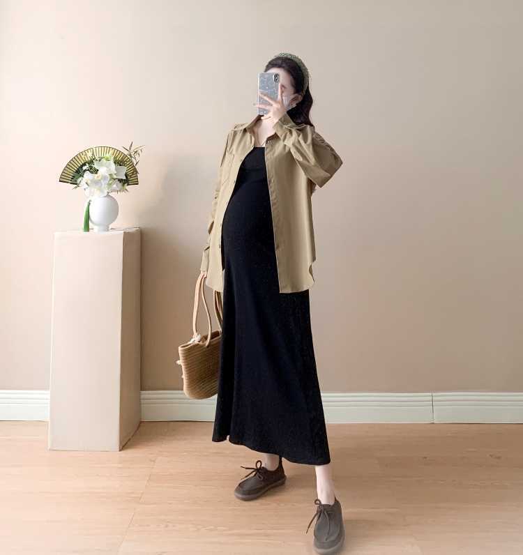 Vestido largo de maternidad de dos piezas, de moda sencilla, de primavera 2025, con camisa de manga larga, ajustado y elástico, para embarazadas, con tirantes.