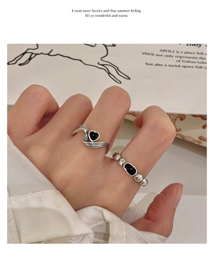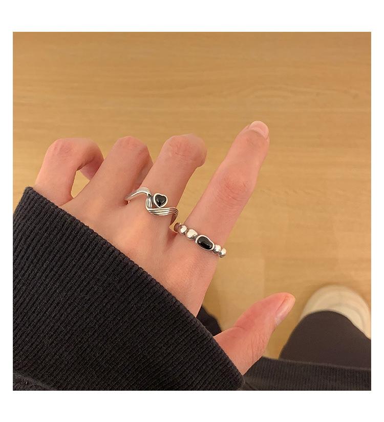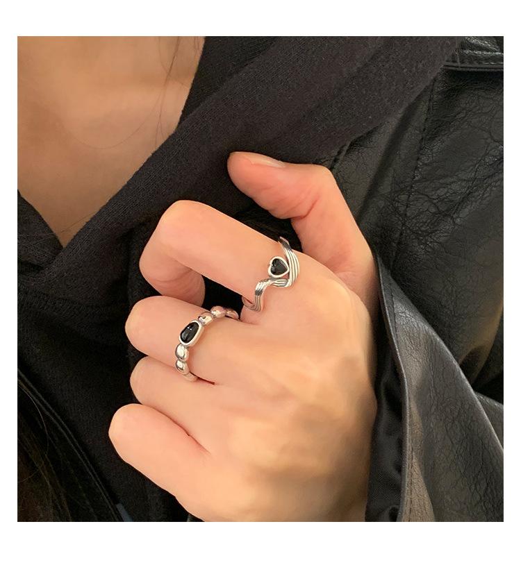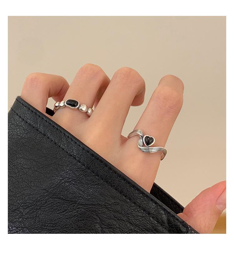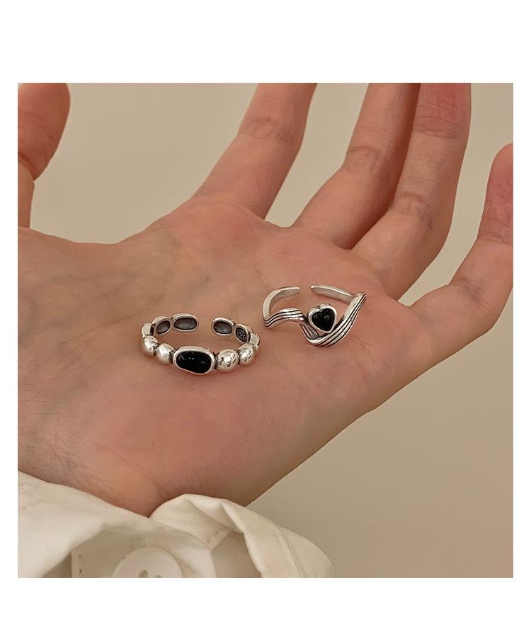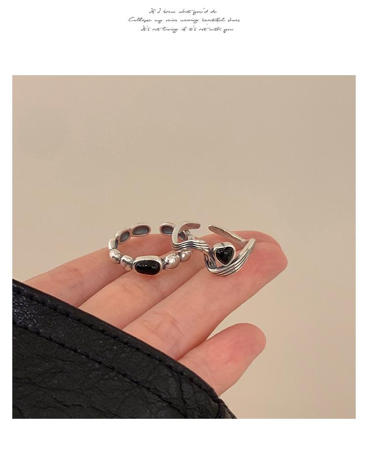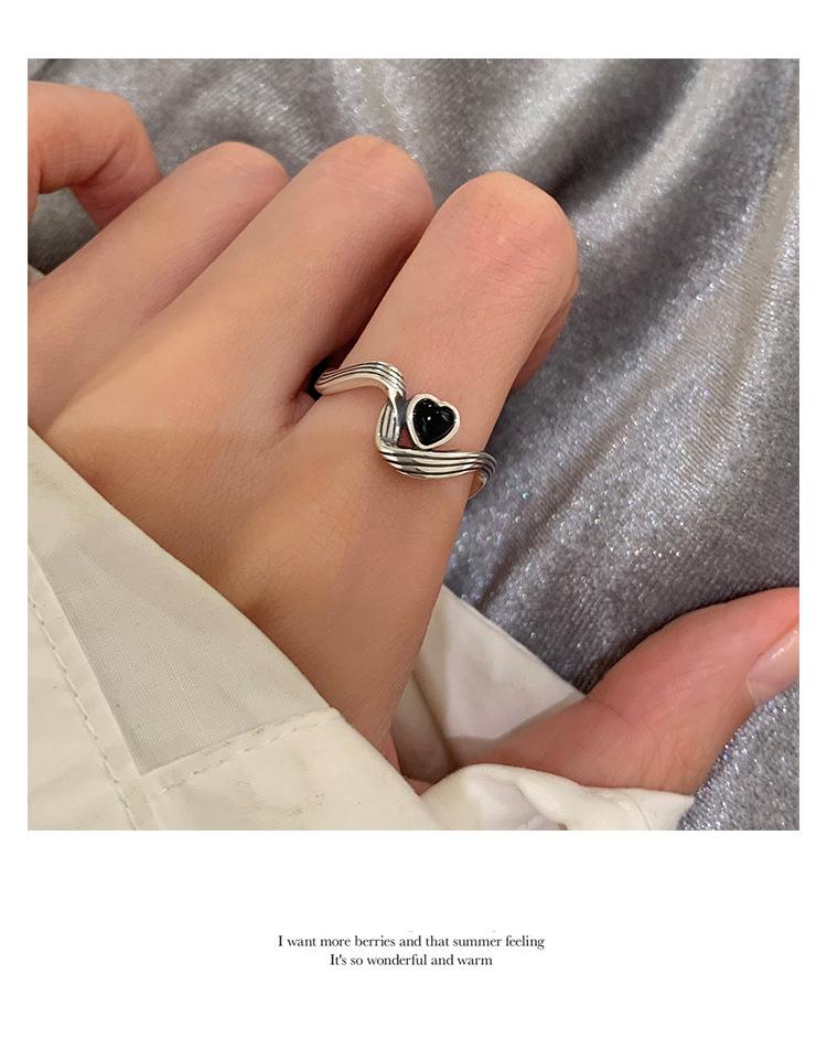 Anillo de Corazón Negro para Mujer Anillo Abierto Sencillo Geométrico de Onda Plateado en Plata S925 Estilo Ins Anillo para el Dedo Índice Moderno