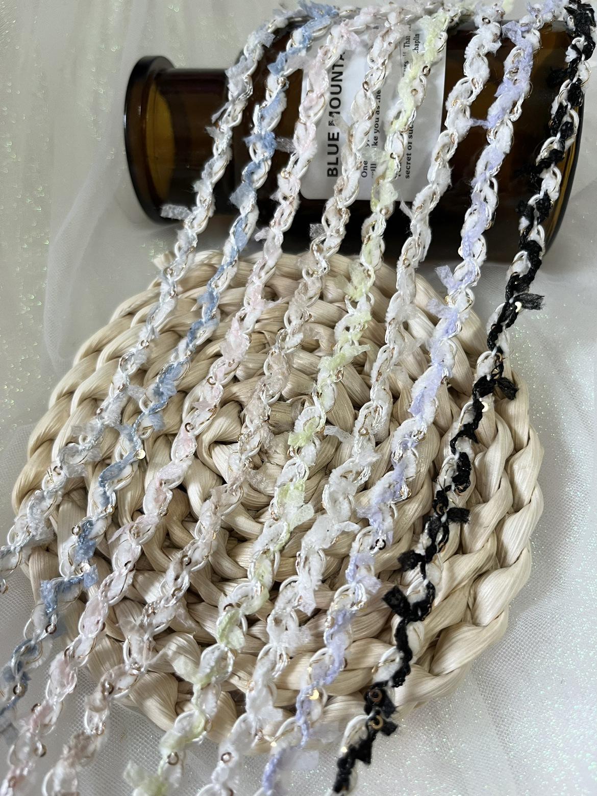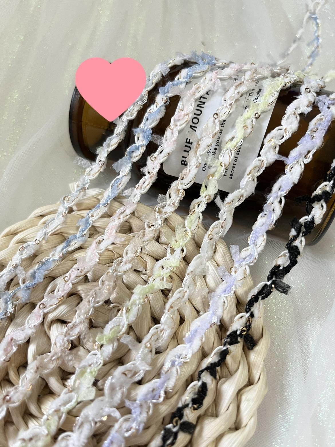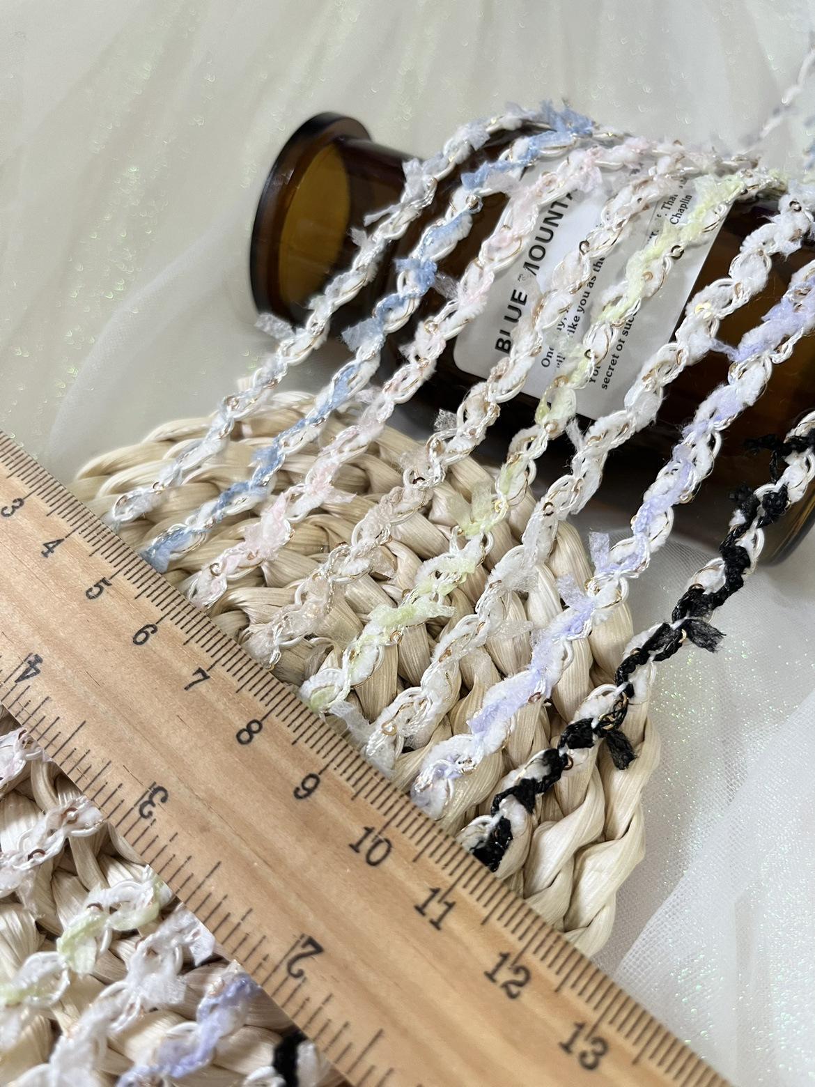 Mini cinta de encaje de 0,5 cm, color azul claro, amarillo y blanco, con borde sin rematar, con palabras de papel y un aroma a viento.