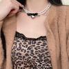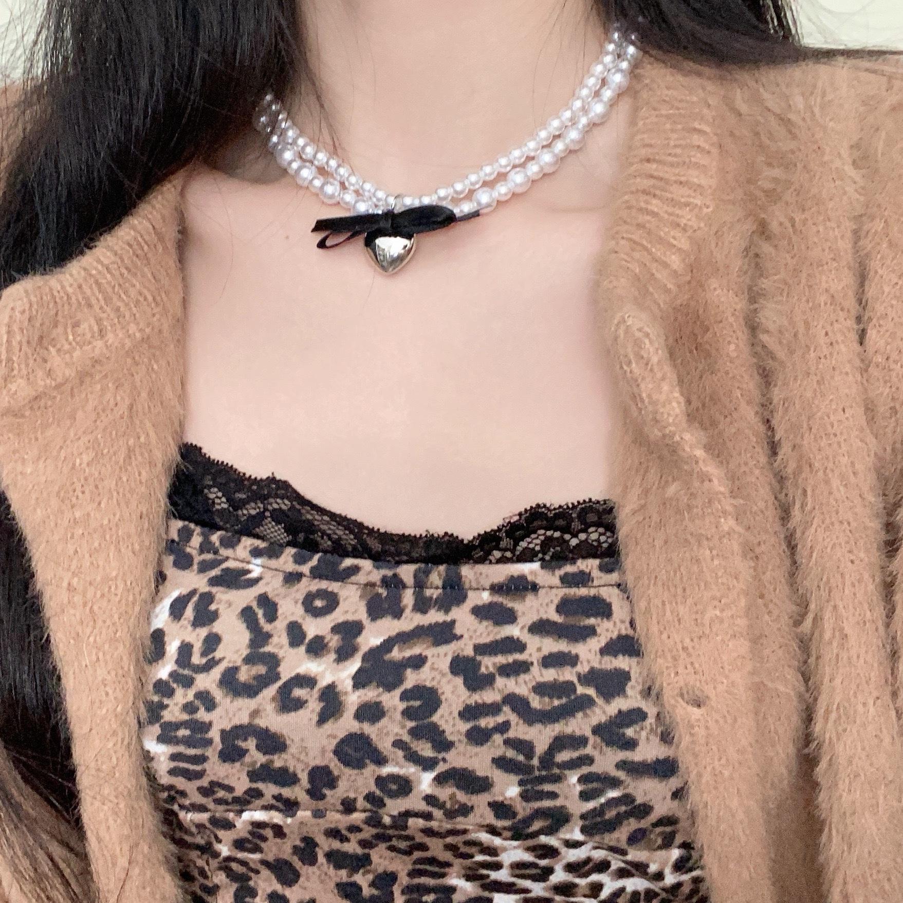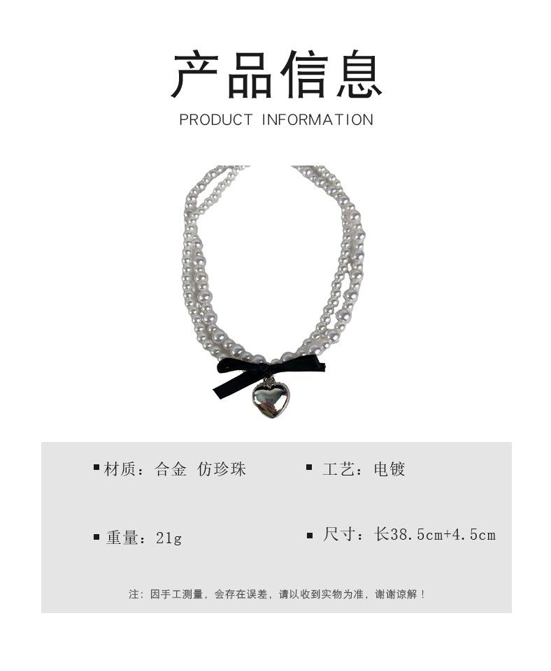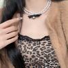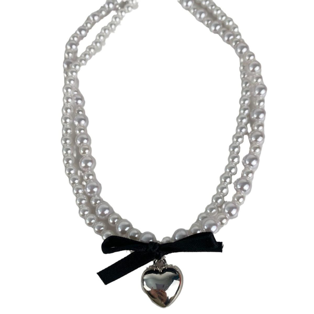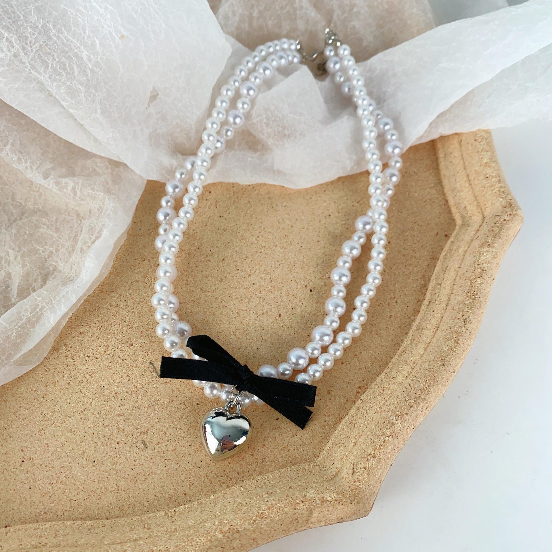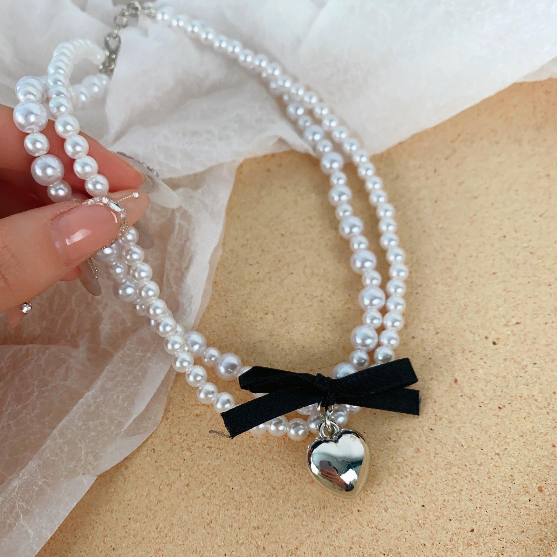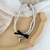 Collar de perlas con colgante de corazón de amor de lujo ligero con lazo negro, cadena de clavícula superpuesta de doble capa, collar con personalidad de moda que combina con todo.