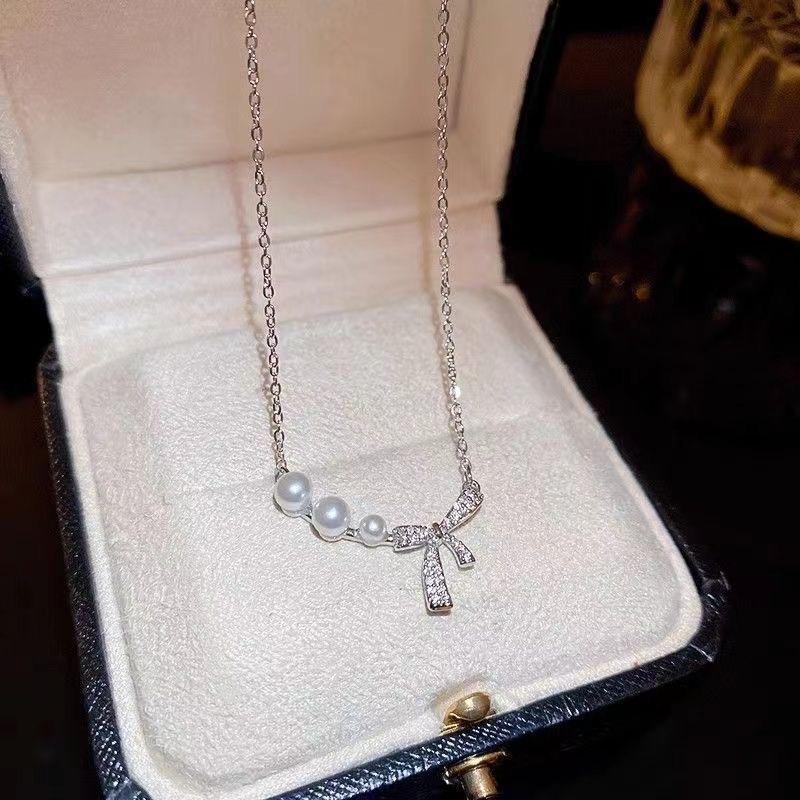 Collar de Perlas Diamante Flash Lazo 2025 Nueva Llegada Popular Moda Lujo Ligero Nicho Elegante Cadena Clavícula Collar Accesorios para Mujer