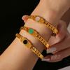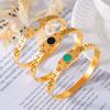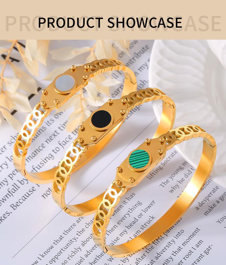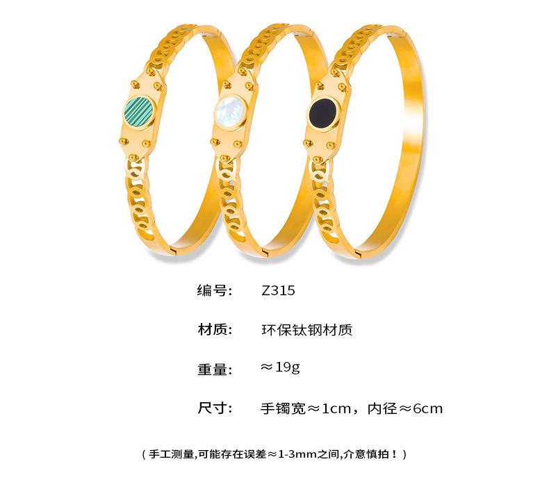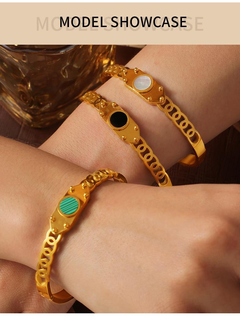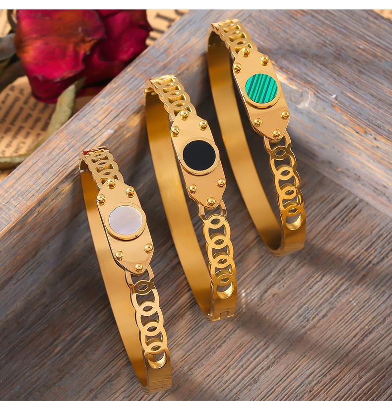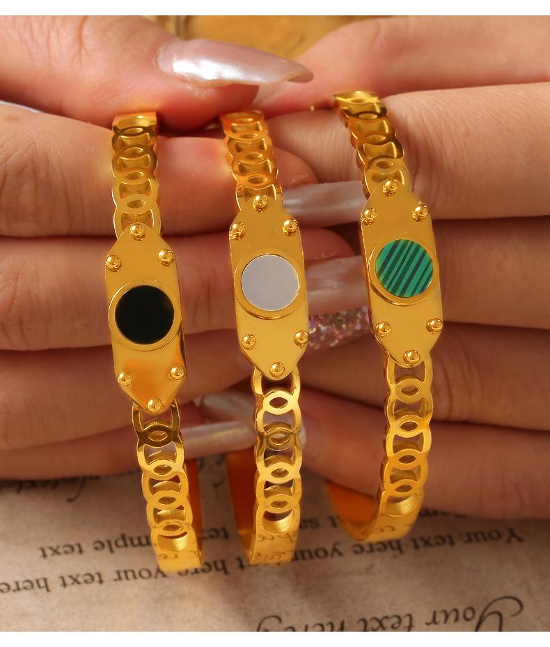 Pulsera francesa de acero de titanio con incrustaciones de malaquita concha blanca viento chic geométrica redonda acrílica para mujer chapada en oro de 18k