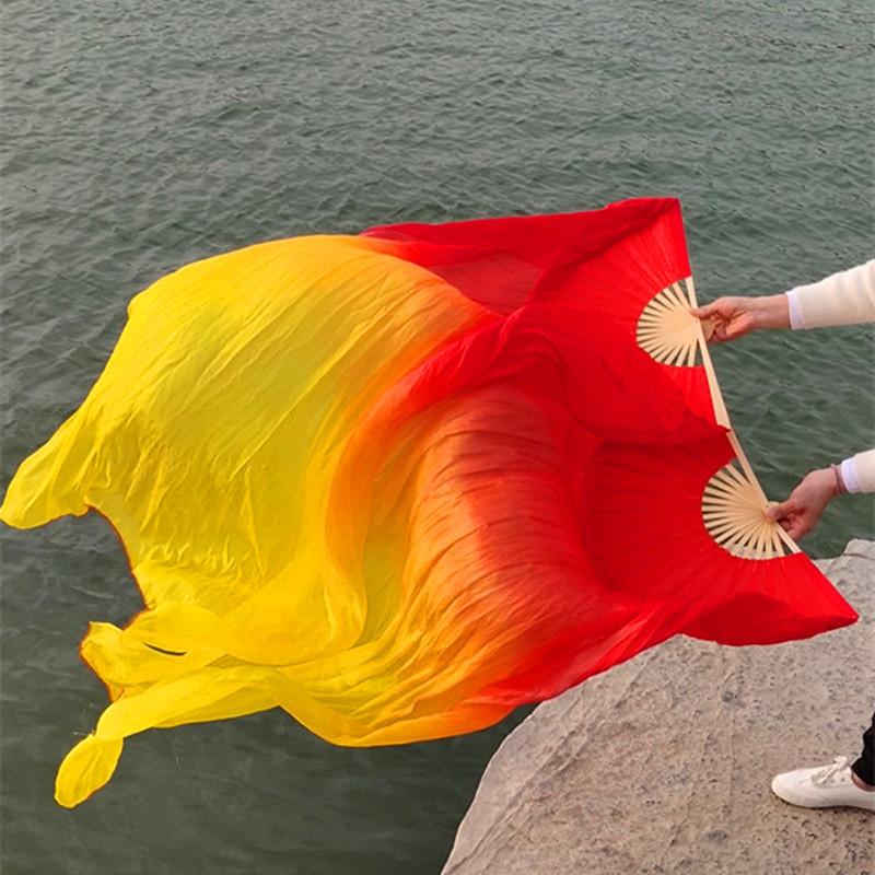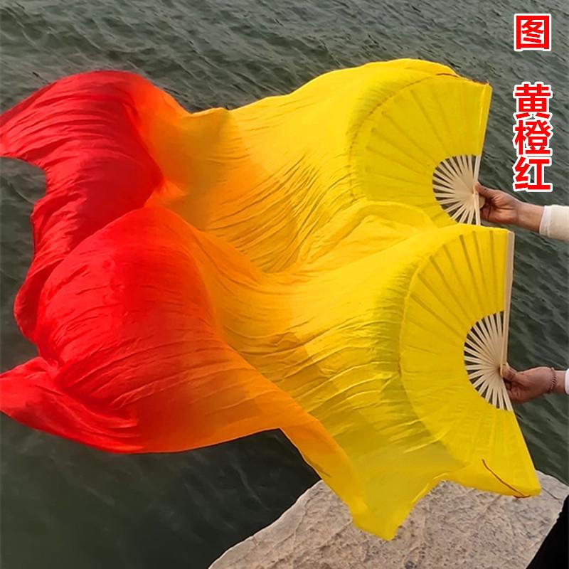 Abanico de baile de tres colores degradados, largo, de seda, con llamas, de seda de doble cara, para niños, cuadrado, de colores, largo