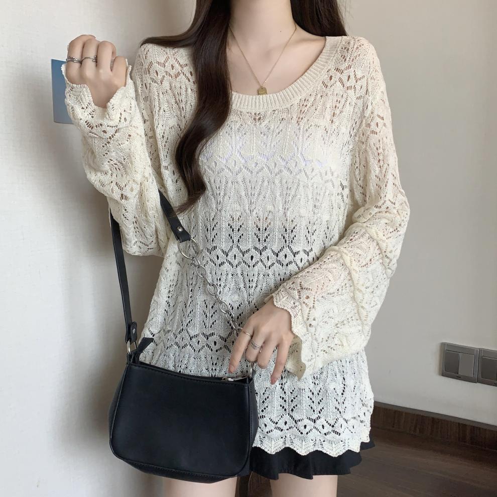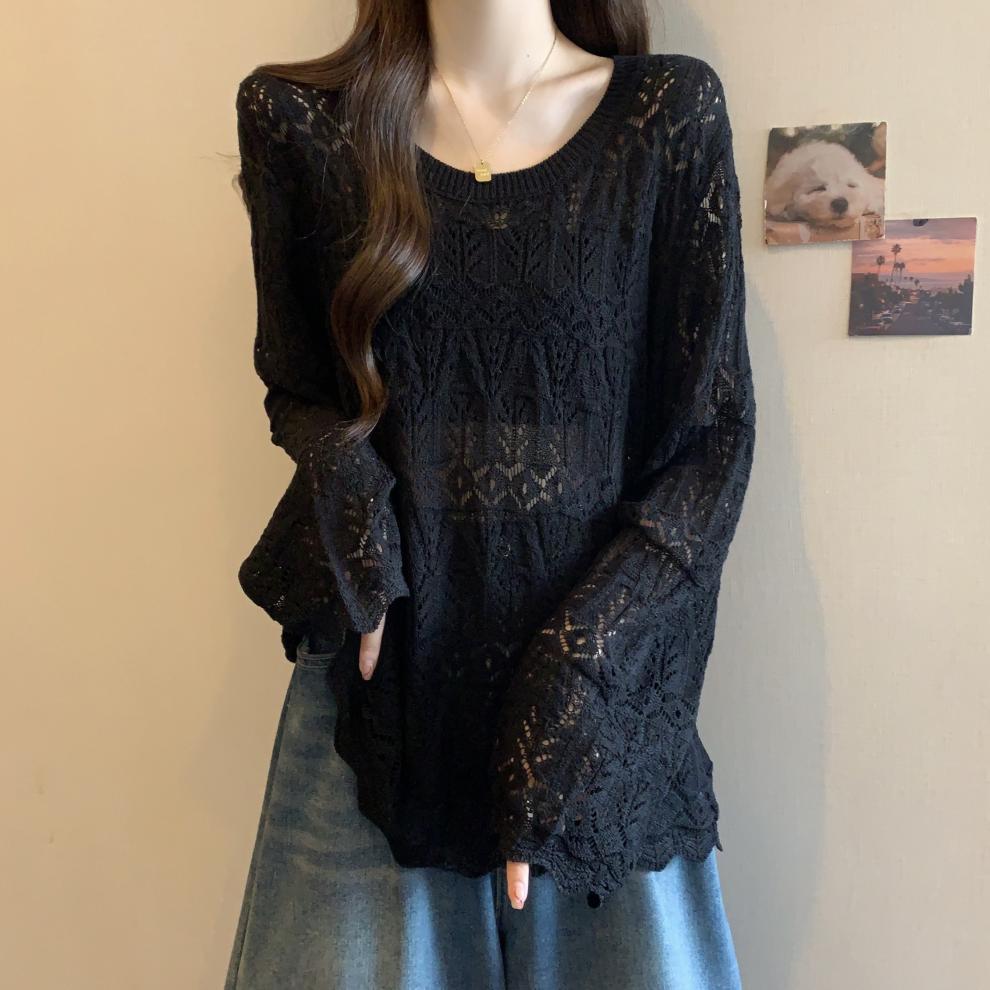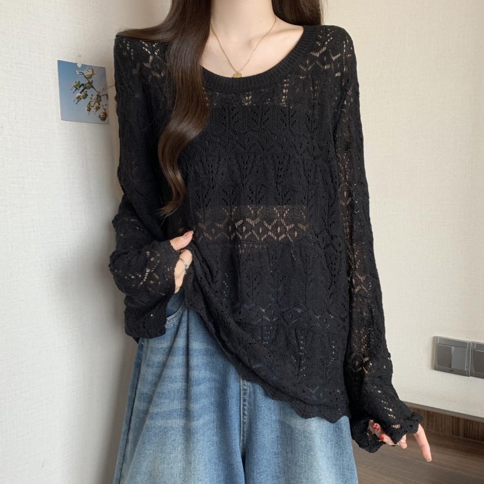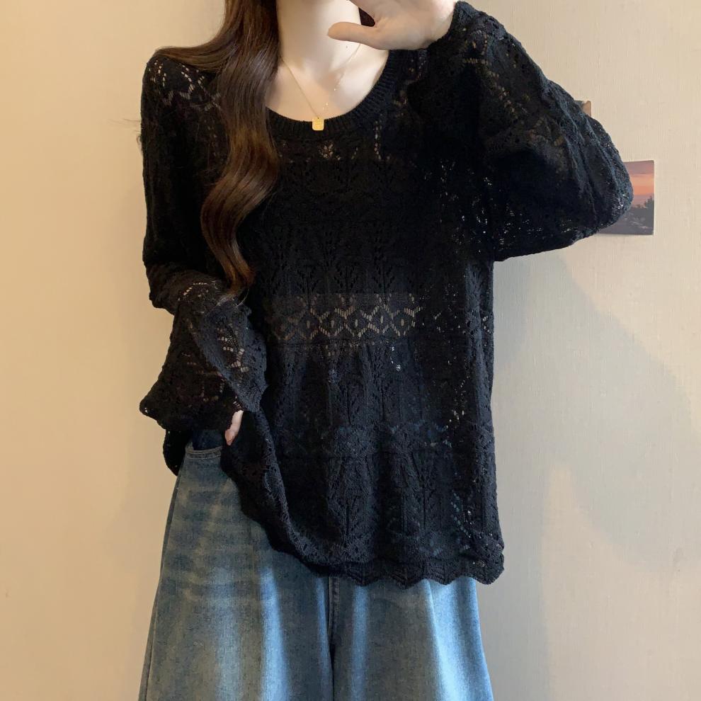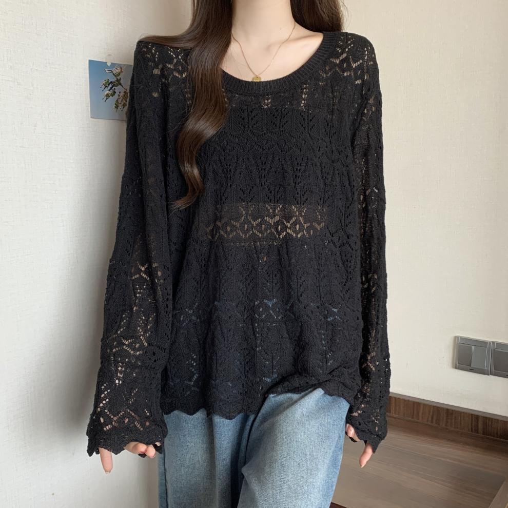 Suéter de manga larga con cuello redondo y aberturas para chica gordita, talla grande, holgado, adelgazante, camisa pequeña elástica para mujer, otoño nuevo